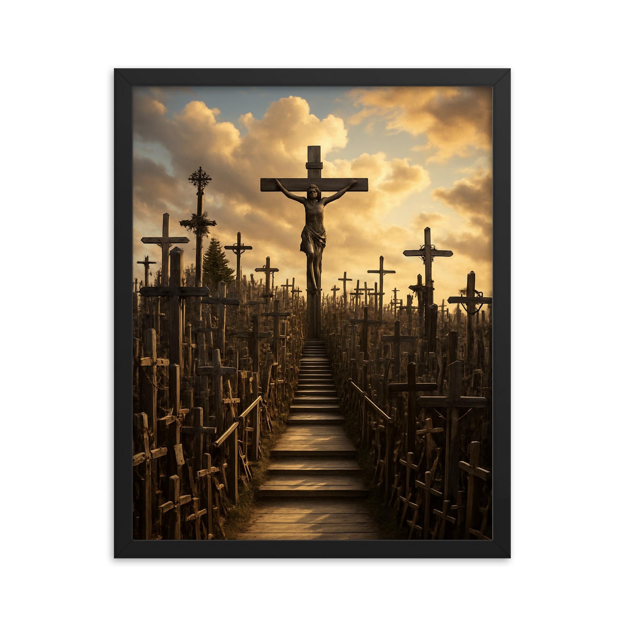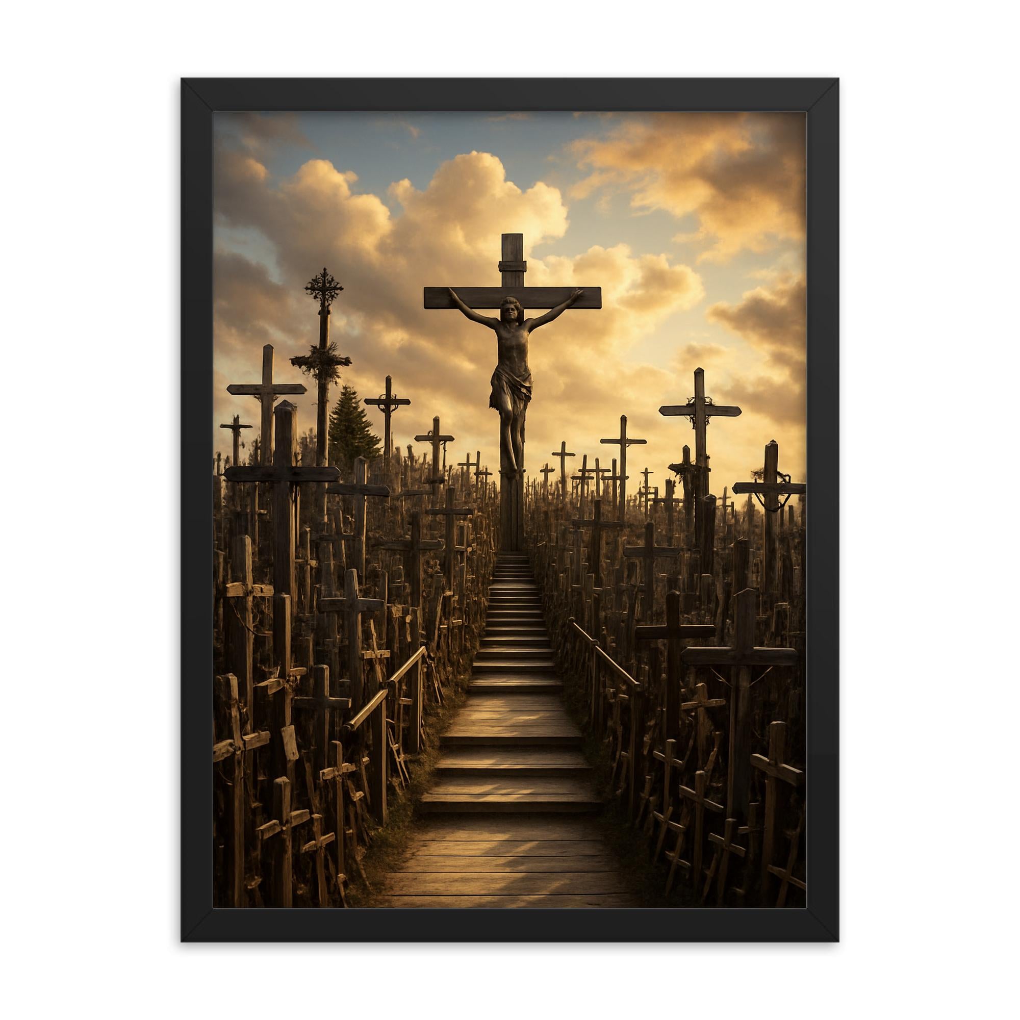 Discover the timeless power and serene beauty of the Hill of Crosses in Lithuania with this stunning framed print – a captivating piece of wall art that transforms any space into a sanctuary of history and hope.