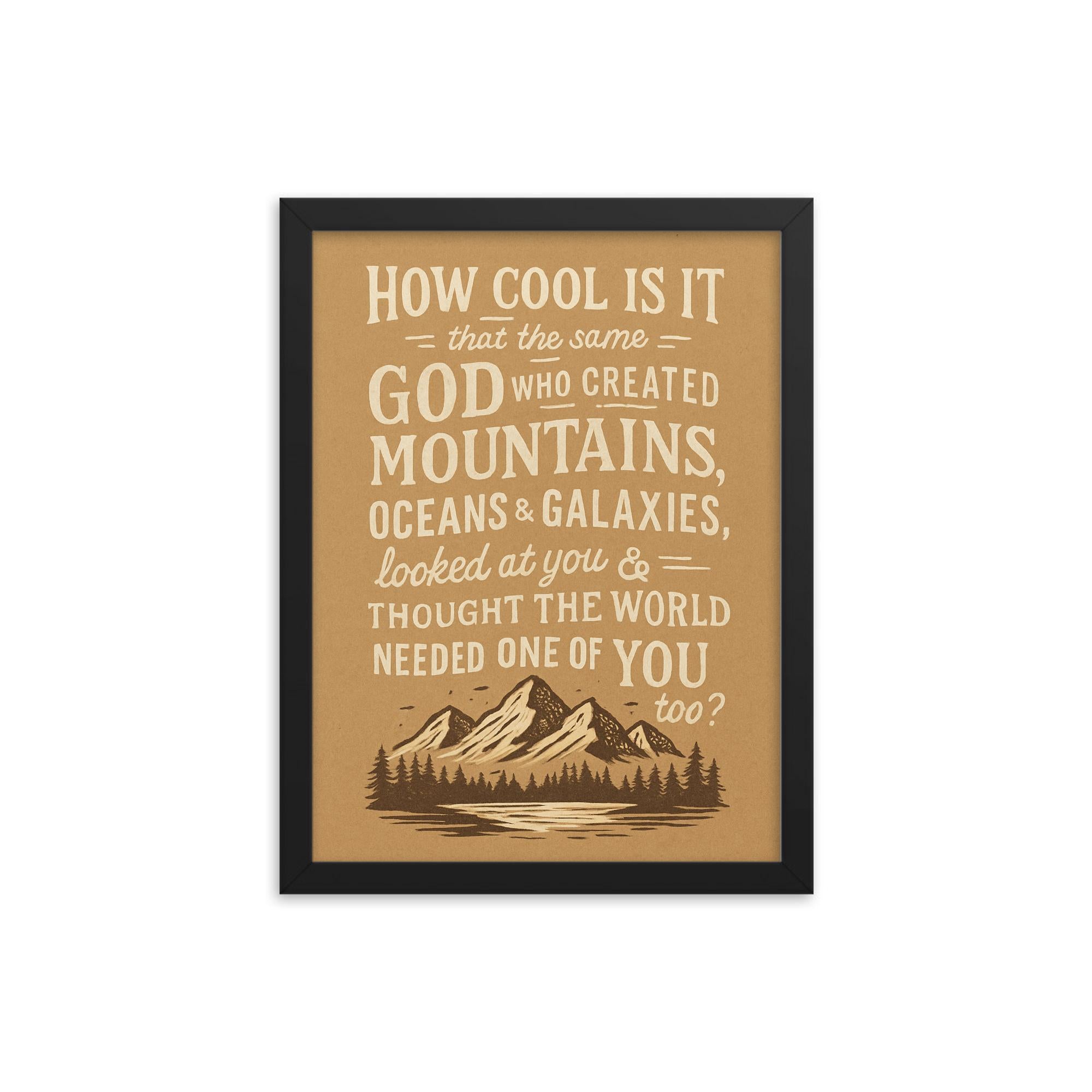 Elevate your space with a heartfelt reminder of your one-of-a-kind worth. This beautifully crafted framed print features the uplifting message: How cool is it that God thought the world needed one of you