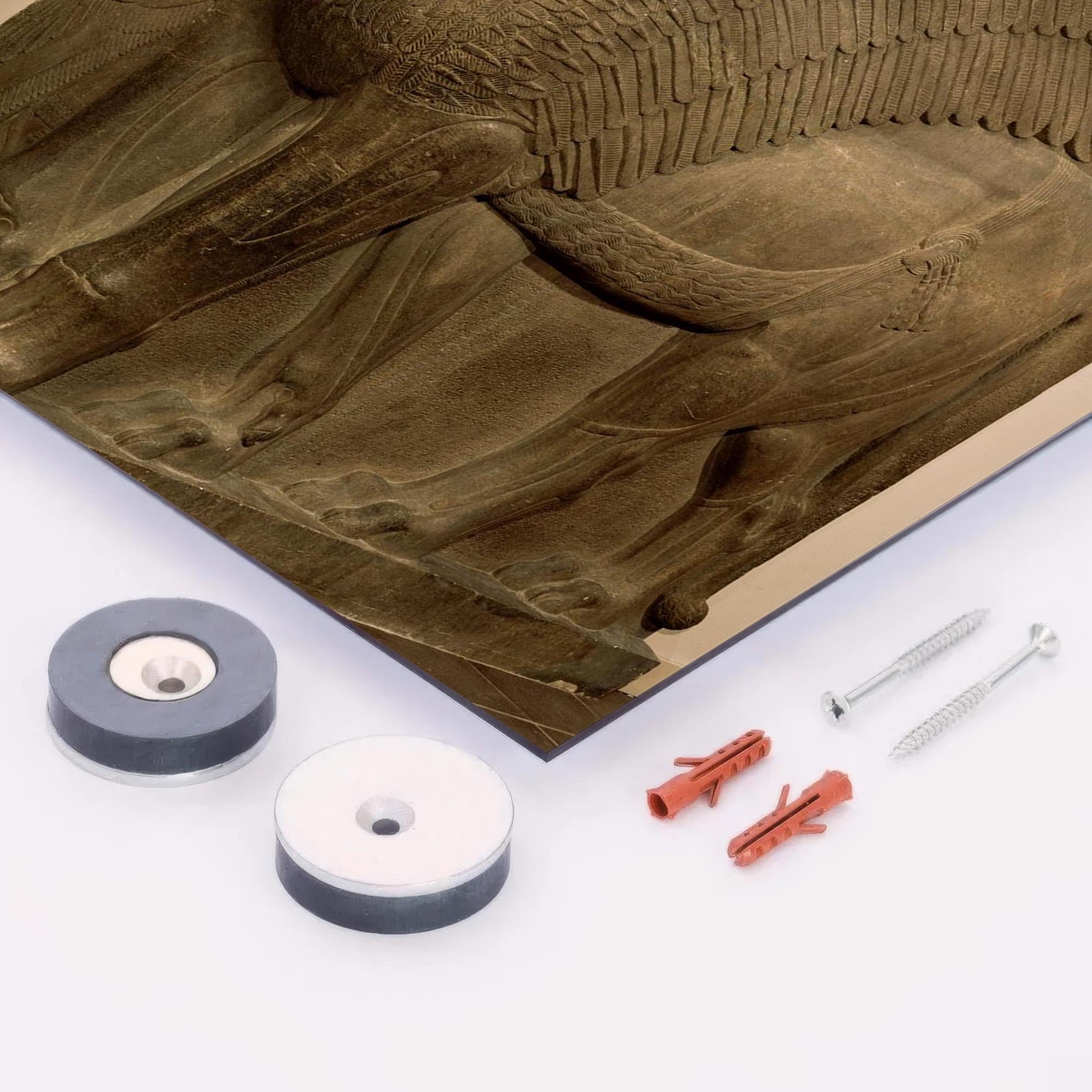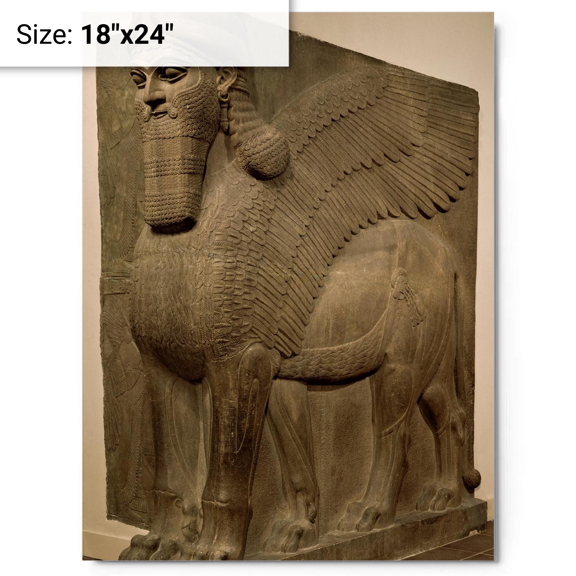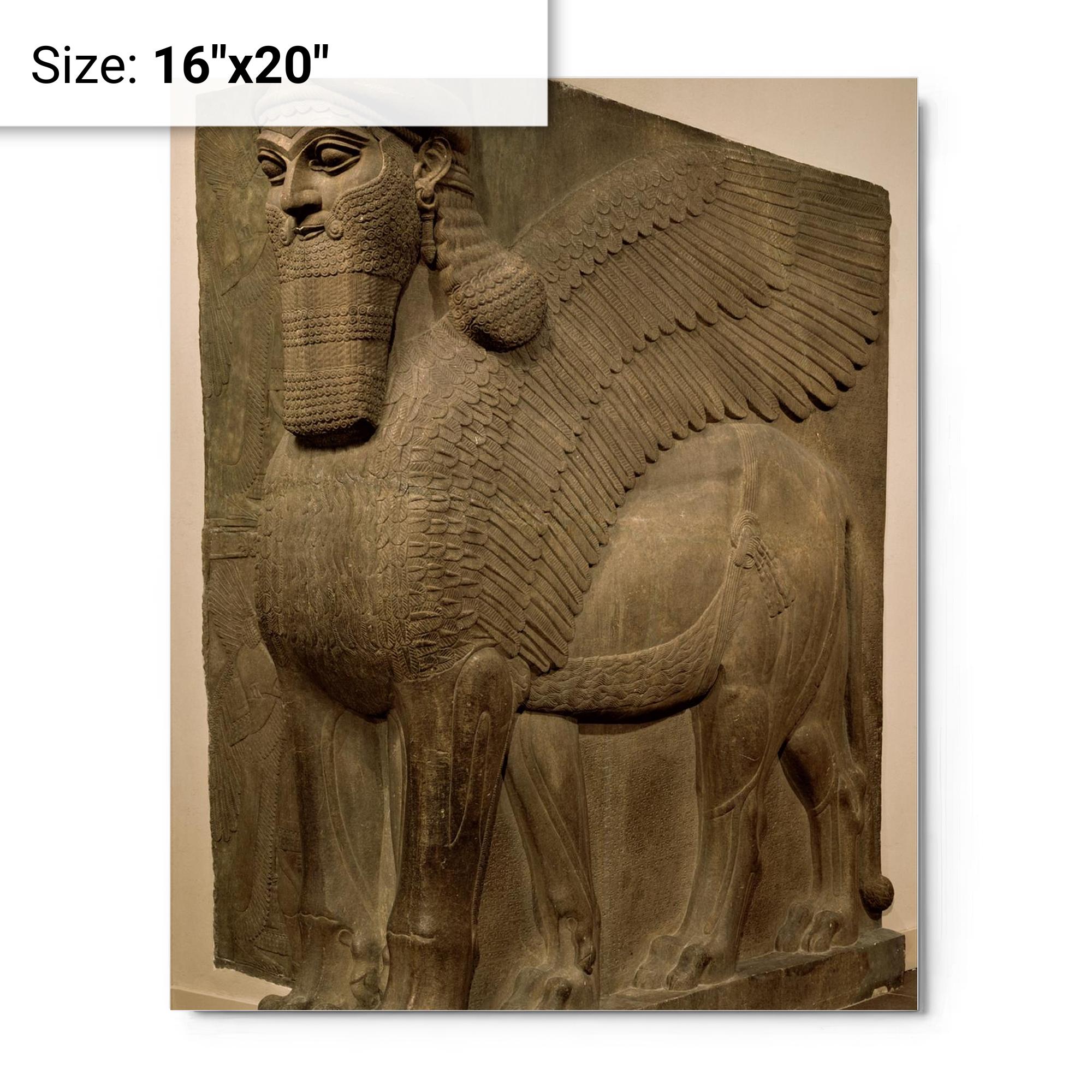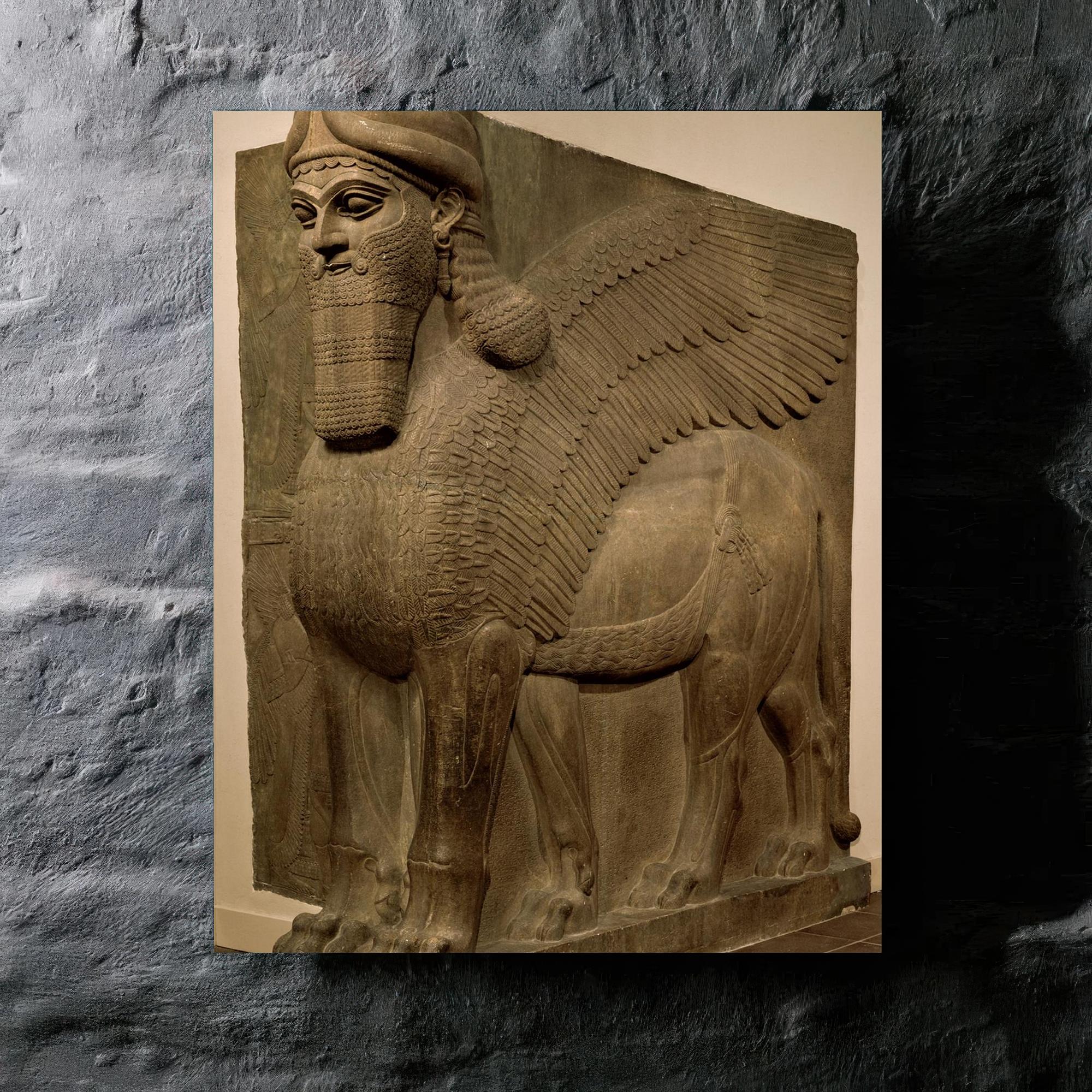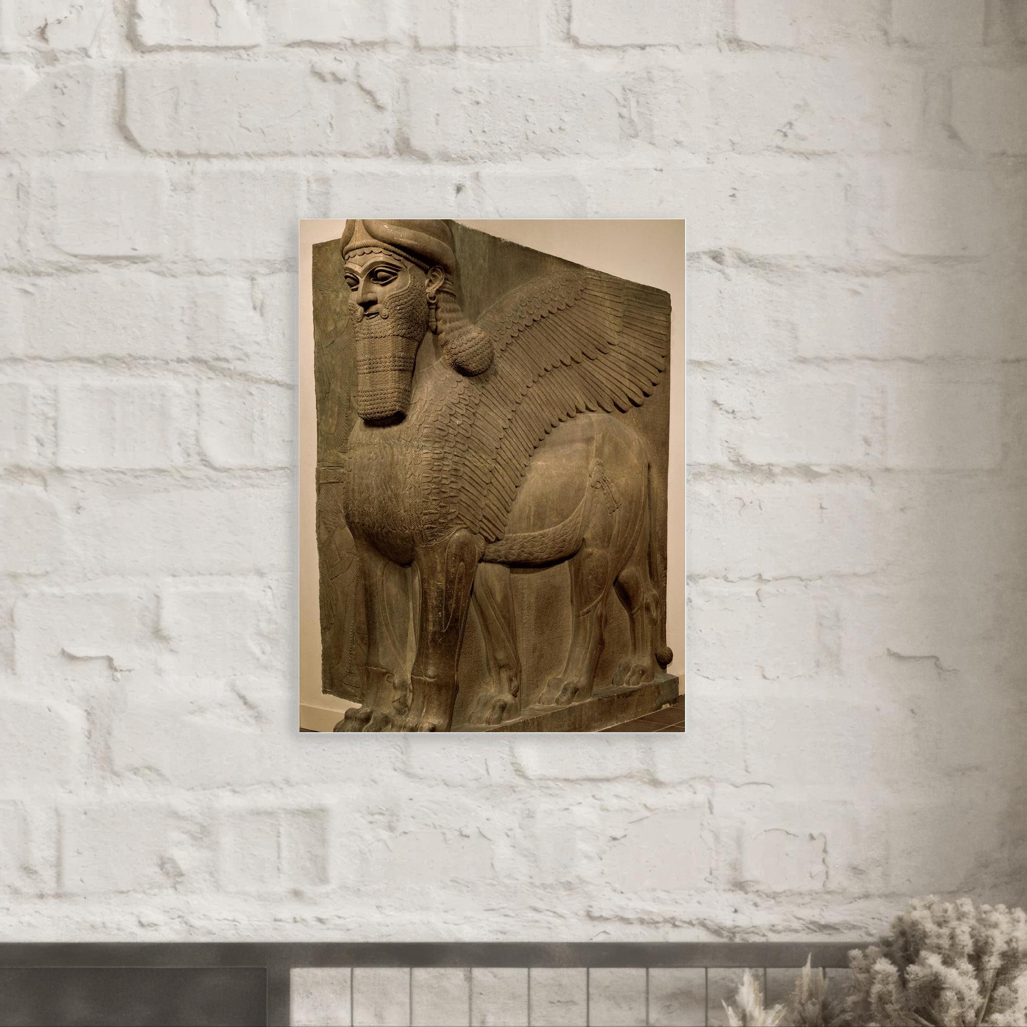 This metal print brings the ancient lamassu—the human-headed winged lion that once guarded Assyrian thresholds—into your space with a quiet, commanding presence.