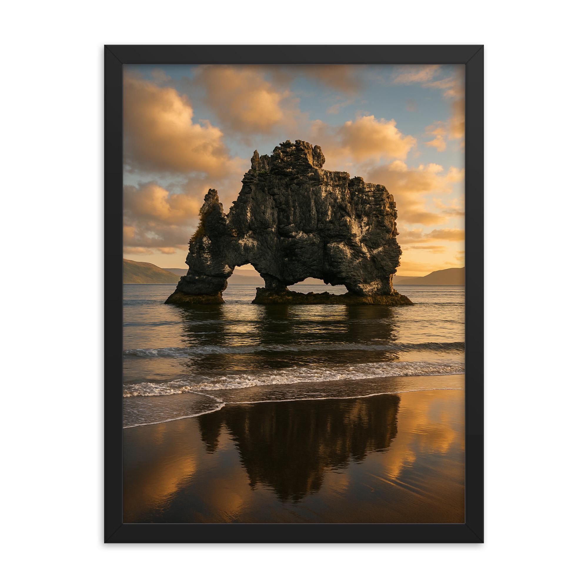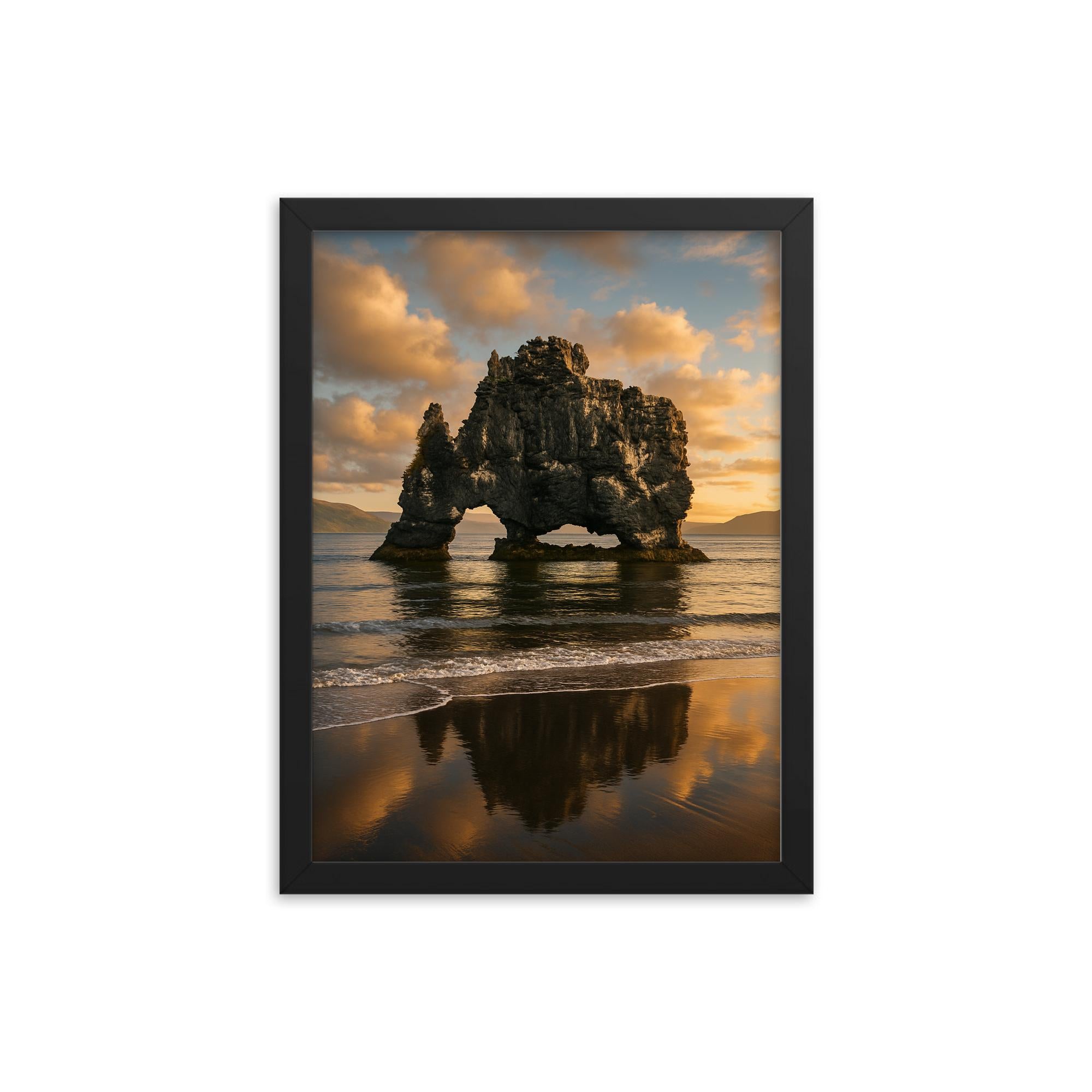 This framed print captures the raw, majestic presence of Hvitserkur, a volcanic rock formation rising boldly from the sea.