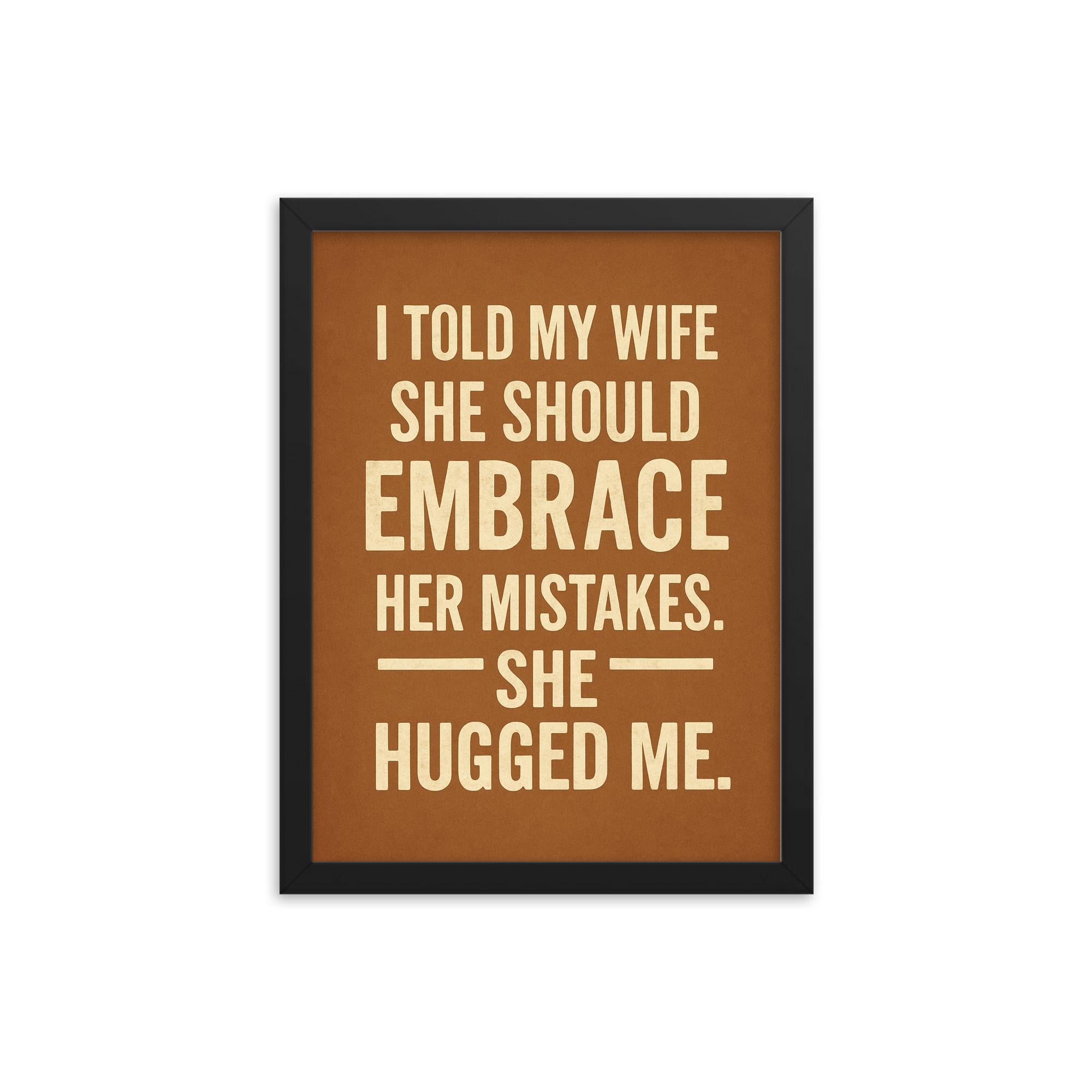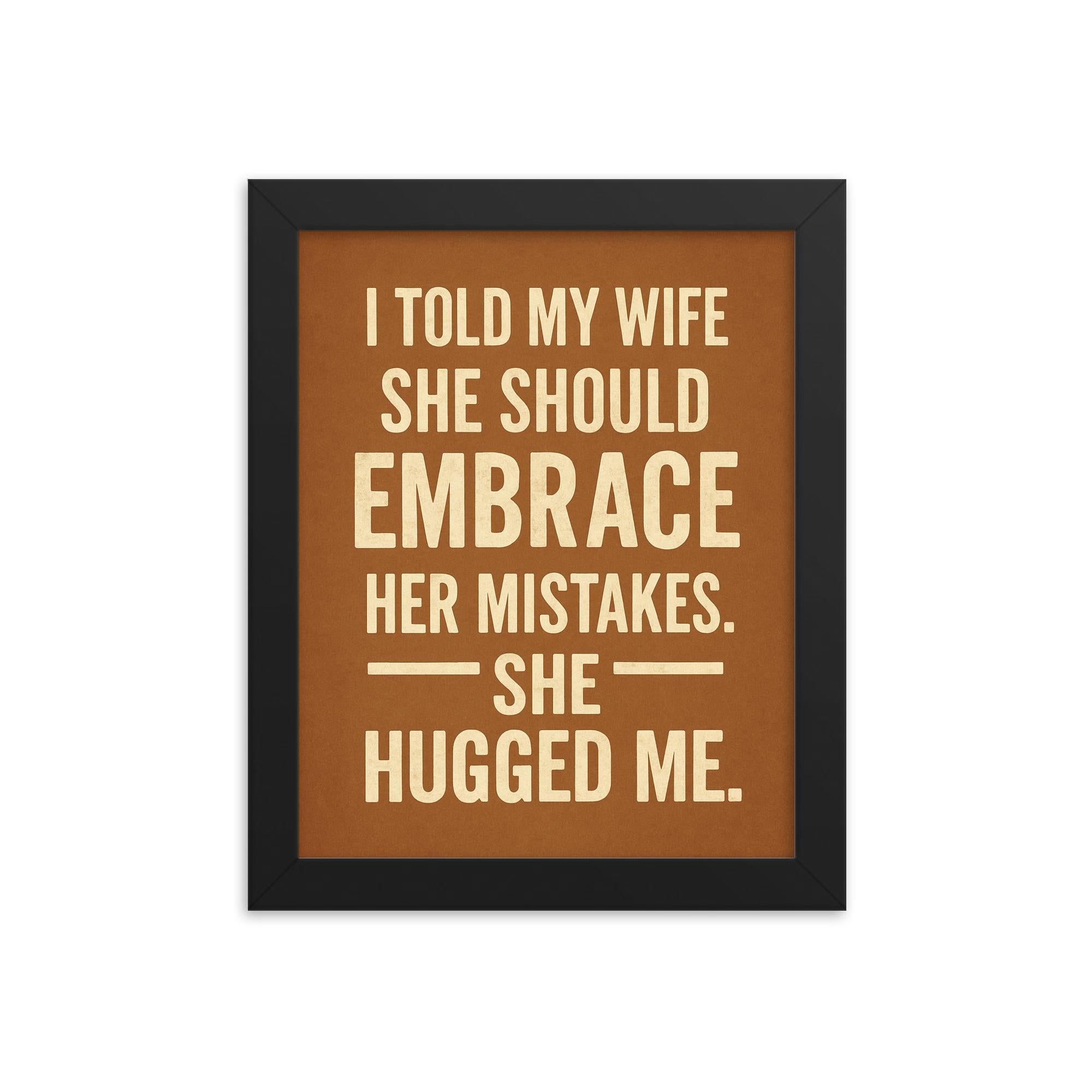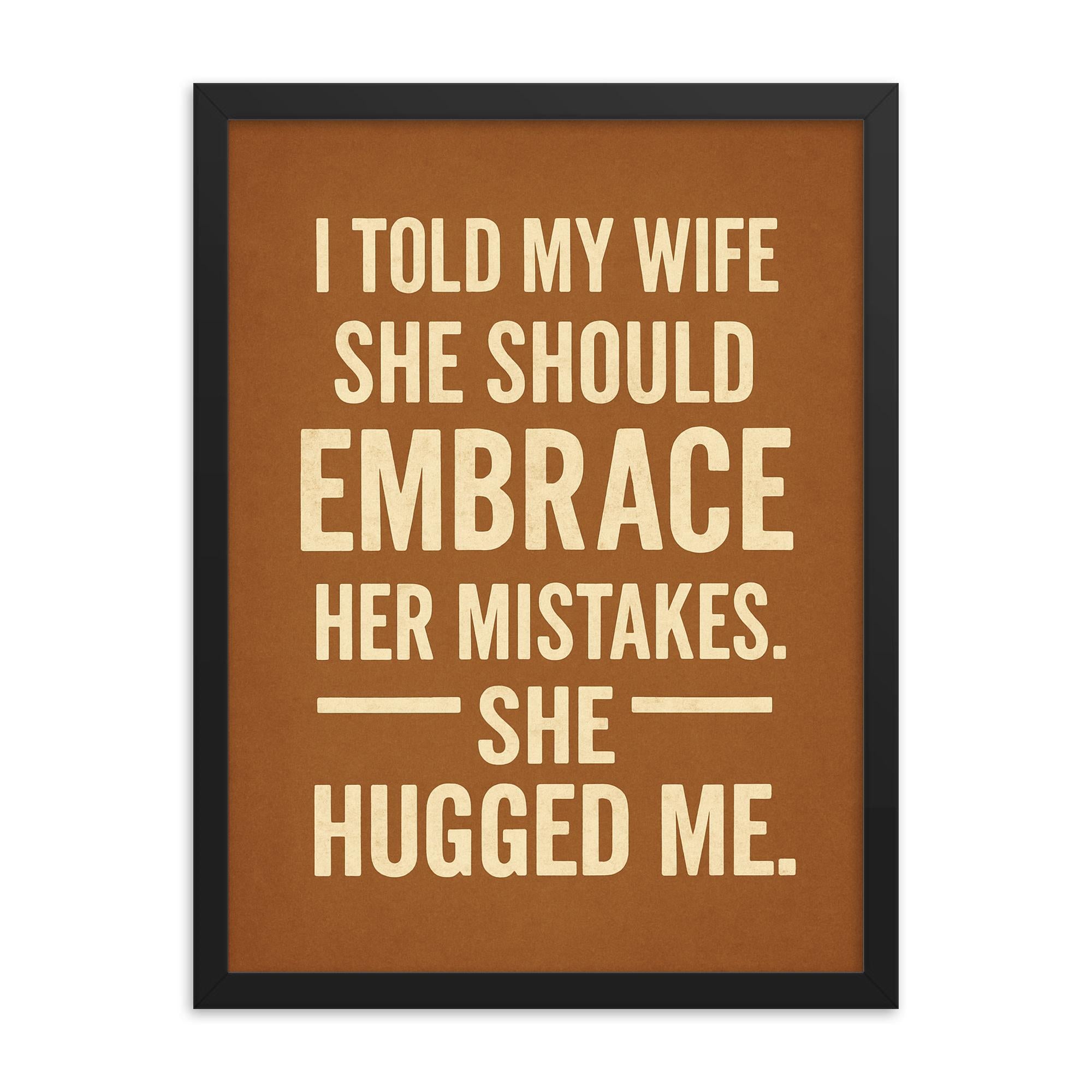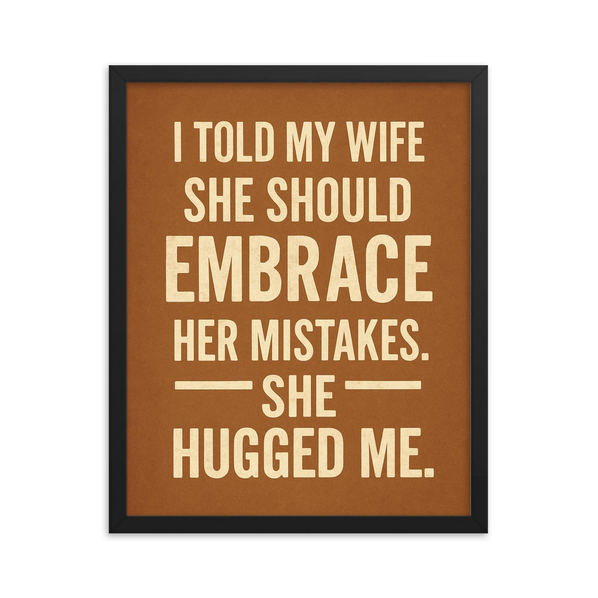 Bring laughter and personality to your walls with a framed print that's as smart and memorable as your sense of humor. This clever wall art features the hilarious punchline: I told my wife she should embrace her mistakes She hugged me