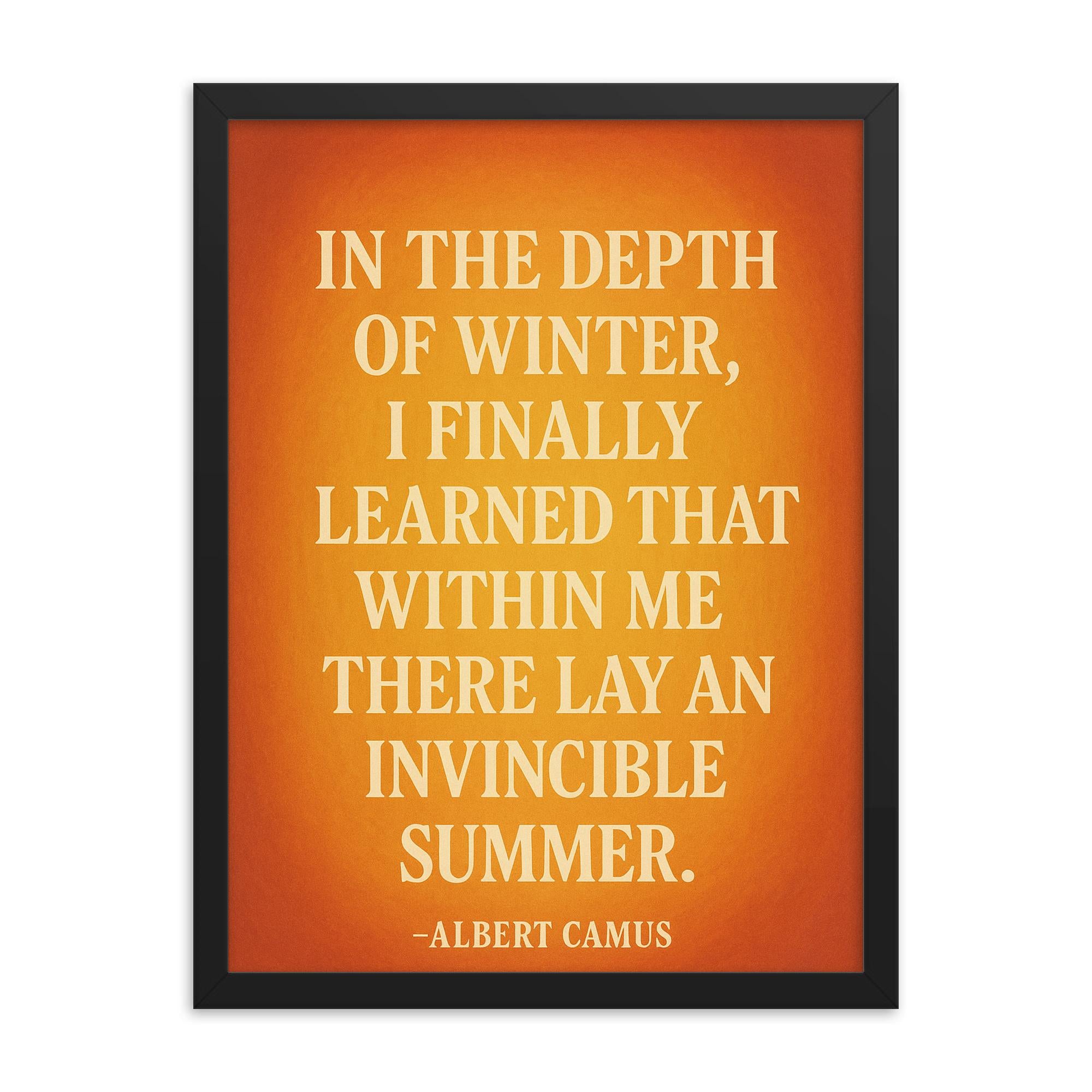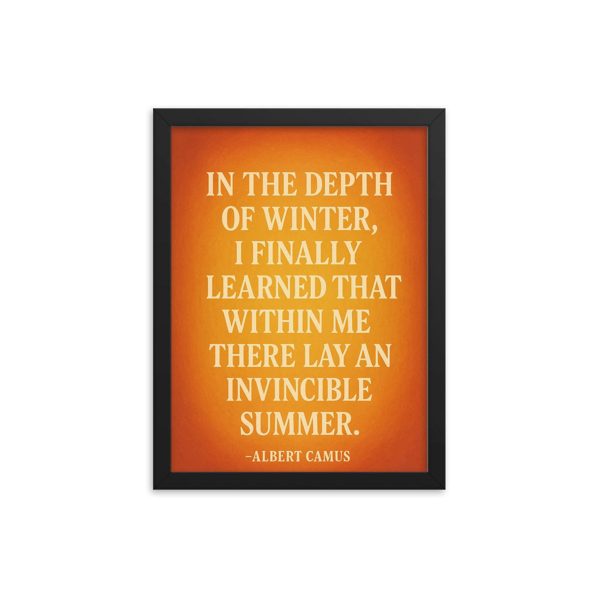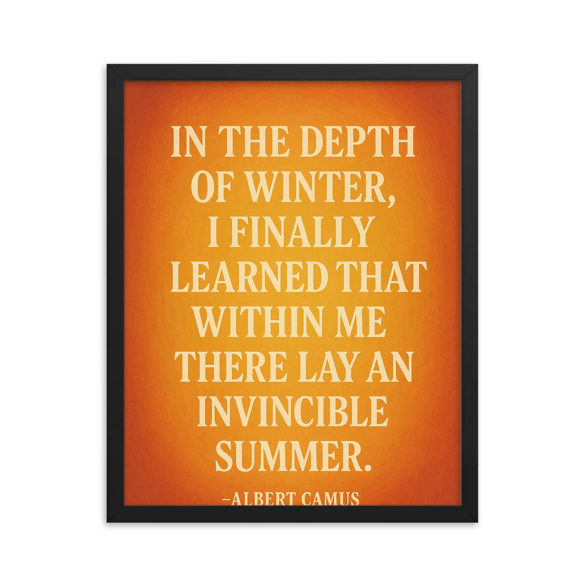 Bring profound inspiration into your home or workplace with this stunning framed print featuring Albert Camus’s timeless words: In the depth of winter I finally learned that within me there lay an invincible summer.