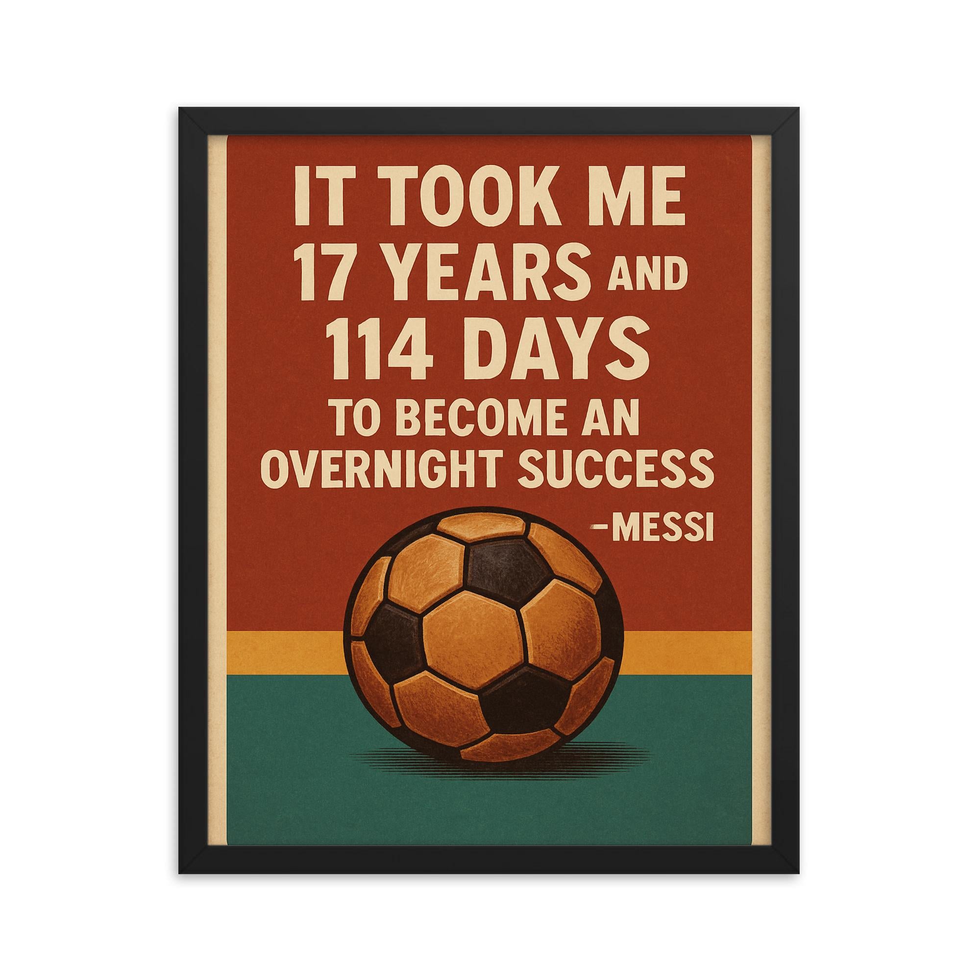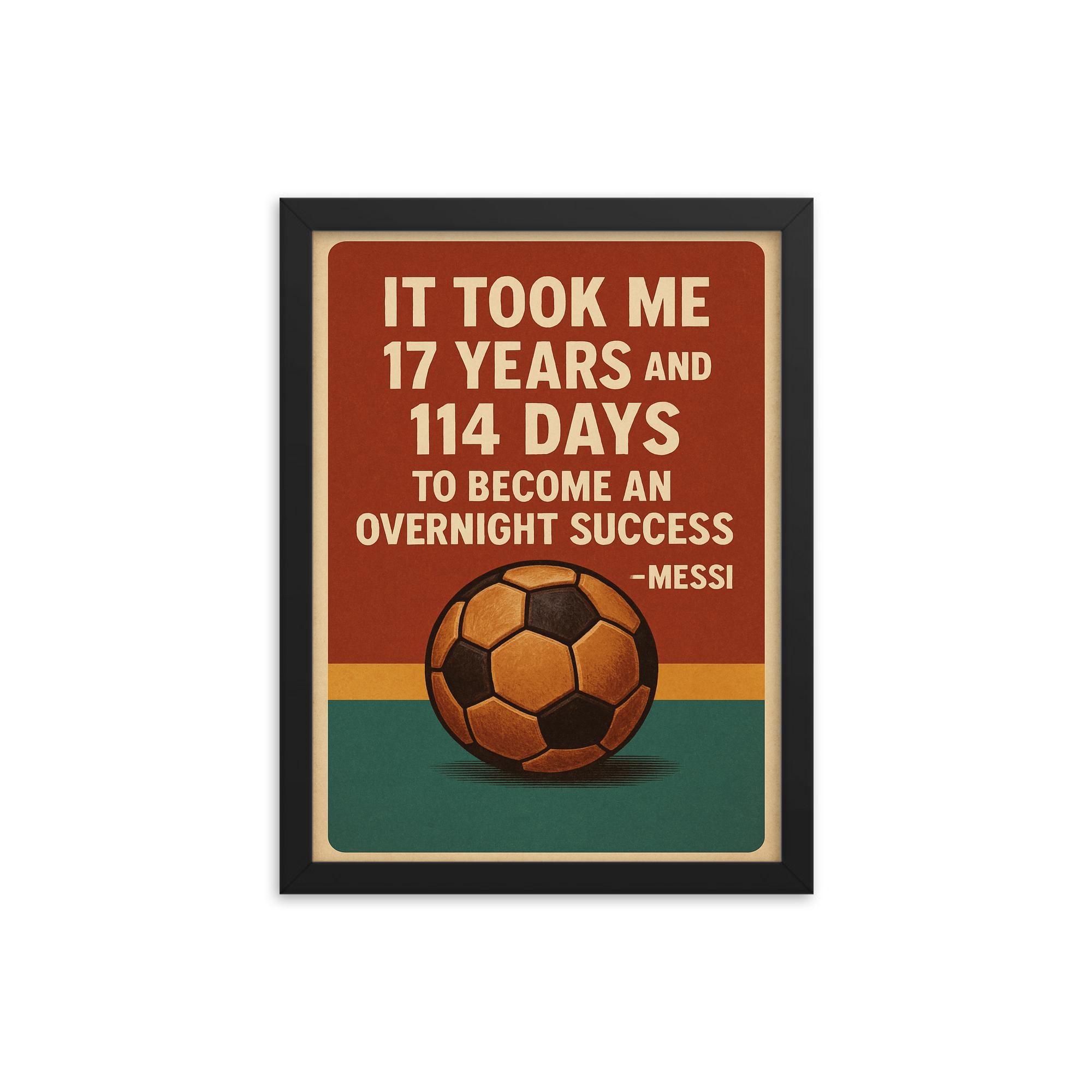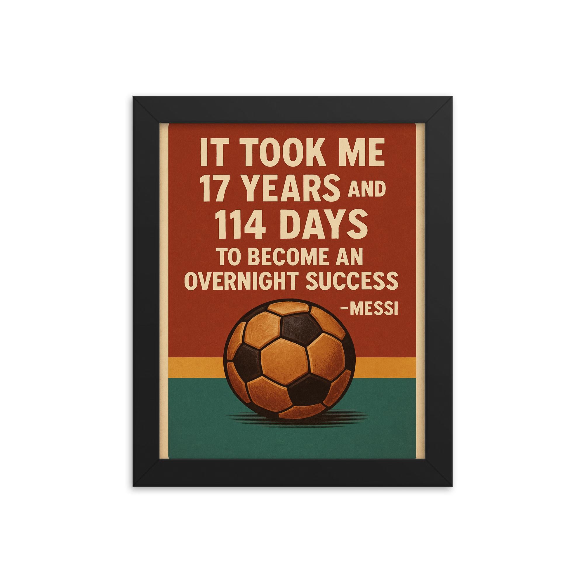 This framed print features the iconic message from Lionel Messi: It took me 17 years and 114 to become an overnight success.