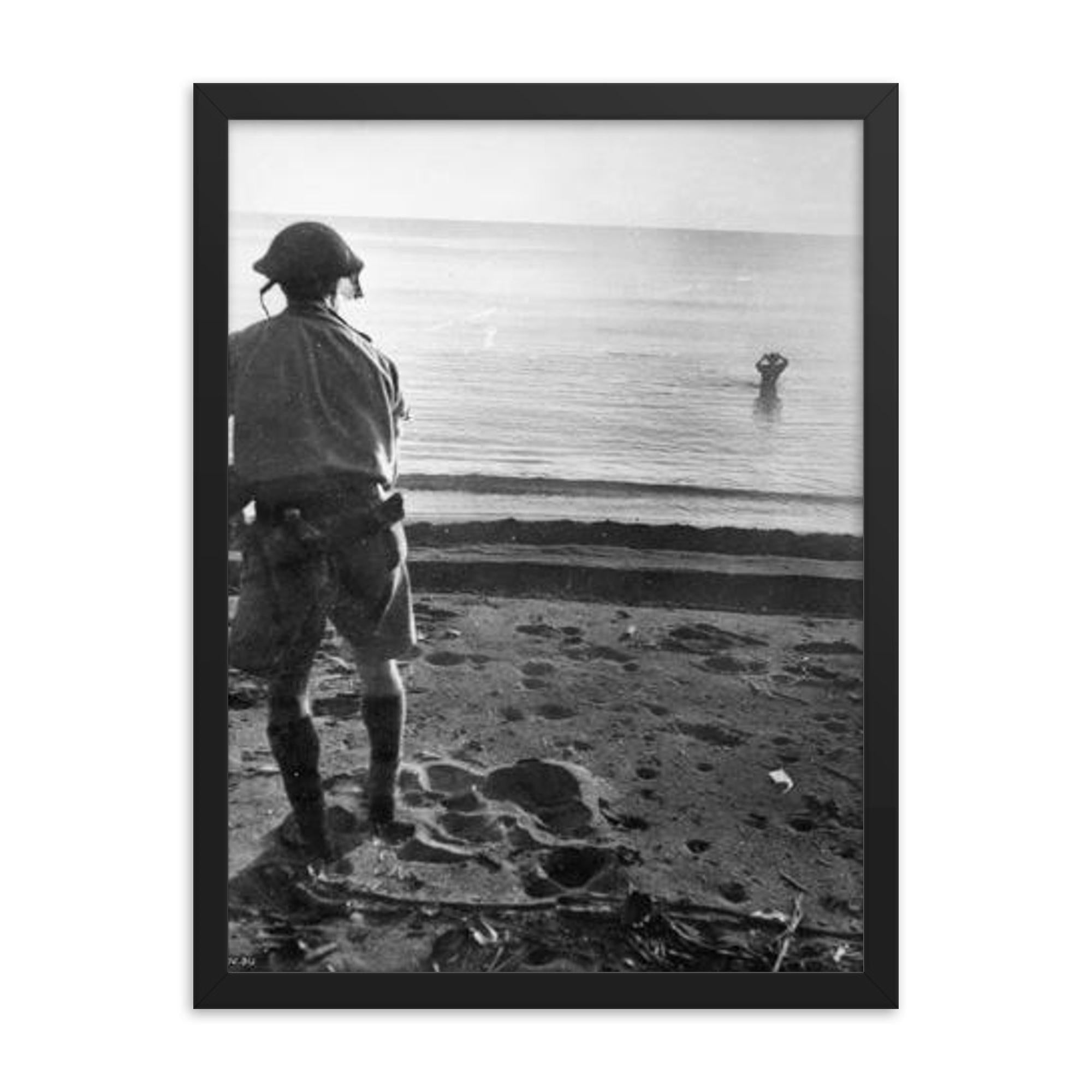Elevate your space with a powerful piece of history—our framed print of the iconic “Japanese Soldier Wades Into Sea with Grenade, December 18, 1942.” This arresting wall art captures a moment frozen in time, perfect for enthusiasts of military history, vintage photography, or impactful storytelling through art.