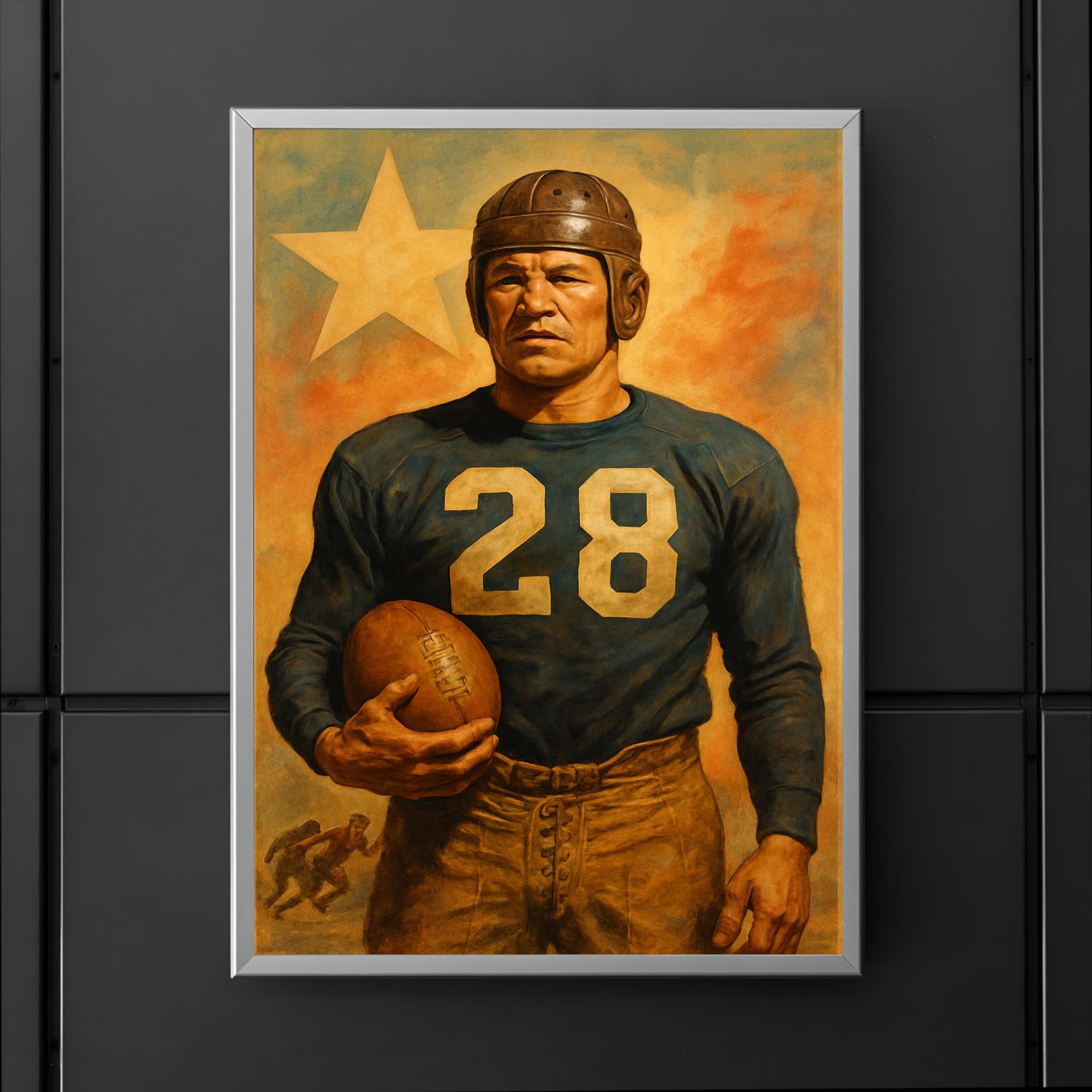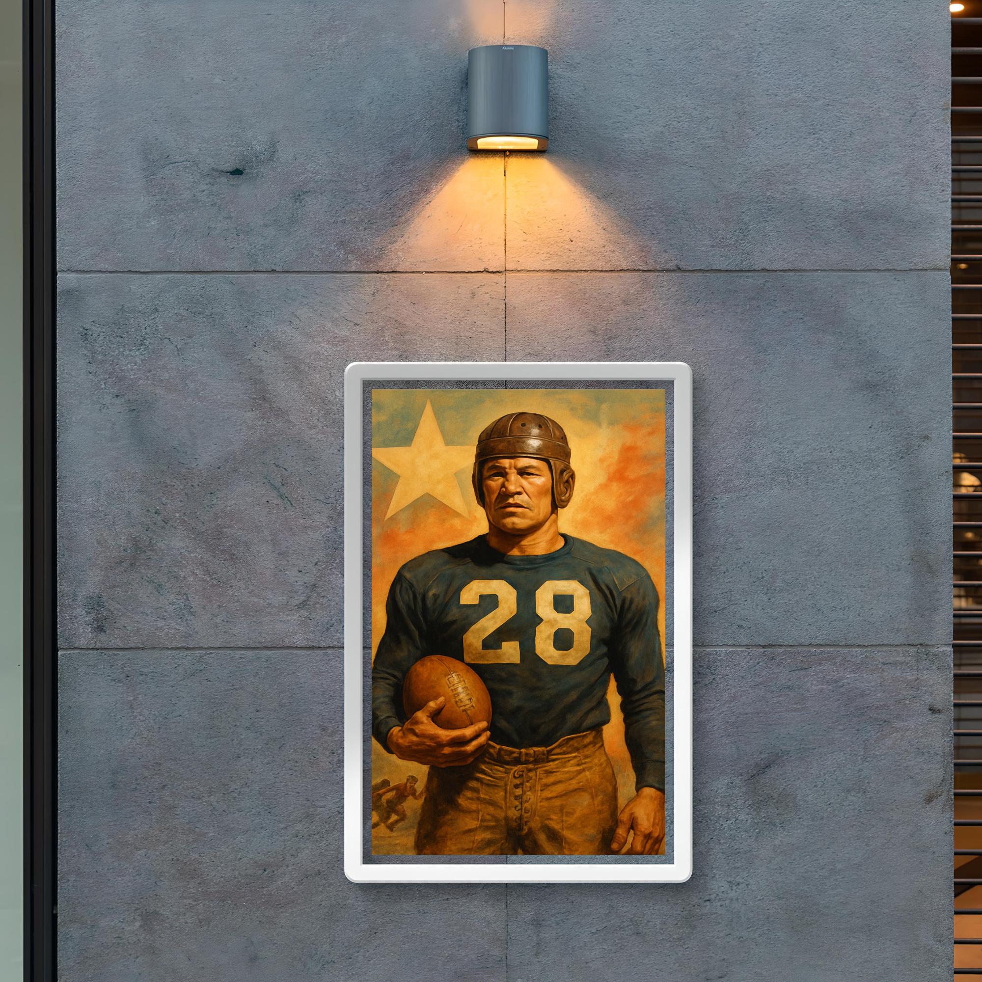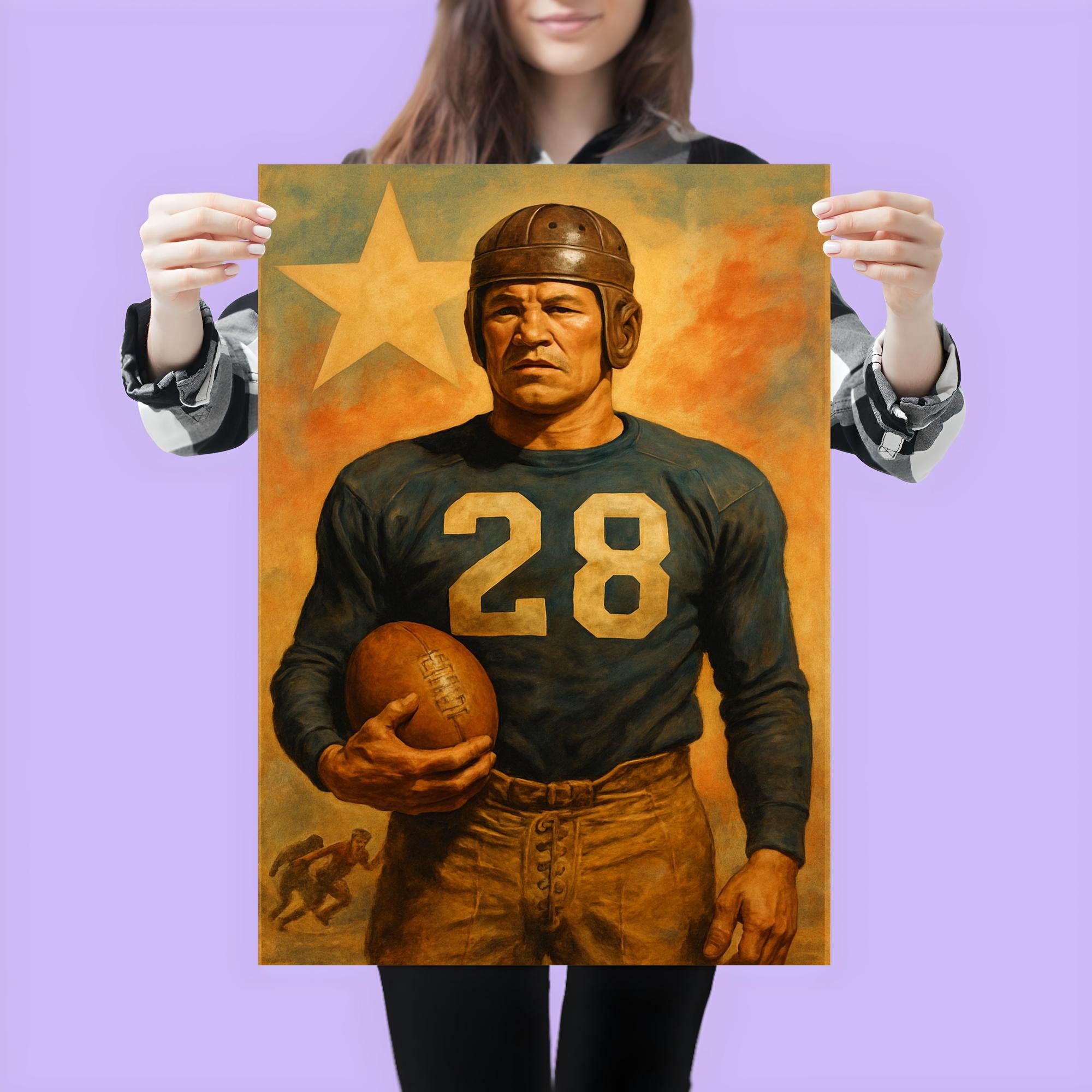 Celebrate the legendary spirit of Jim Thorpe with this striking poster, capturing the essence of one of history's greatest athletes. Whether displayed in your home, office, or gym, it serves as a timeless tribute to Thorpe’s extraordinary legacy and inspiring determination. Perfect for fans of sports history and icons who transcended the game.