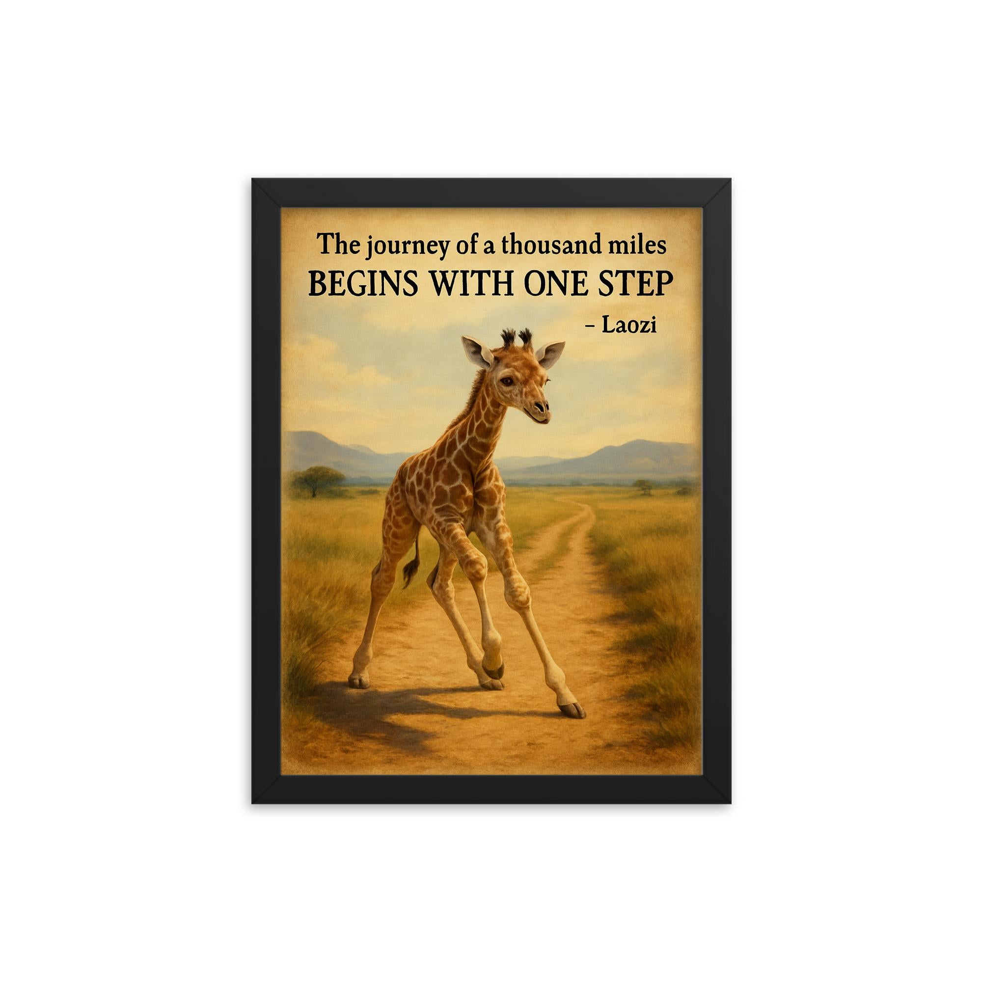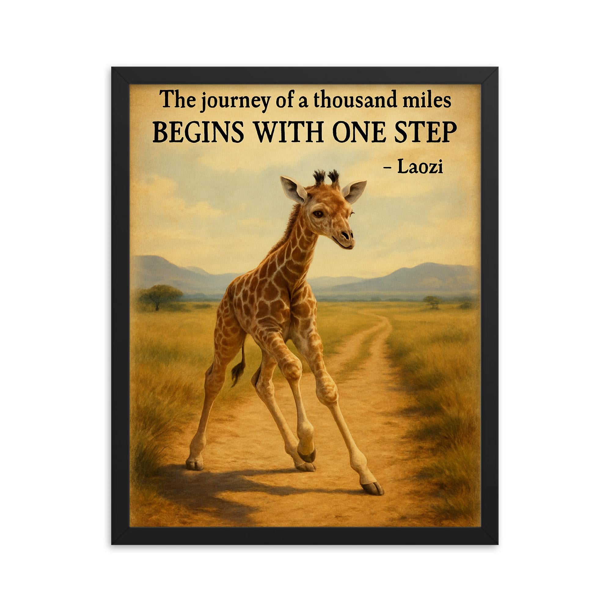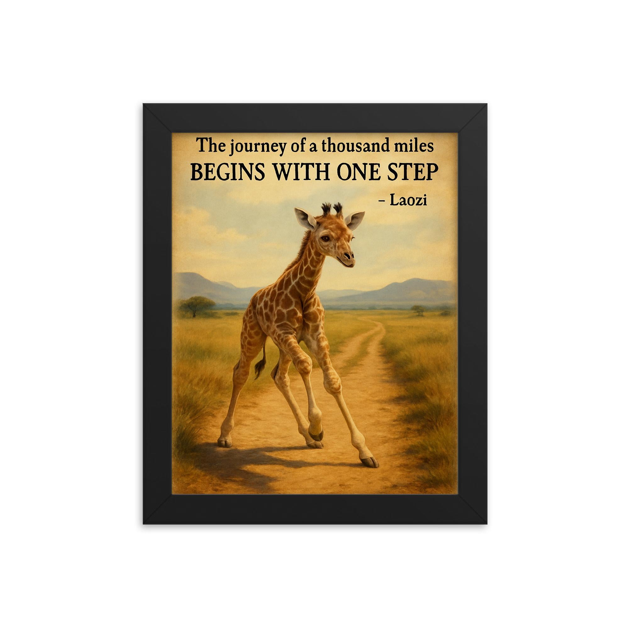 Make every day a fresh beginning with our stunning Journey of a Thousand Miles Quote—Baby Giraffe Taking First Step framed print.