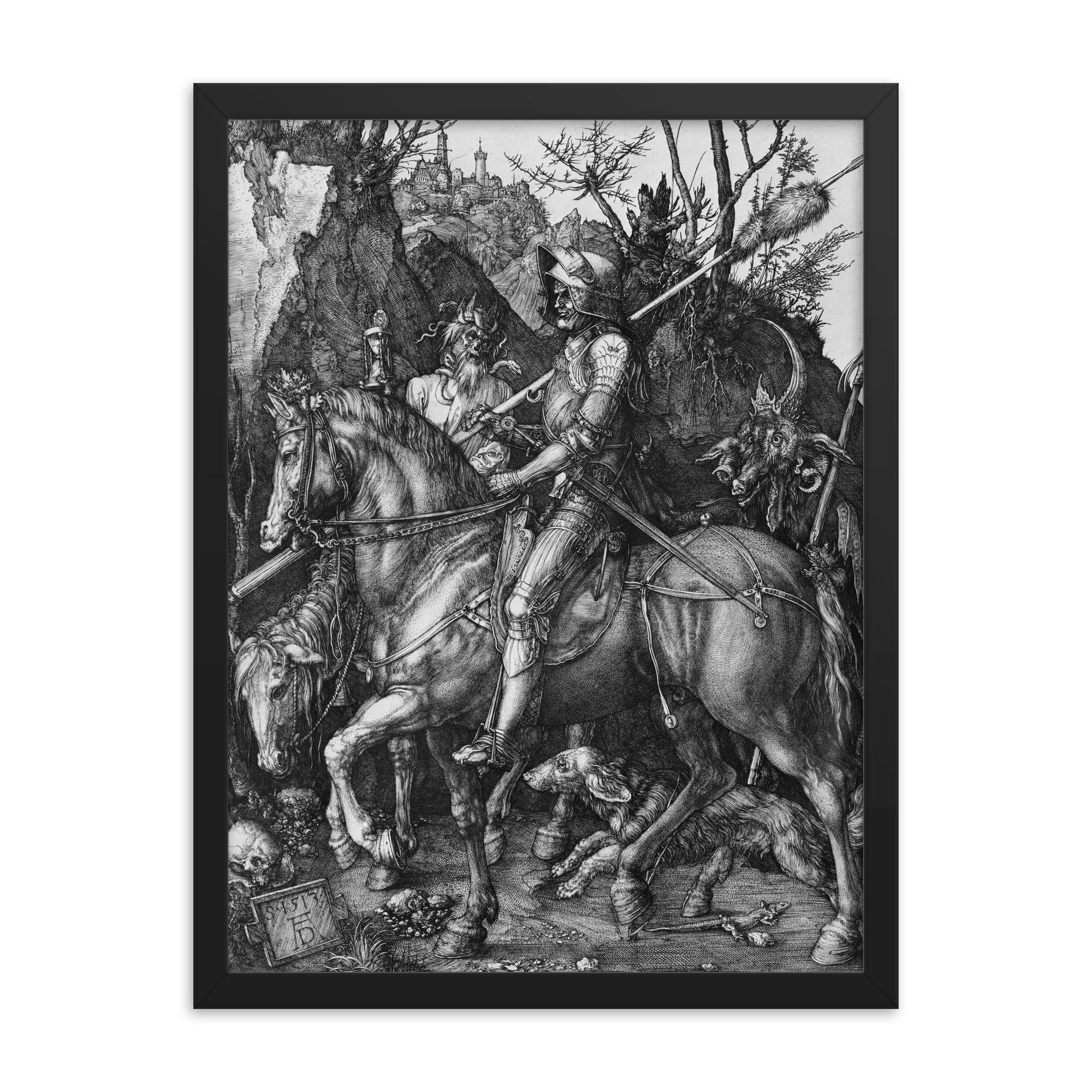 Transform your living space with a masterpiece of Renaissance art—our framed print of Knight, Death and the Devil by Albrecht Dürer, 1513.
