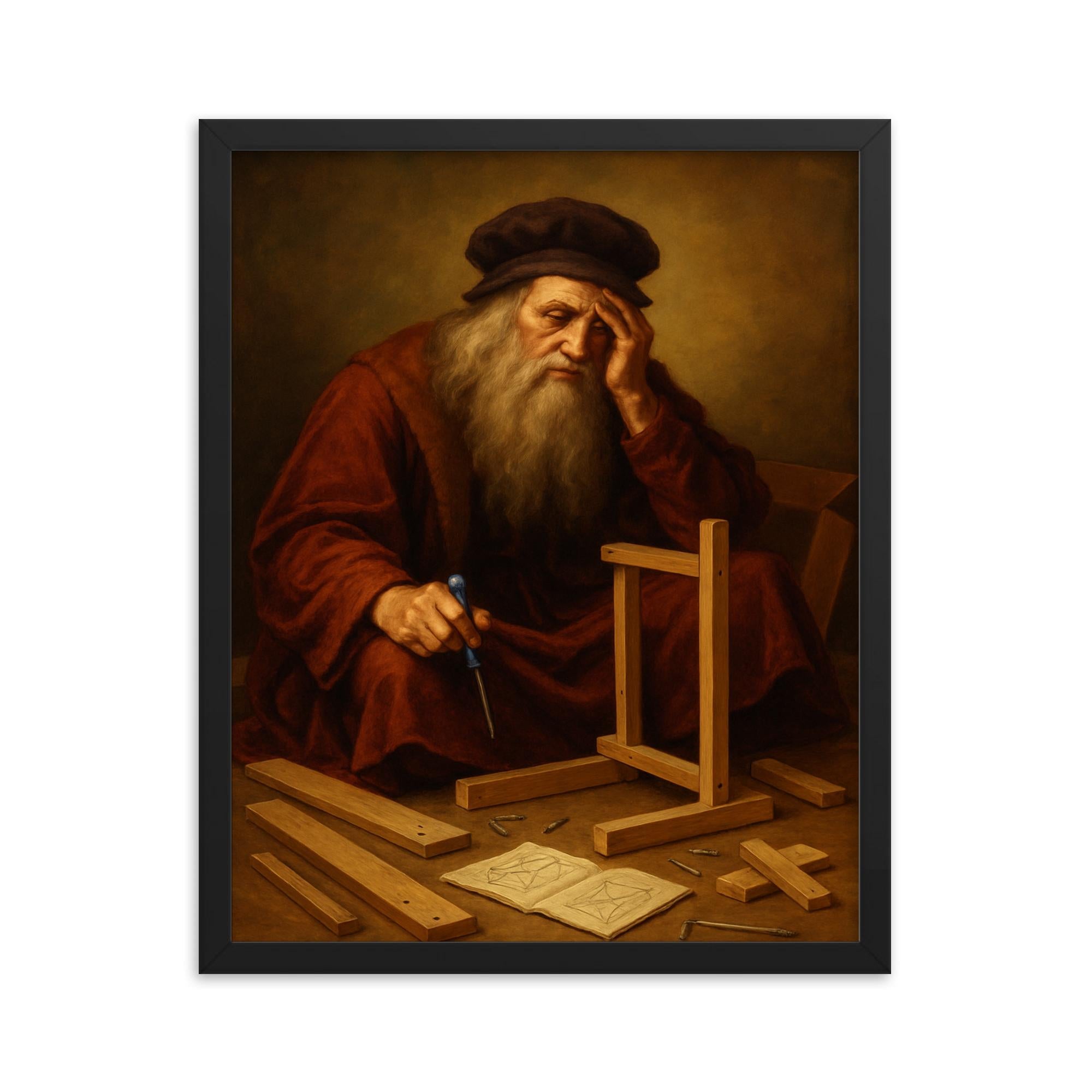 Leonardo da Vinci Defeated Assembling Flat Pack Furniture Framed Print Wall Art Unique Historical Humor Decor
