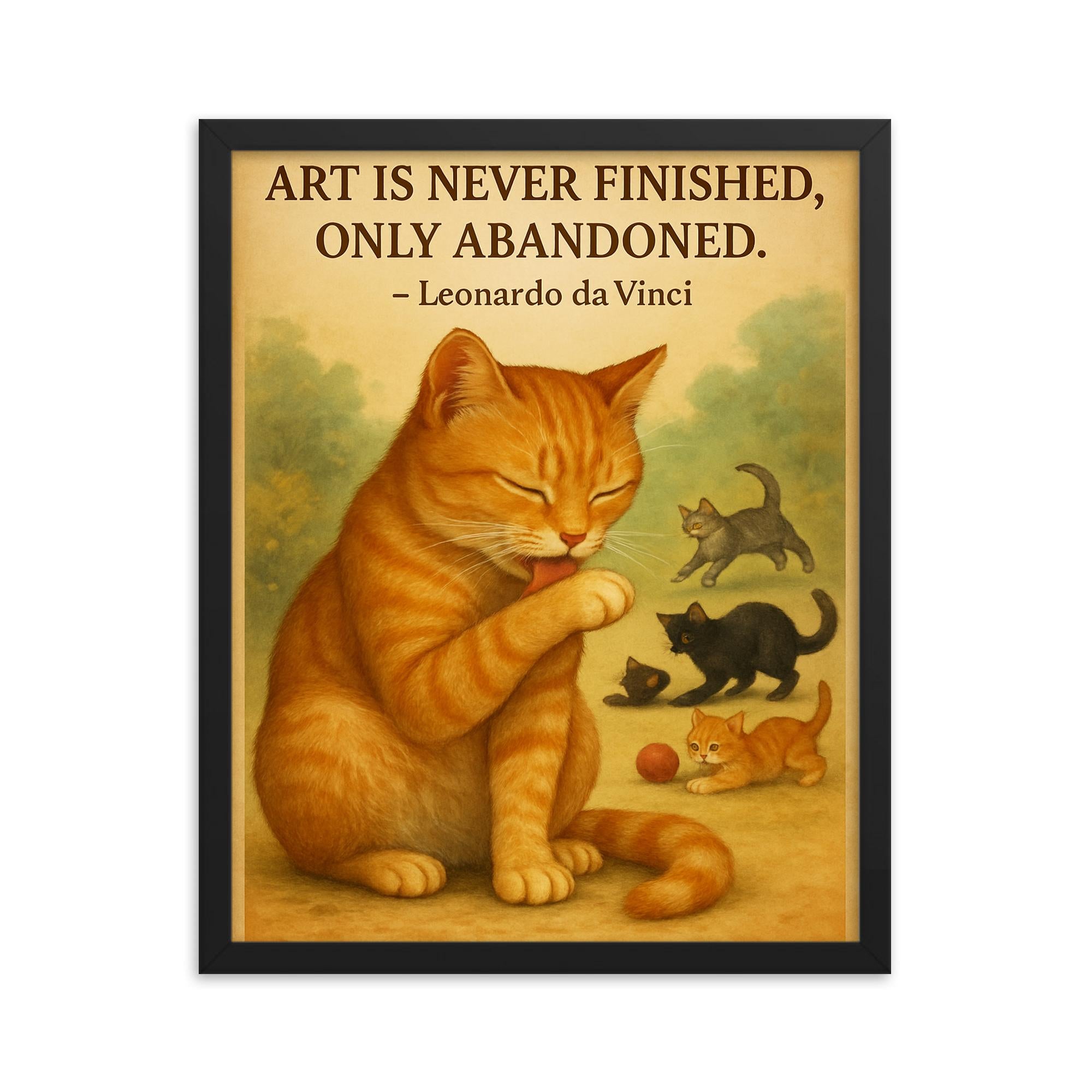 Bring a spark of genius, wit, and inspiration to your space with this uniquely framed print, inspired by the words of Leonardo da Vinci and the timeless allure of a perfectionist cat.