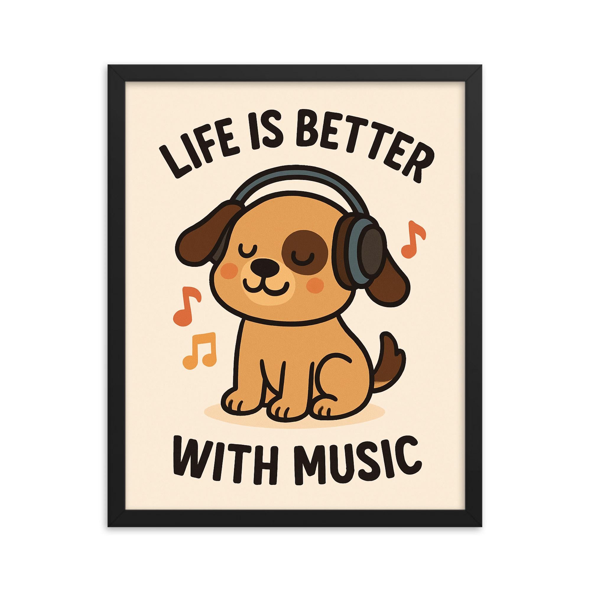 Bring joy and music into your space with this charming framed print featuring the lovable “Life is better with music” cute cartoon dog.