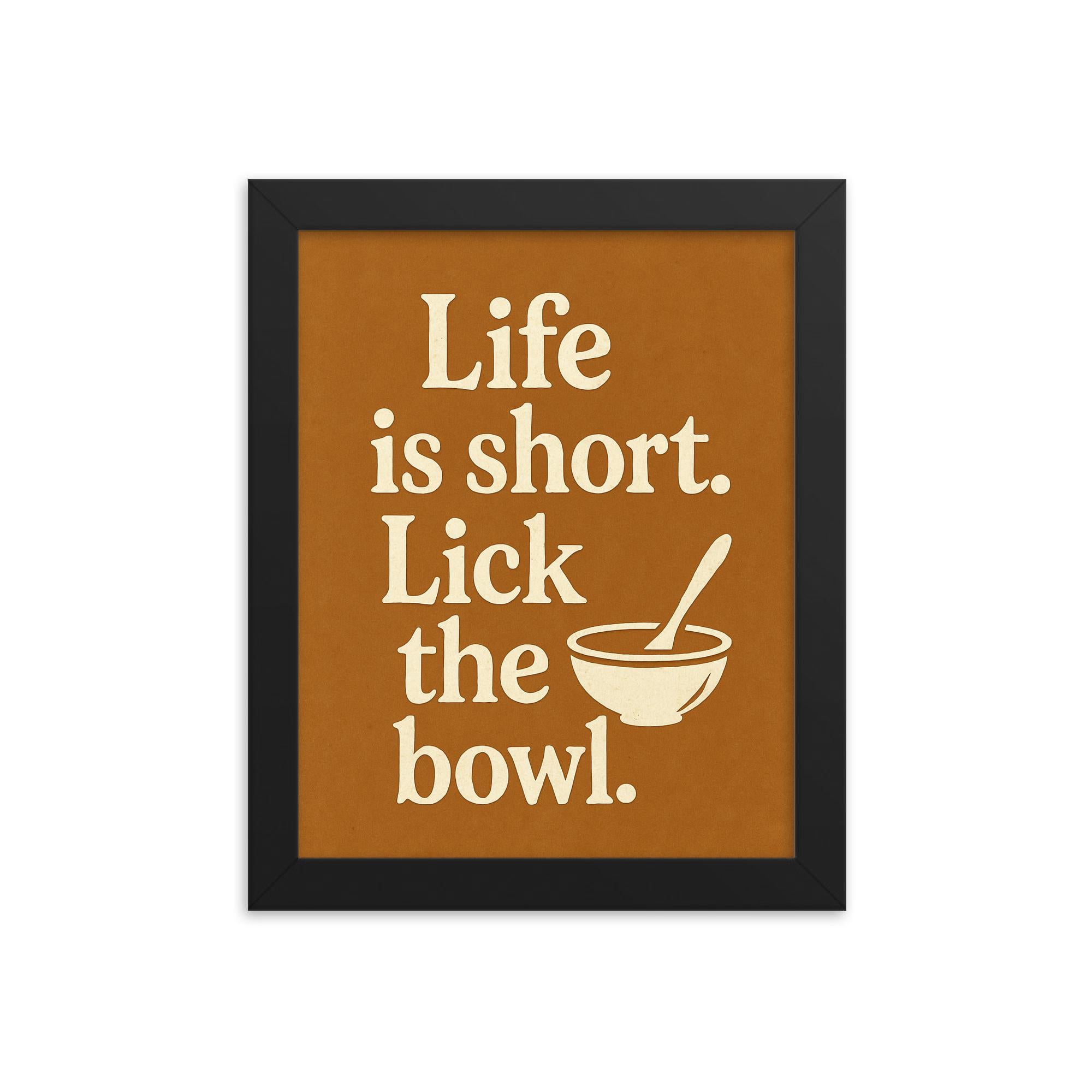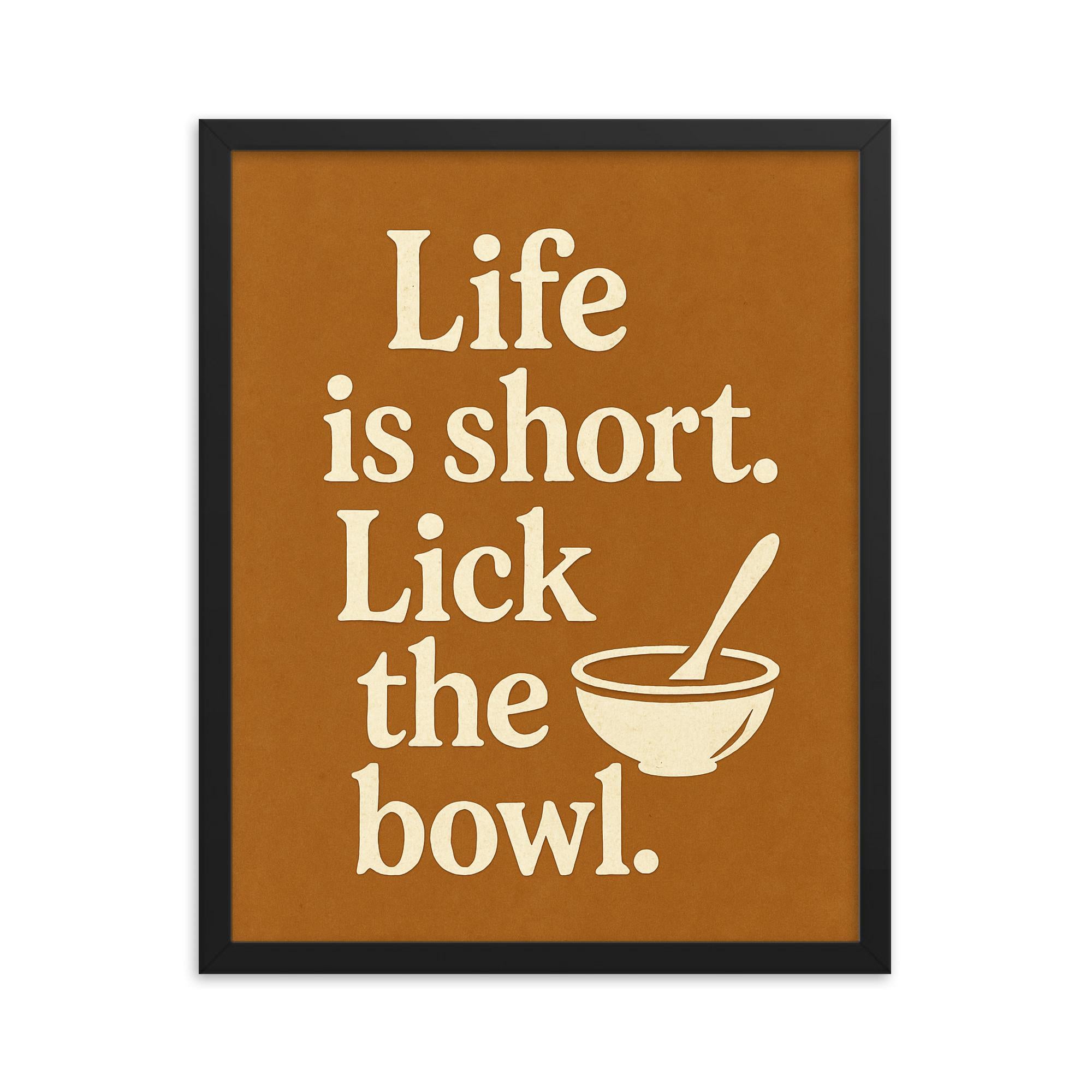 Add joy—and a dash of inspiration—to your home with this playful "Life is short Lick the bowl" framed print.
