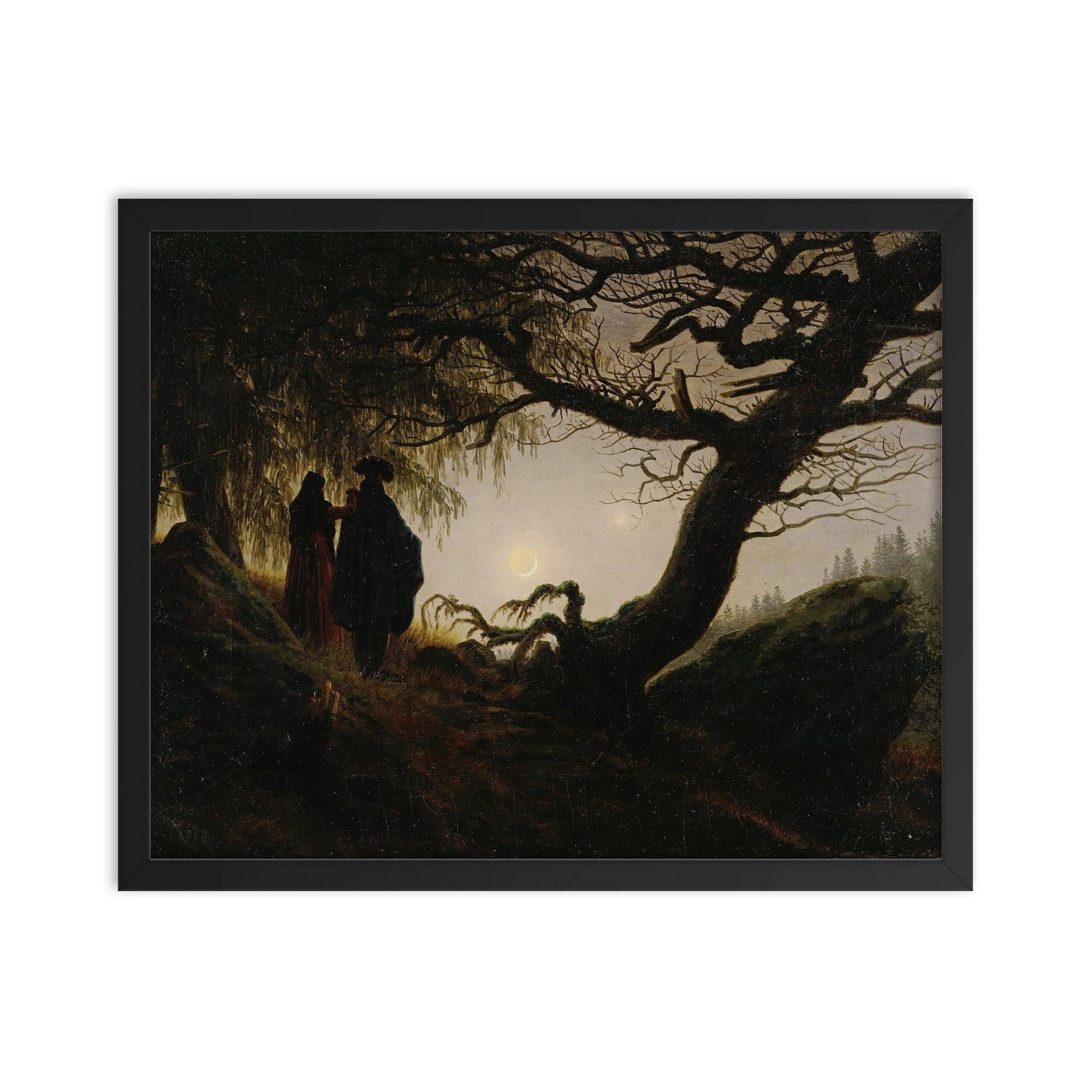 Transform your living space with the timeless elegance of the “Man and Woman Contemplating the Moon” framed print by Caspar David Friedrich, 1824.