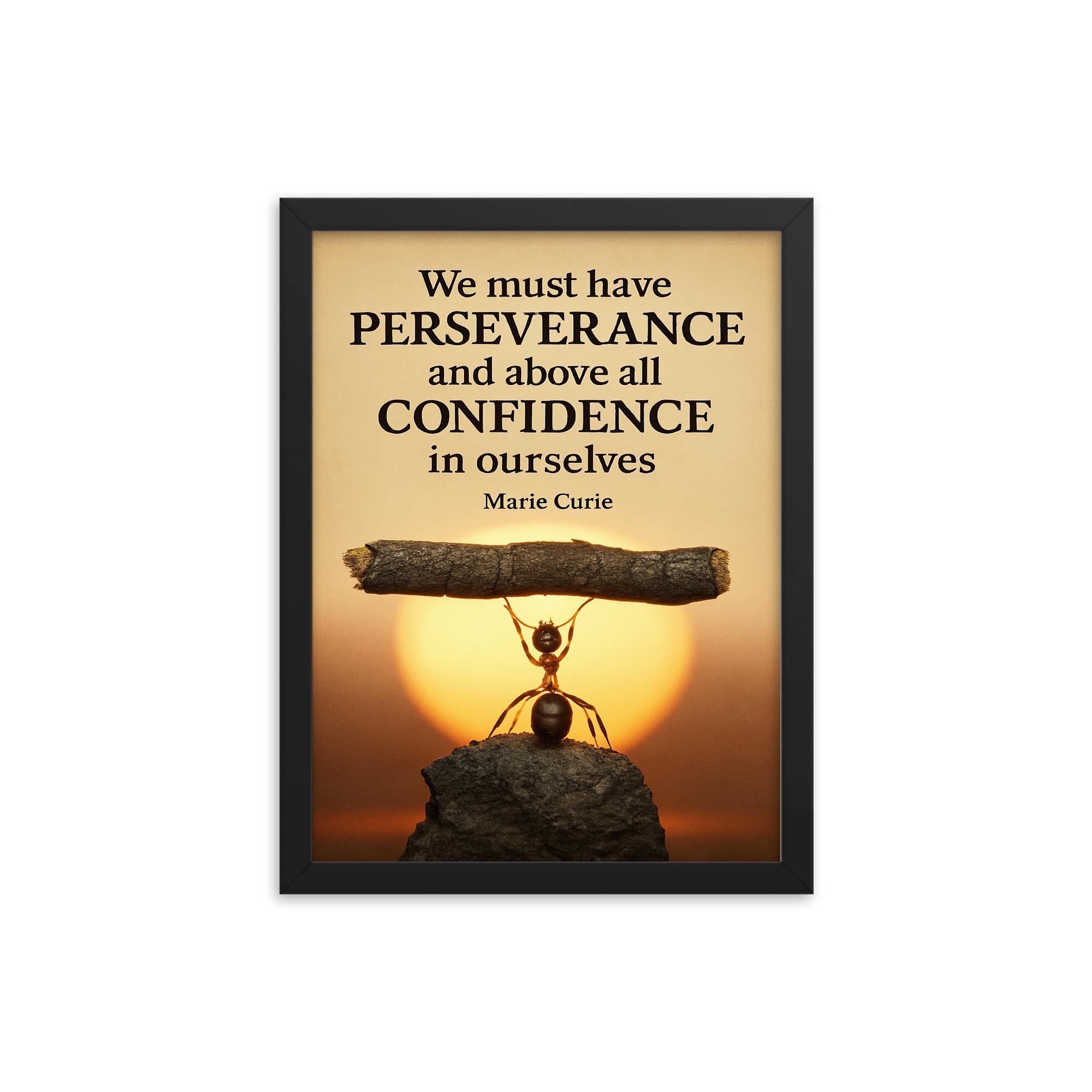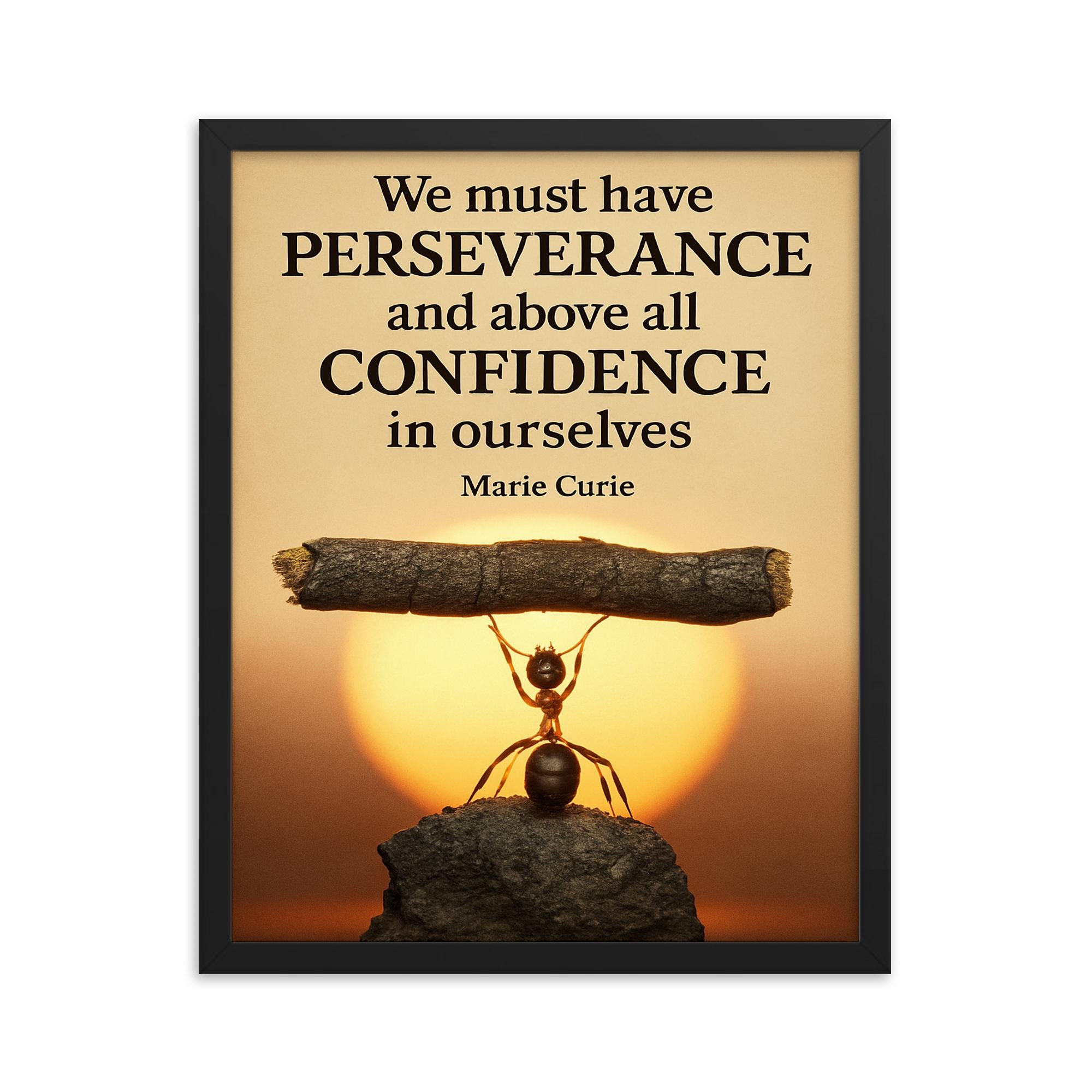 Marie Curie Perseverance Quote Framed Print – Motivational Wall Art with Ant Lifting Heavy Object for Confidence & Inspiration Decor