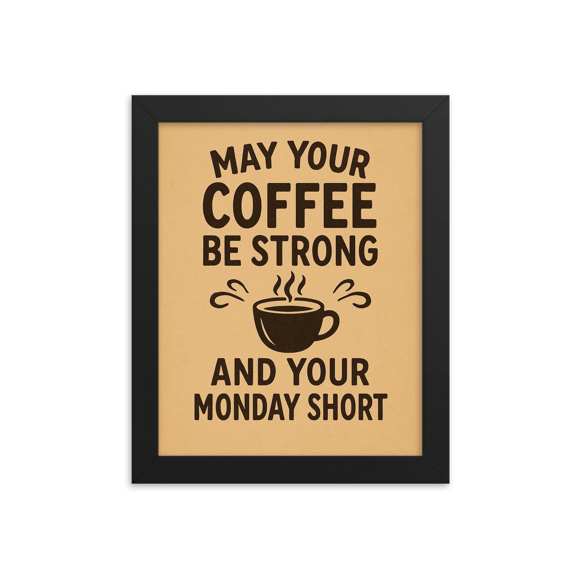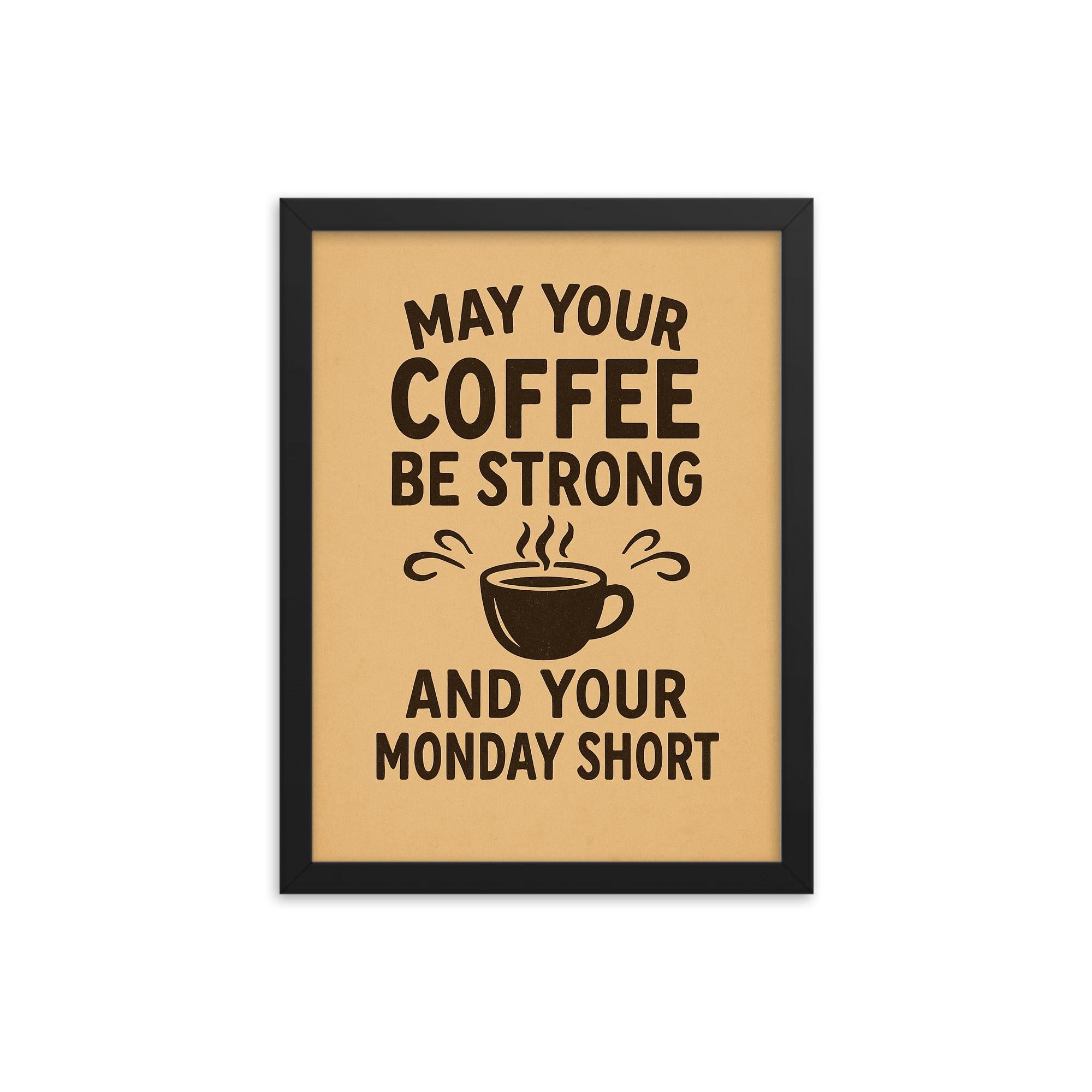 Start your week with a smile—transform your space and your mood with our framed wall art featuring the energizing message: May your coffee be strong and your Monday short.