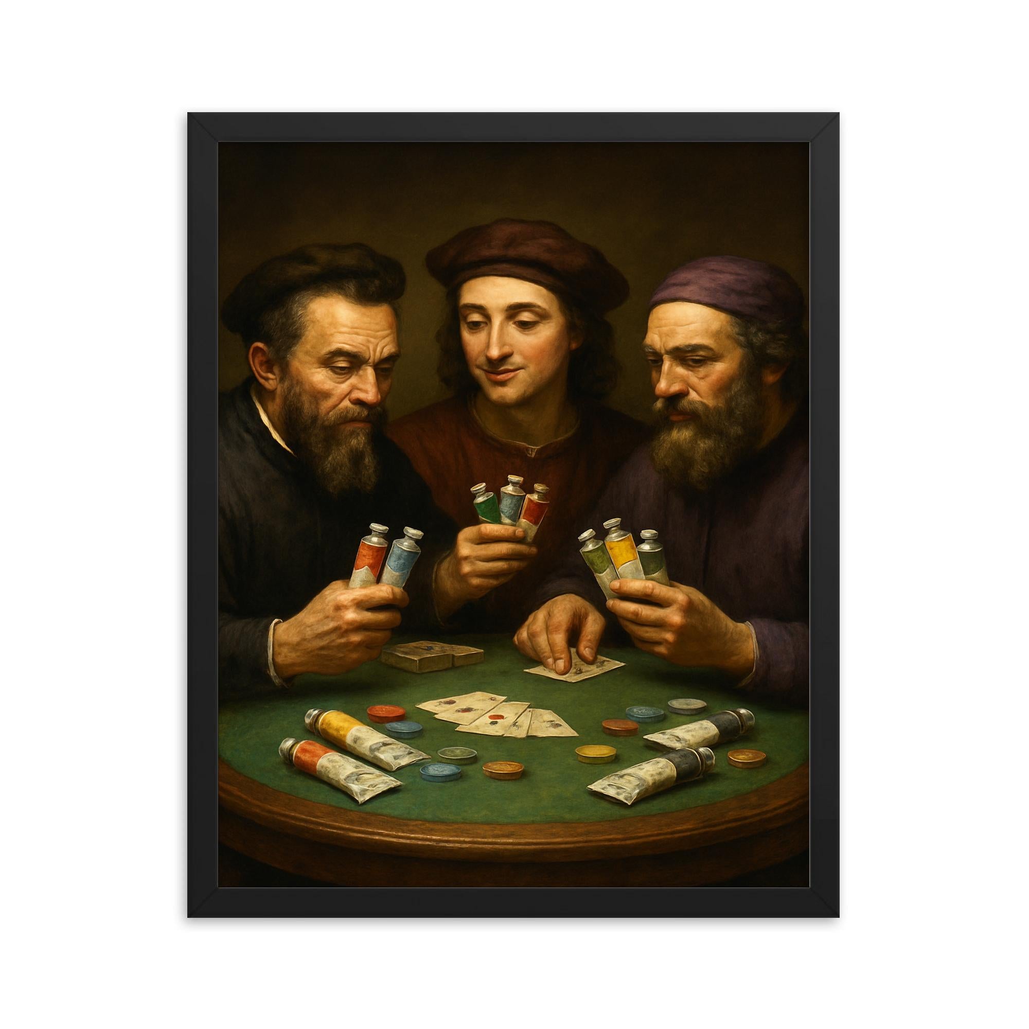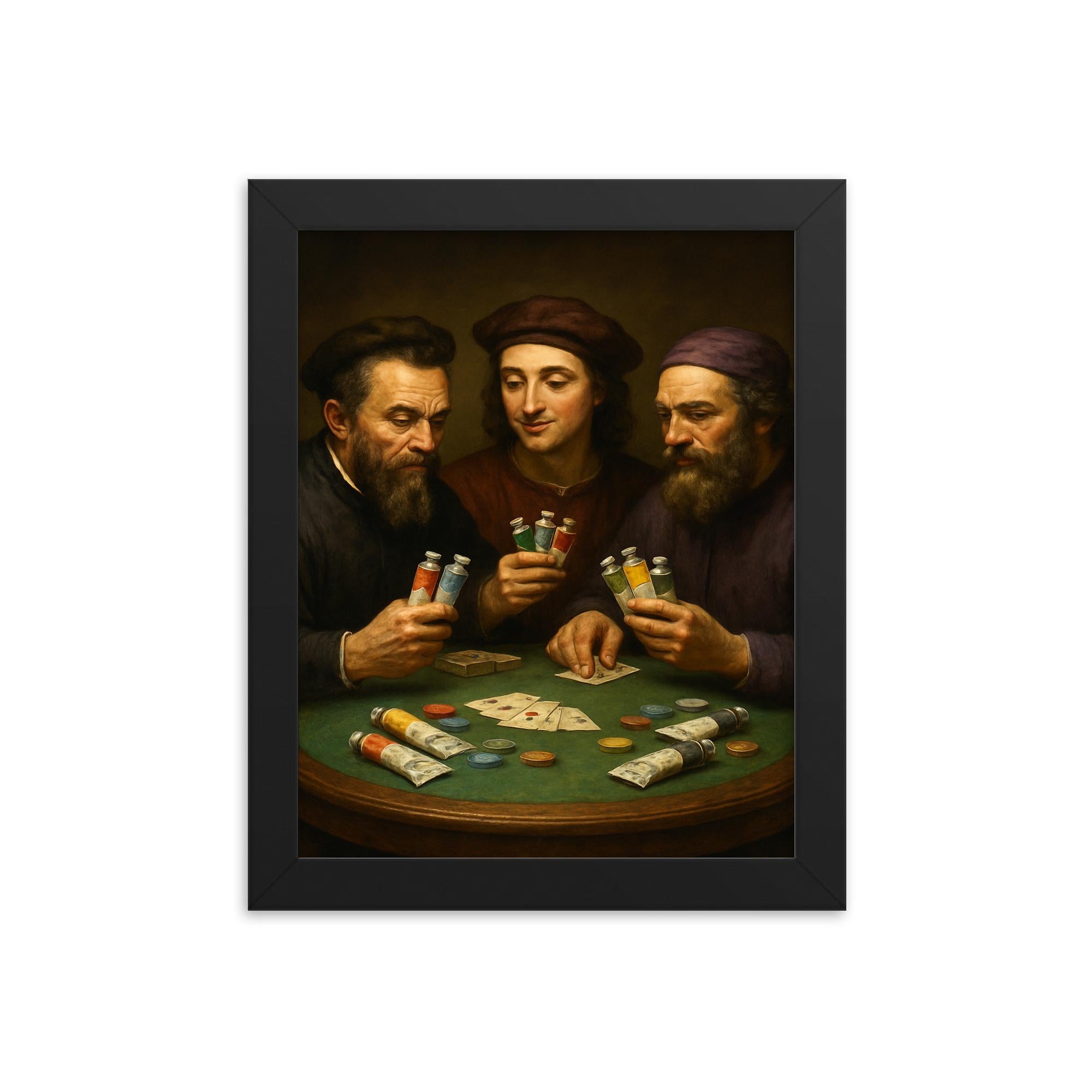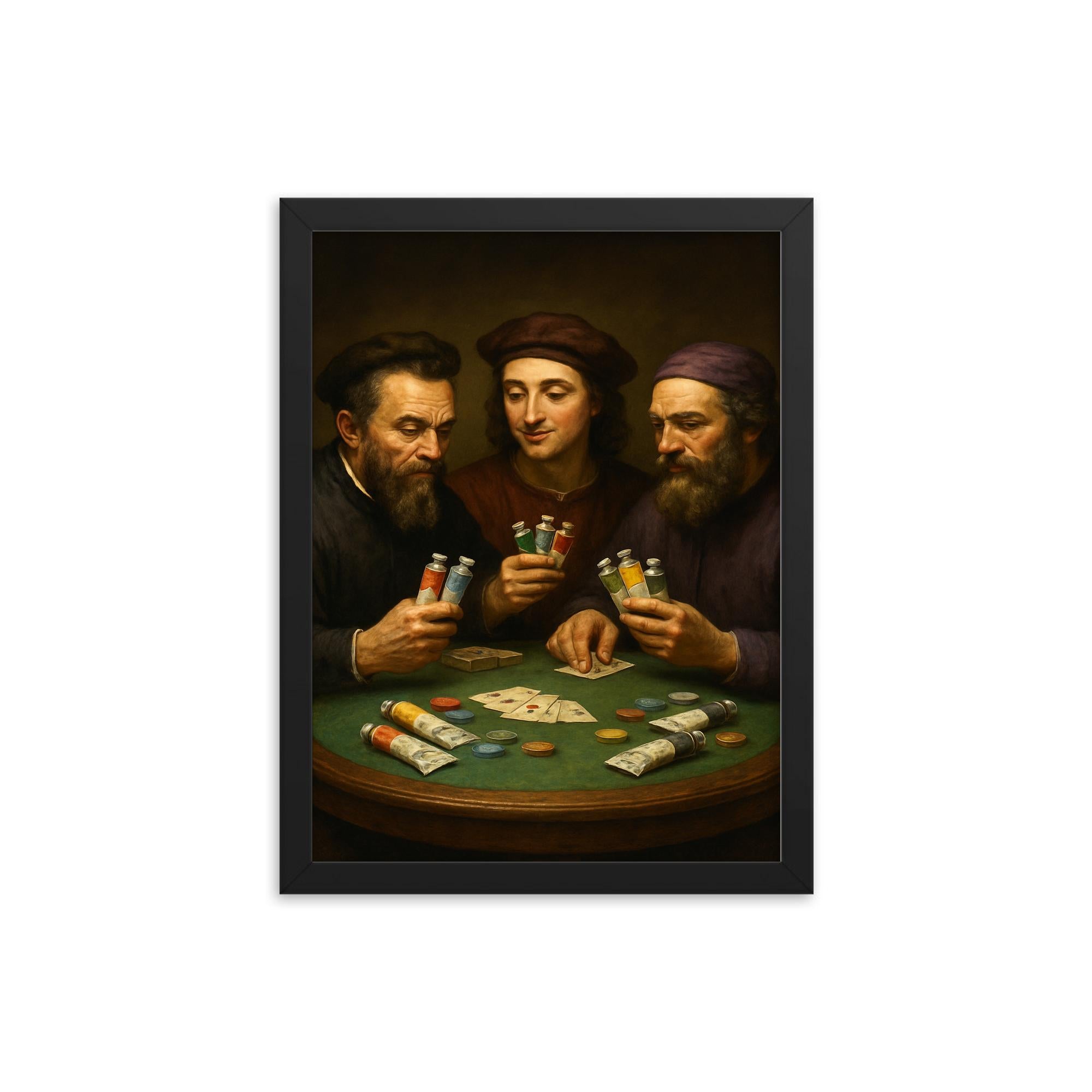 Transform your living space with this striking framed print featuring Michelangelo, Raphael, and Donatello engaged in a playful game of poker—with tubes of paint in hand. This imaginative artwork brings a fresh twist to classic Renaissance icons, making it a unique conversation starter for any art lover or pop culture enthusiast.
