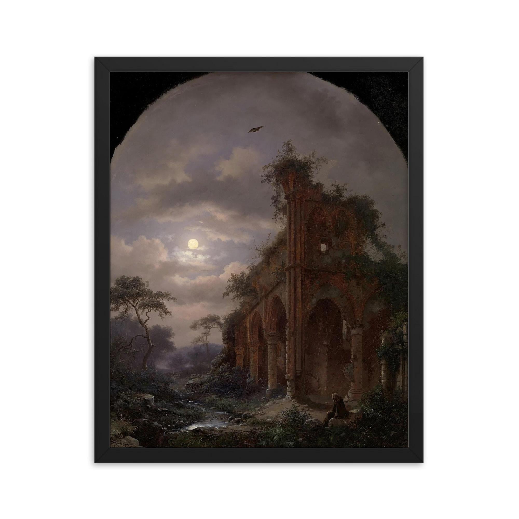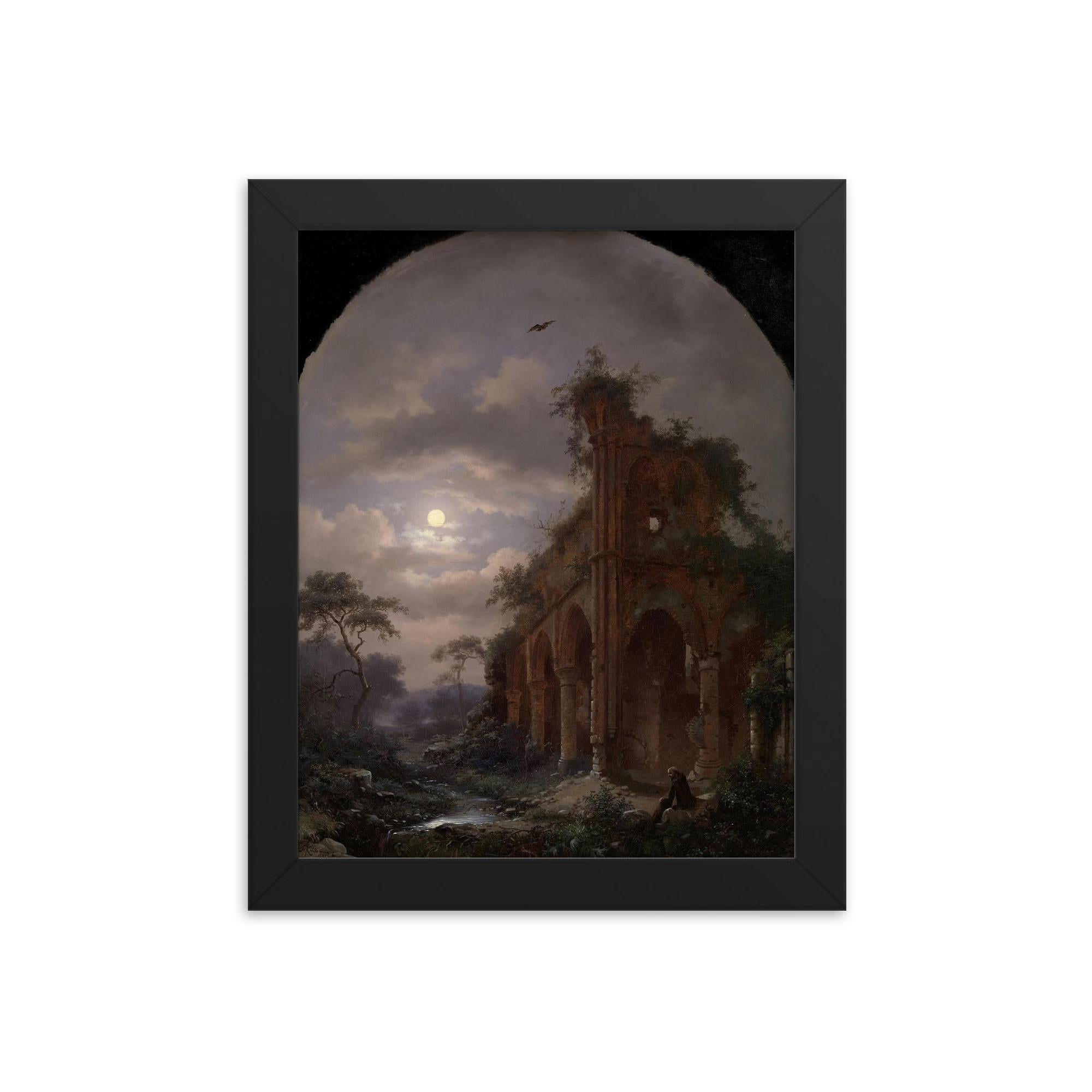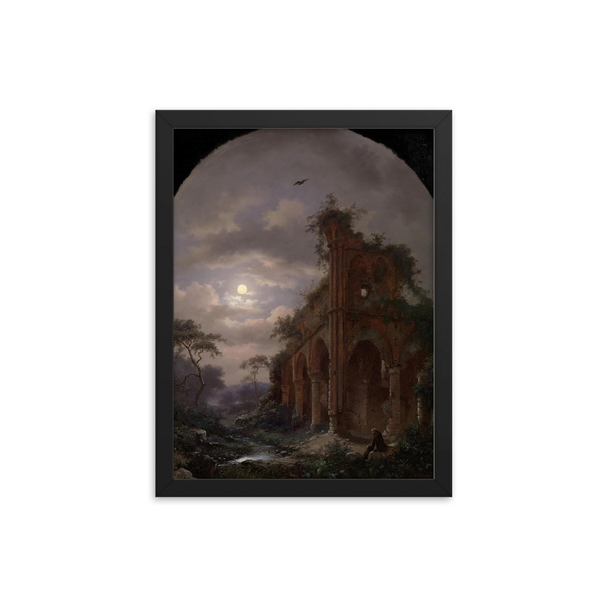 Monk Meditating by Moonlight Framed Art Print – Kruseman 1862 Ruins Landscape Wall Decor, Tranquil Historic Fine Art