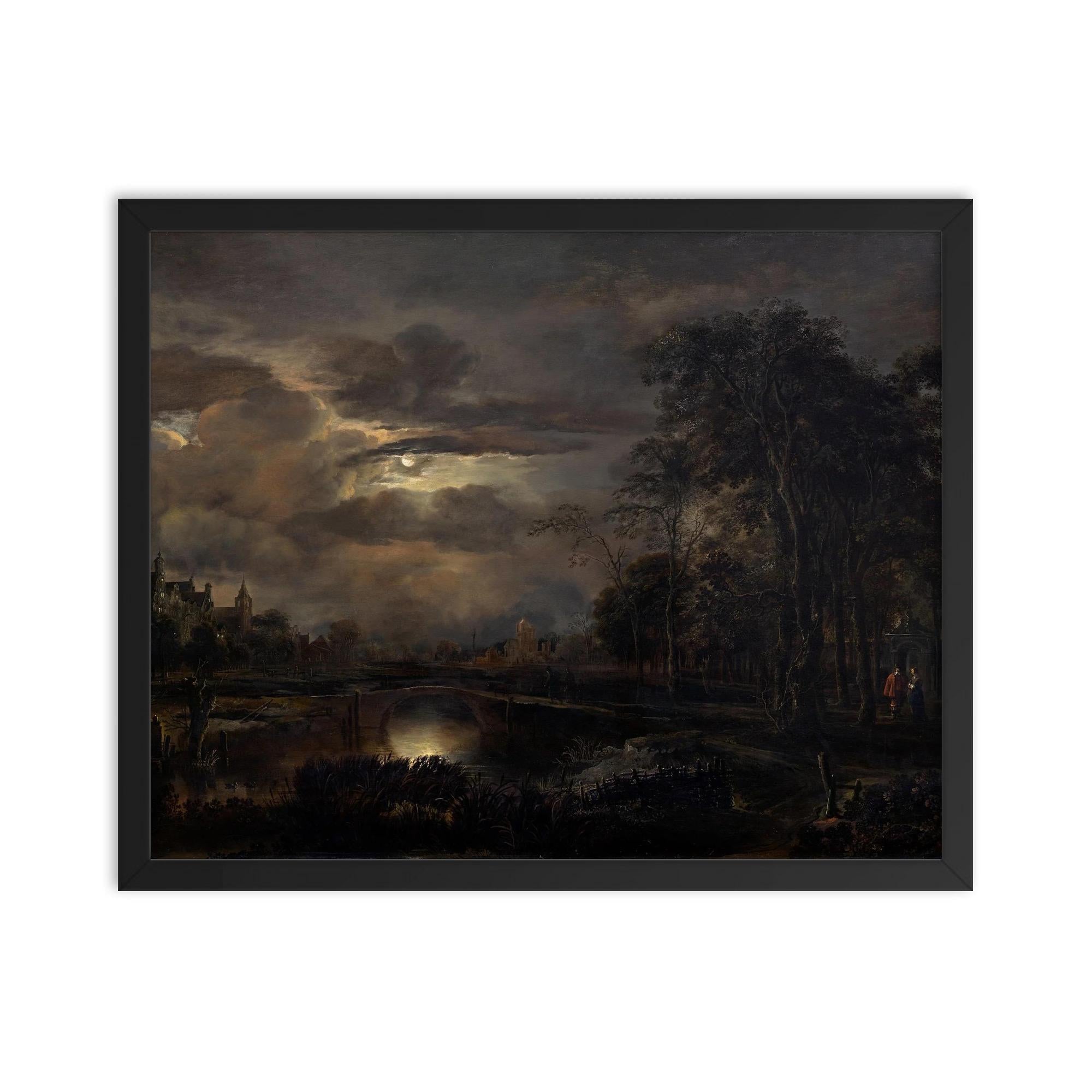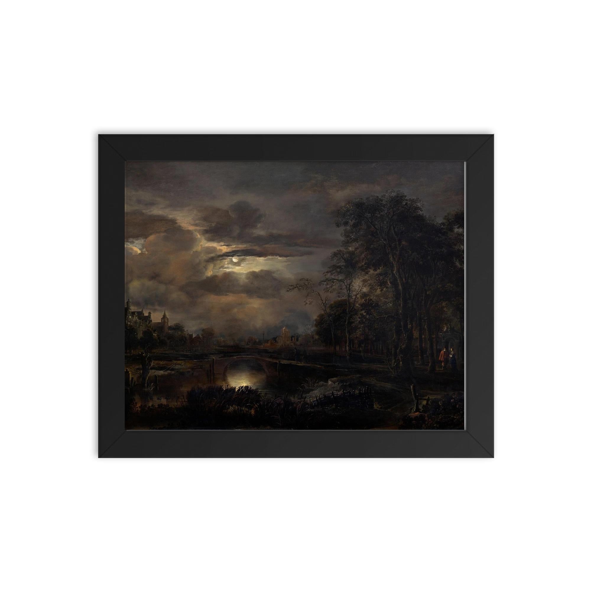 Enhance your living space with timeless elegance through this exquisite framed print of Moonlit Landscape with Bridge by Aert van der Neer, 1648.