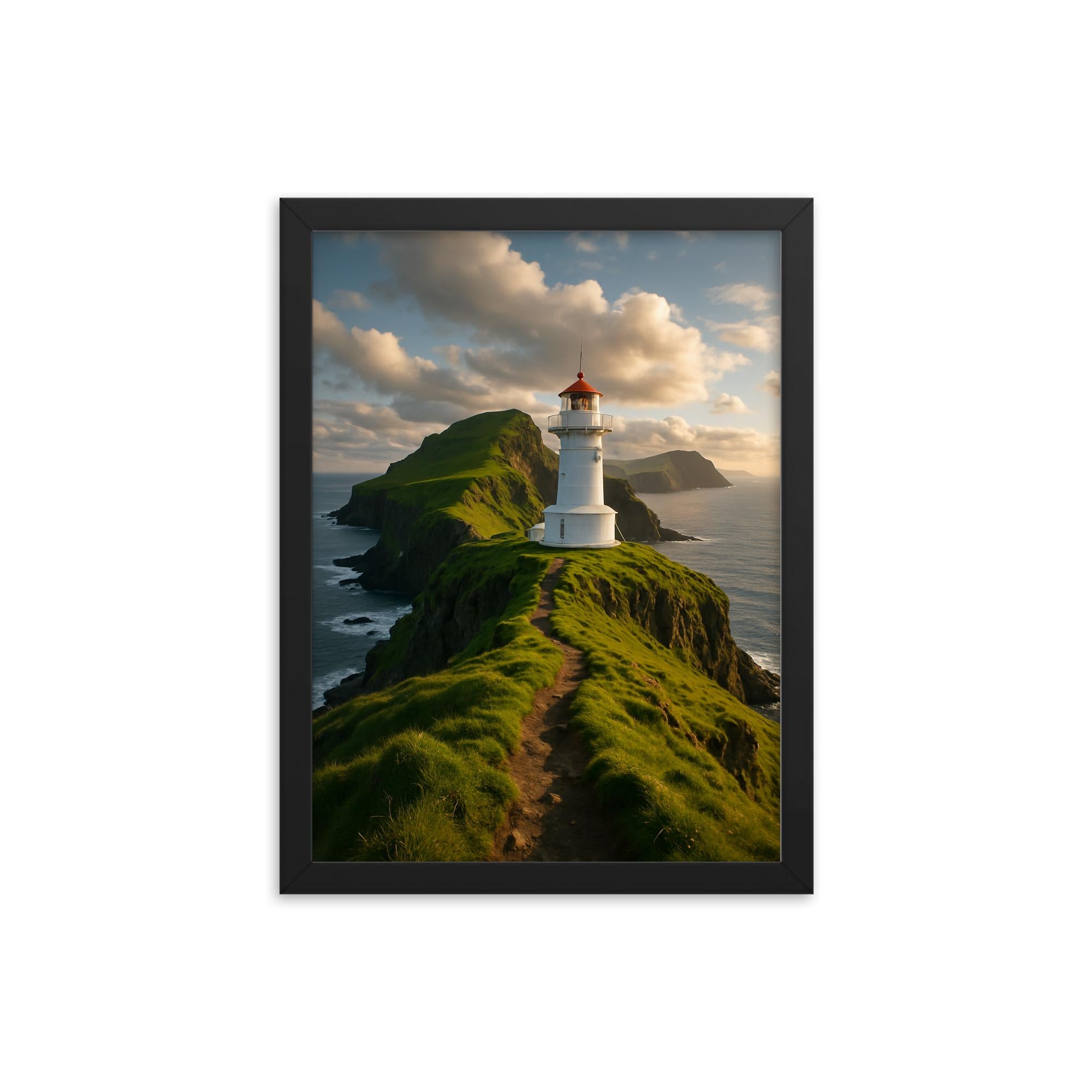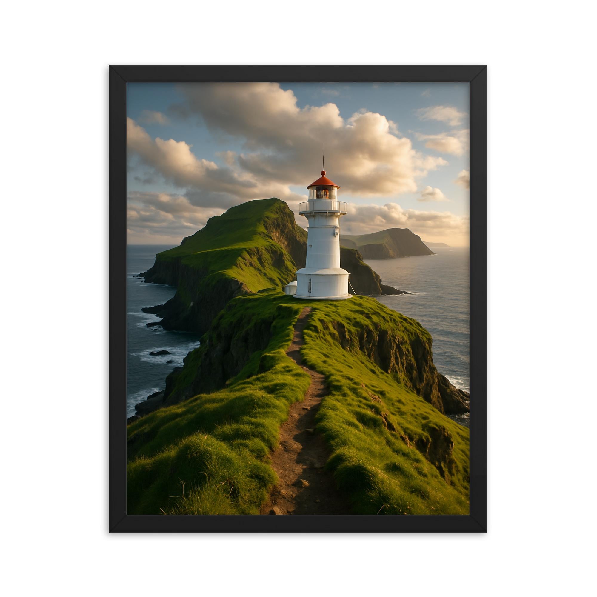 Transform your space with the breathtaking beauty of the Mykines Lighthouse Cliffs Faroe Islands framed print — a striking piece of wall art that invites the serene majesty of the North Atlantic right into your home or office.