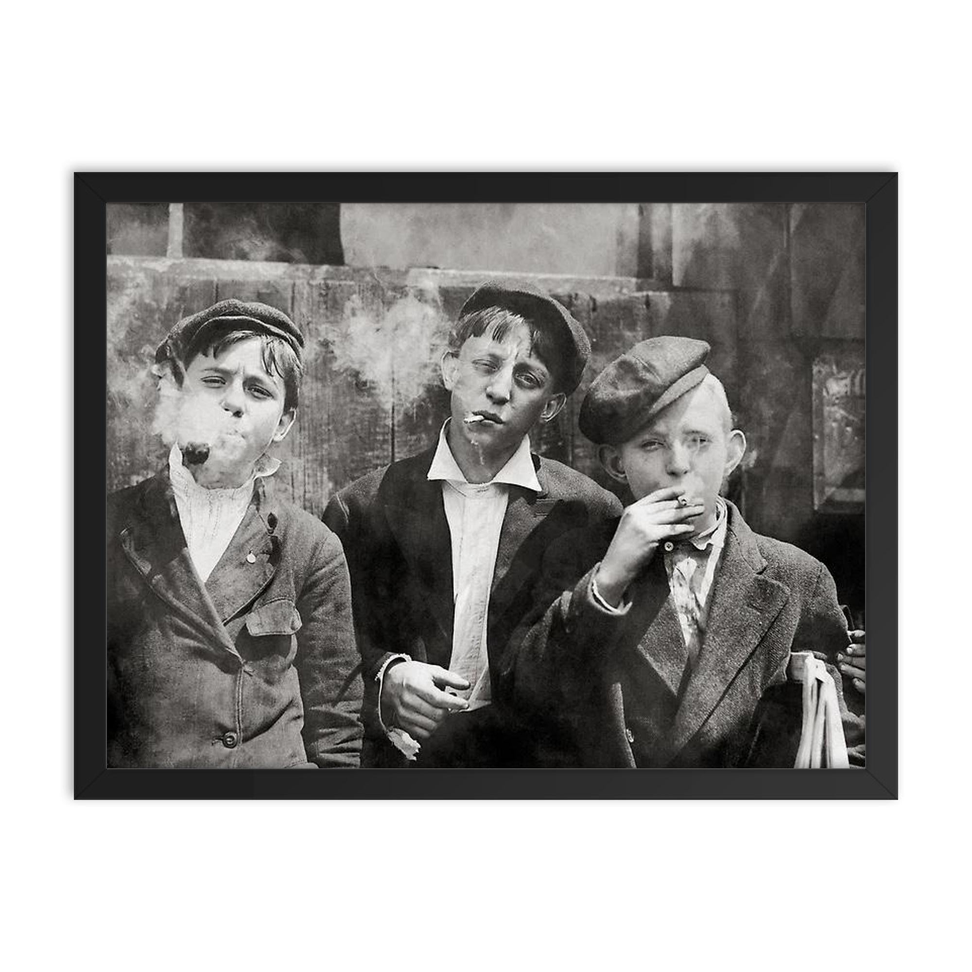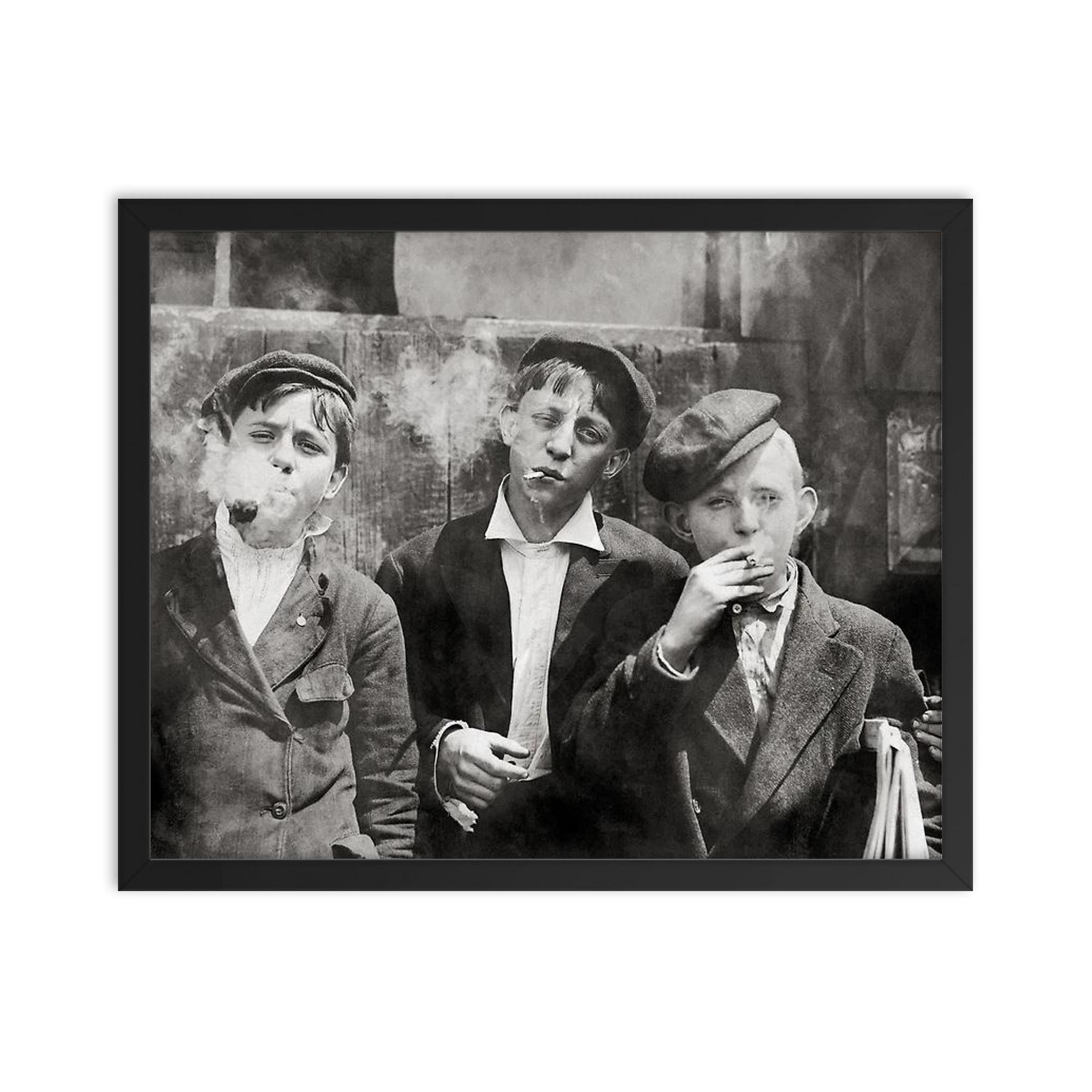 Step back in time with this striking framed print capturing a rare glimpse of life in 1910 St. Louis — Newsies, the young newspaper boys, striking a bold pose while smoking, embodying the grit and spirit of a bygone era.