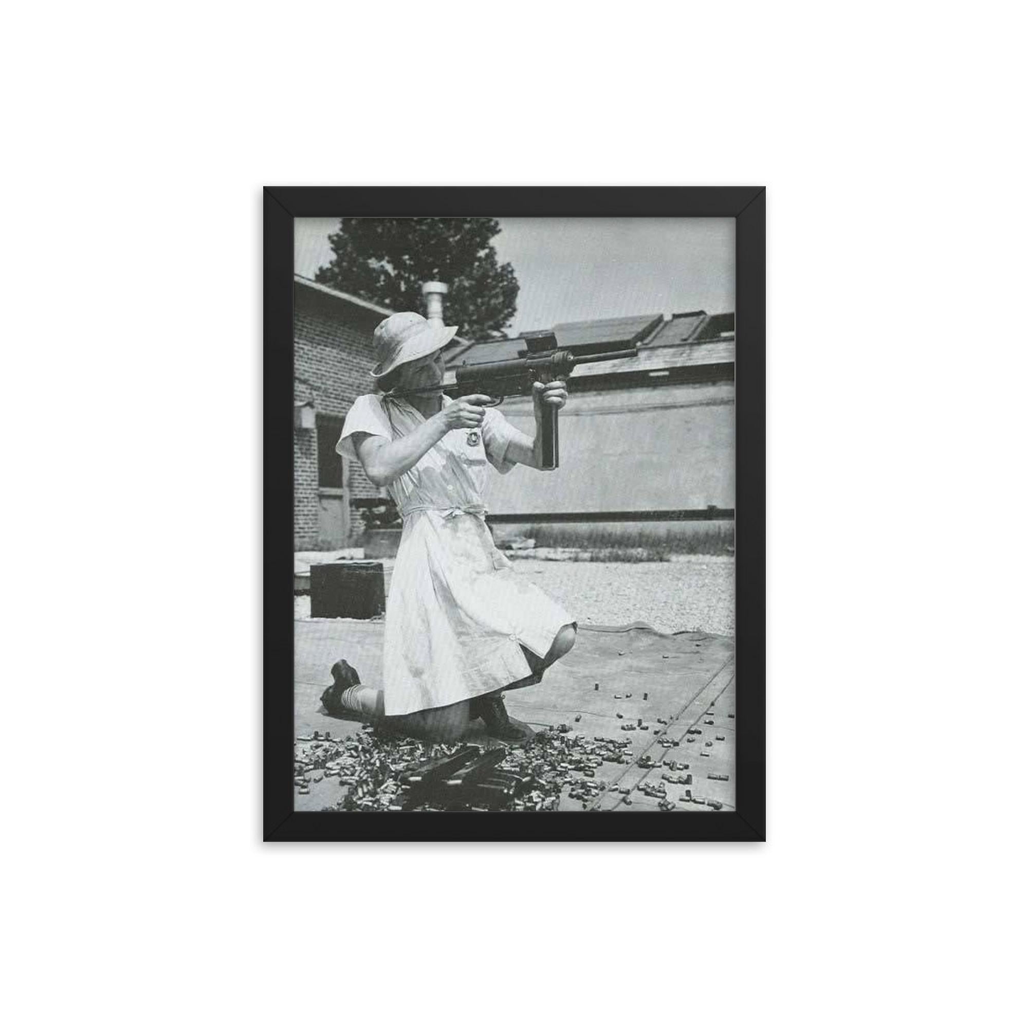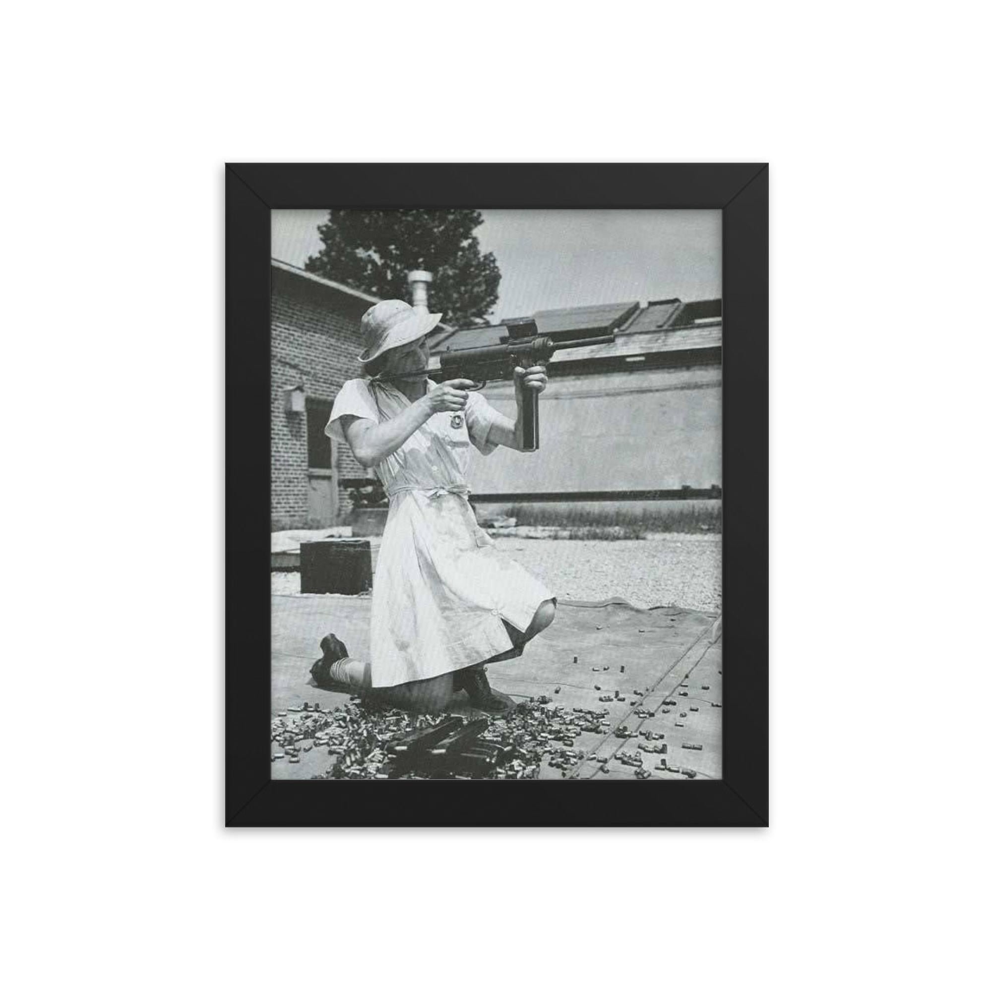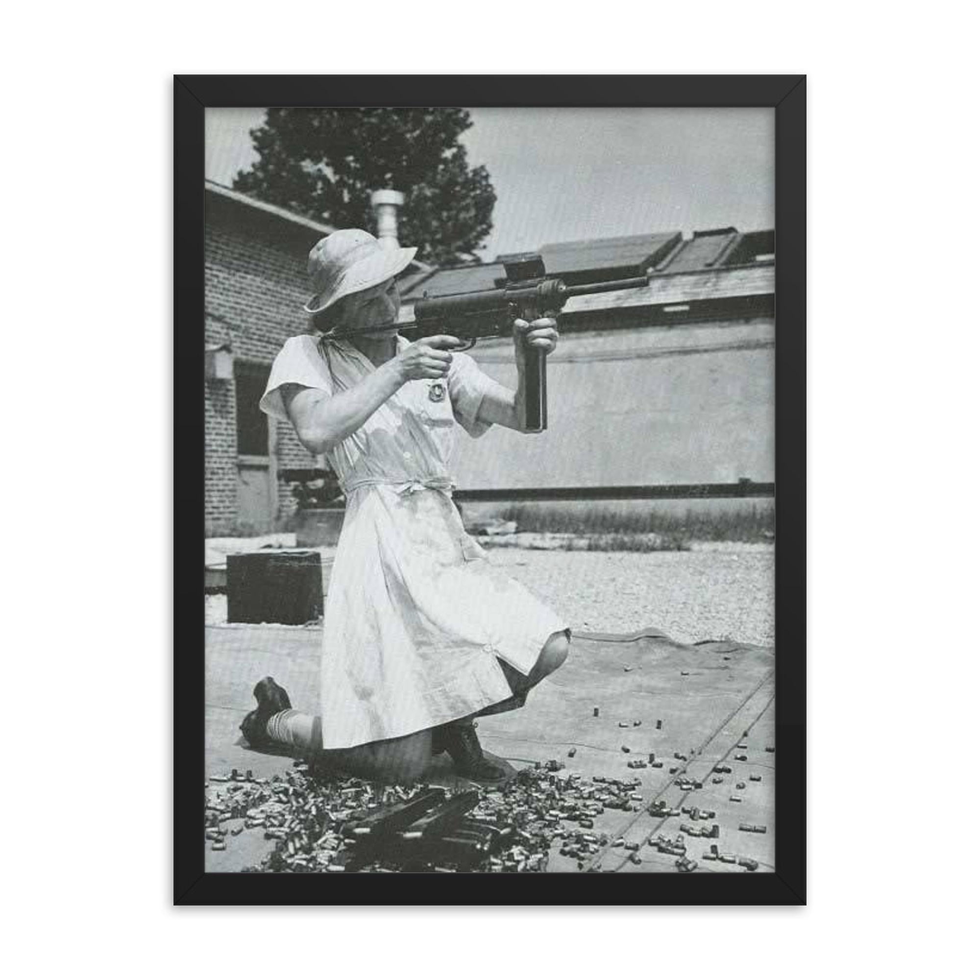 Step into history and celebrate the untold stories of courage with this museum-quality framed print: Nurse with an M-3 Grease Gun, WWII 1940s.