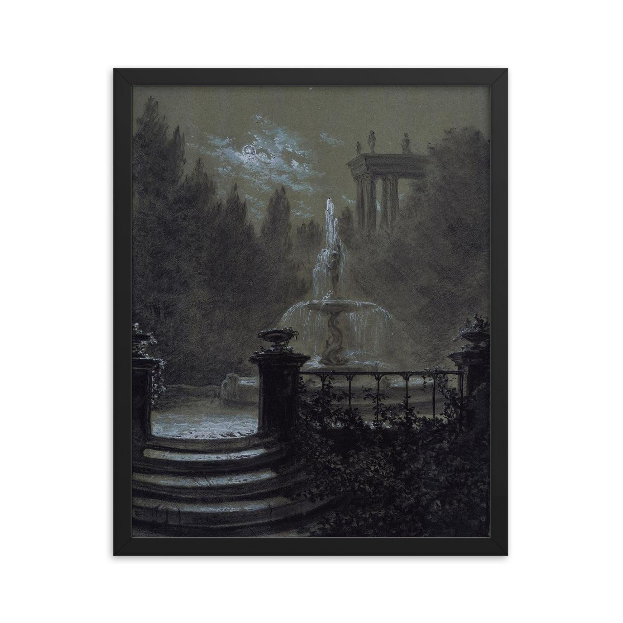 Add a touch of timeless elegance to your space with this framed print of Park with a Fountain in the Moonlight by Carl Gustav Carus, 1851. Transform your wall with a masterpiece from the Romantic era, inviting an atmosphere of calm sophistication into your home, office, or gallery.