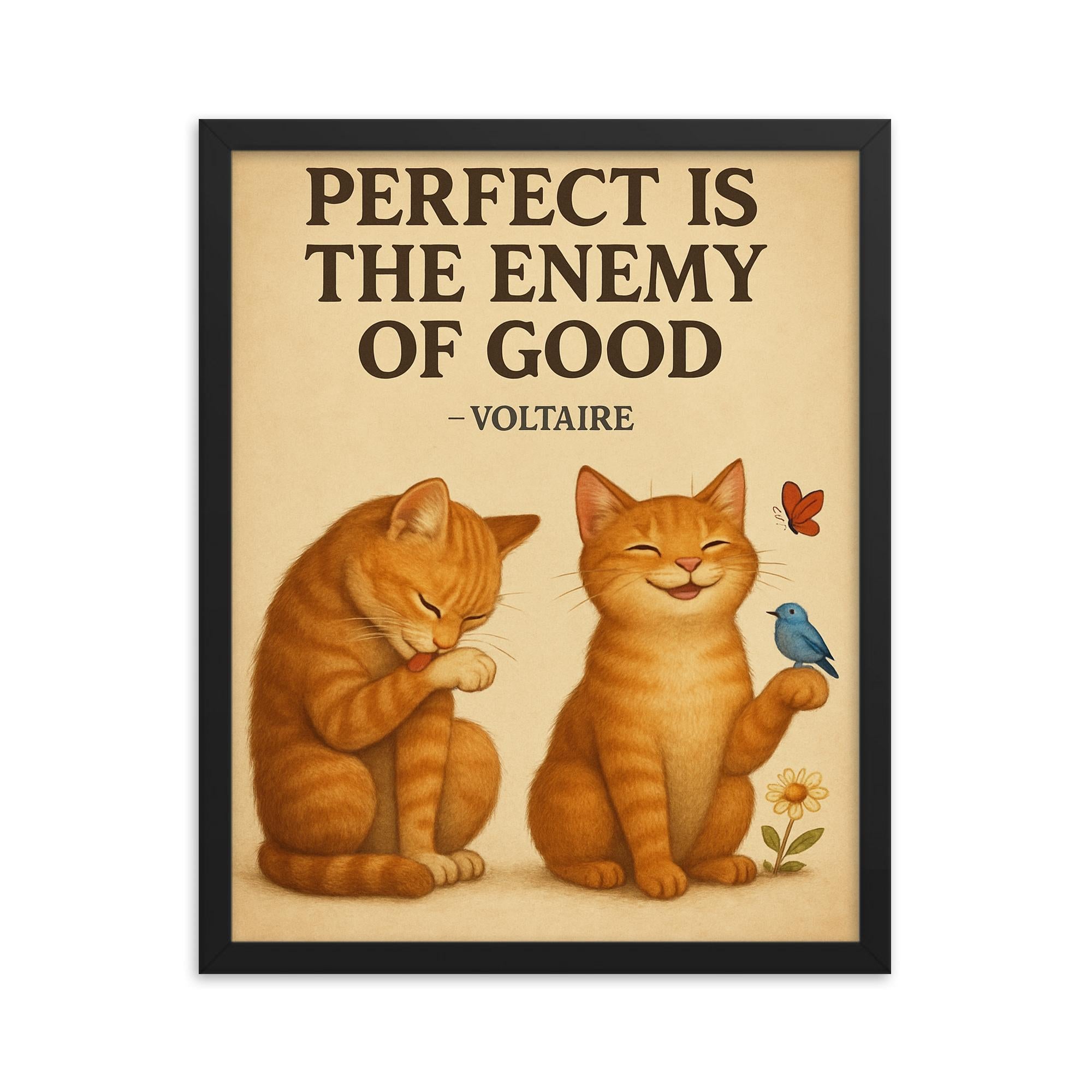 Upgrade your space and your mindset with this captivating framed wall art: “Perfect Is The Enemy of Good” inspired by Voltaire—tailored for every perfectionist who wants to let go and simply enjoy life, just like the contented cat featured in this iconic design.