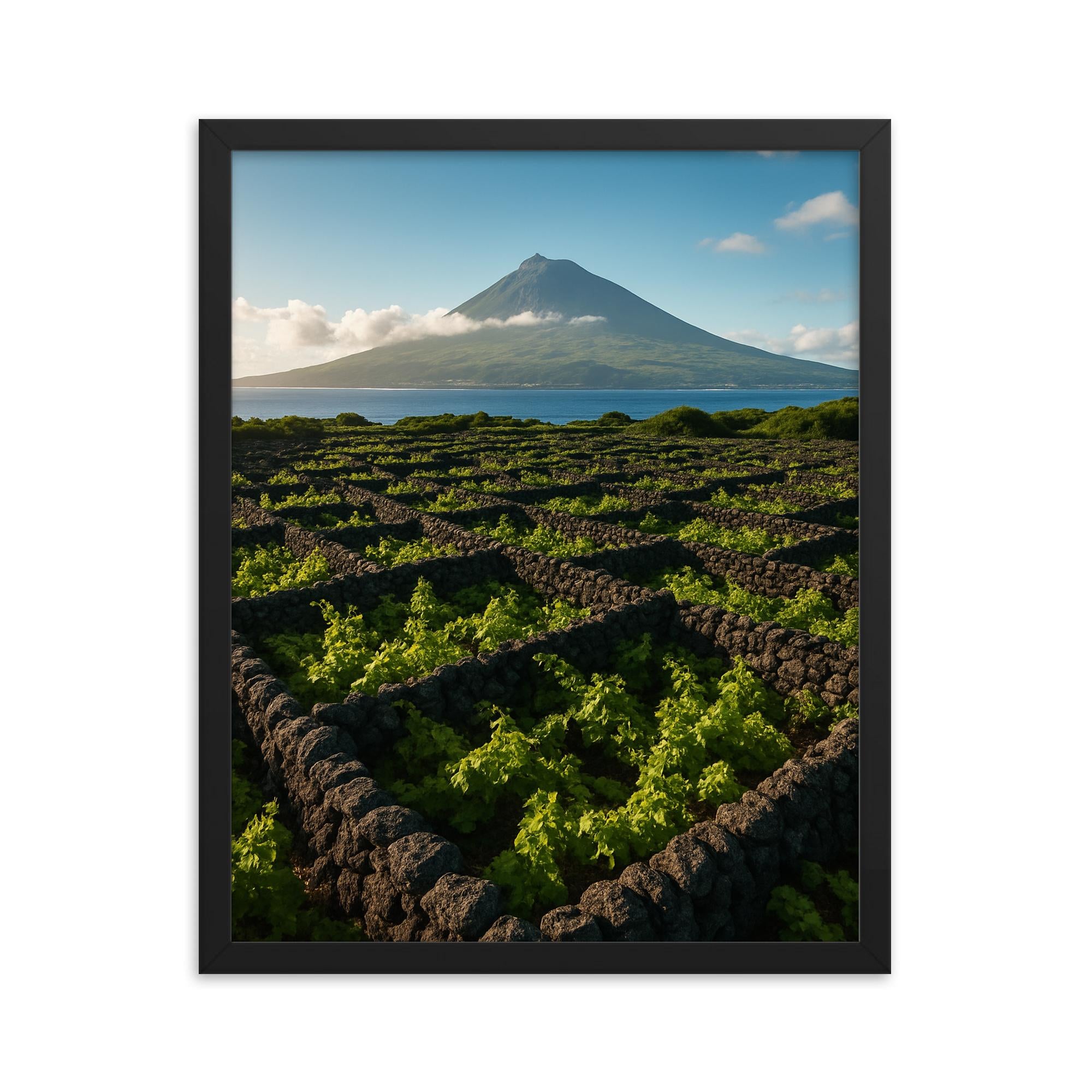 Transform your space with the timeless charm of our framed print featuring the iconic Pico Island Vineyard Walls in Currais, Azores, Portugal.