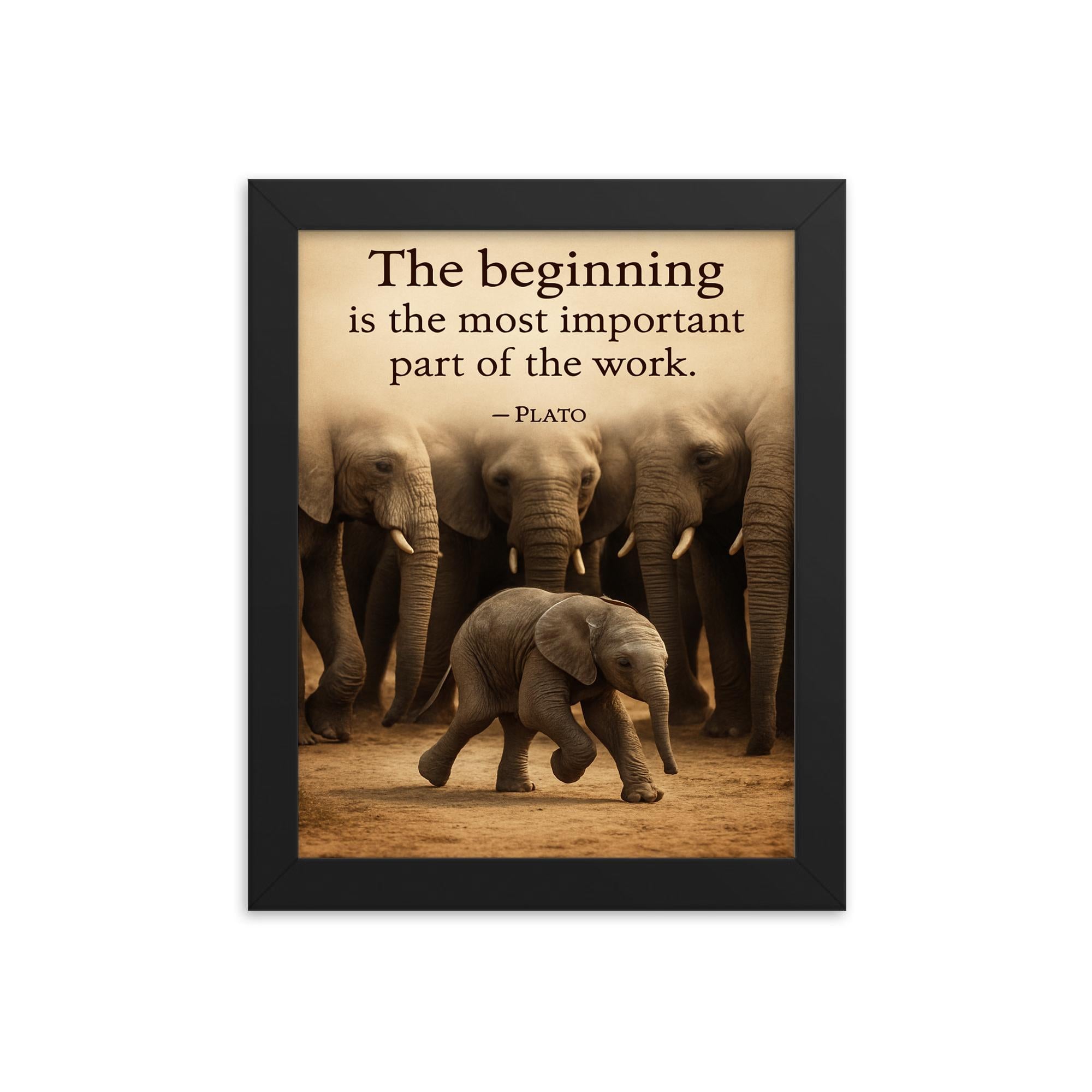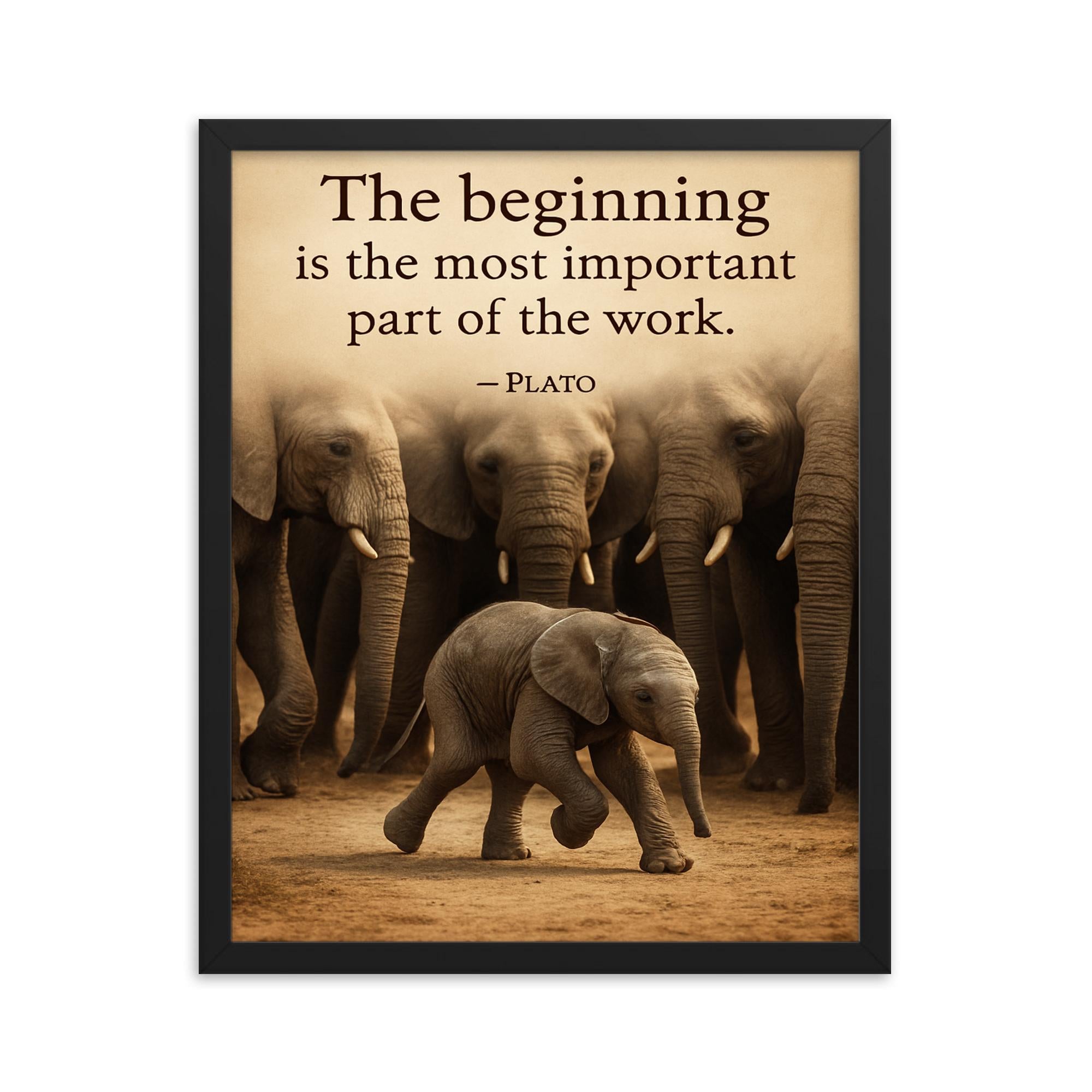 Framed Plato Quote Wall Art – Inspiring Baby Elephant Taking First Step, Motivational Herd Watching Print, Unique Home Decor Gift