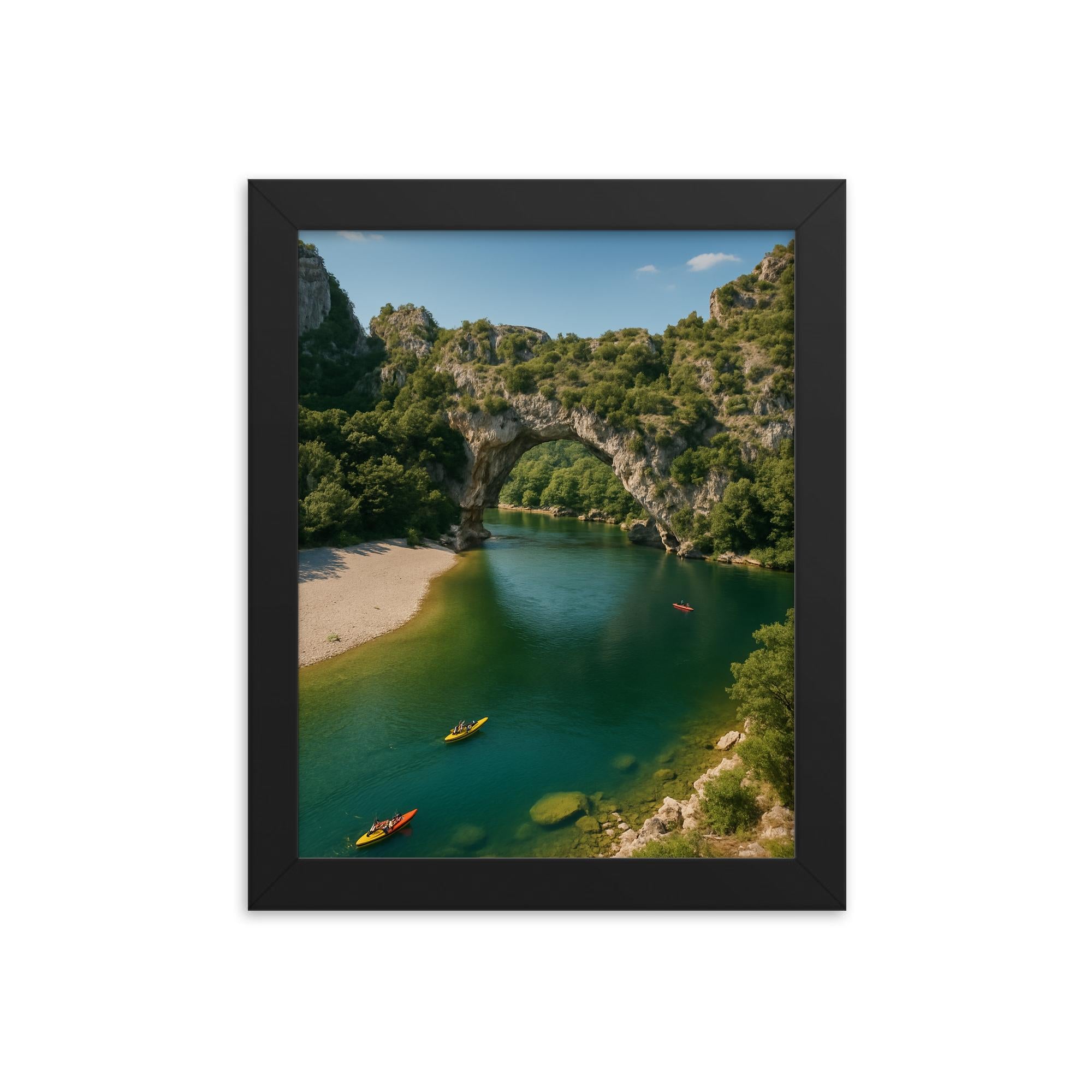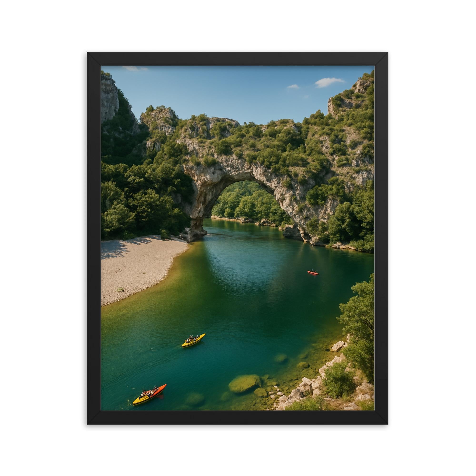 This framed print captures the majestic natural arch carved by the Ardèche River, bringing a touch of serene beauty and timeless adventure into your home or office