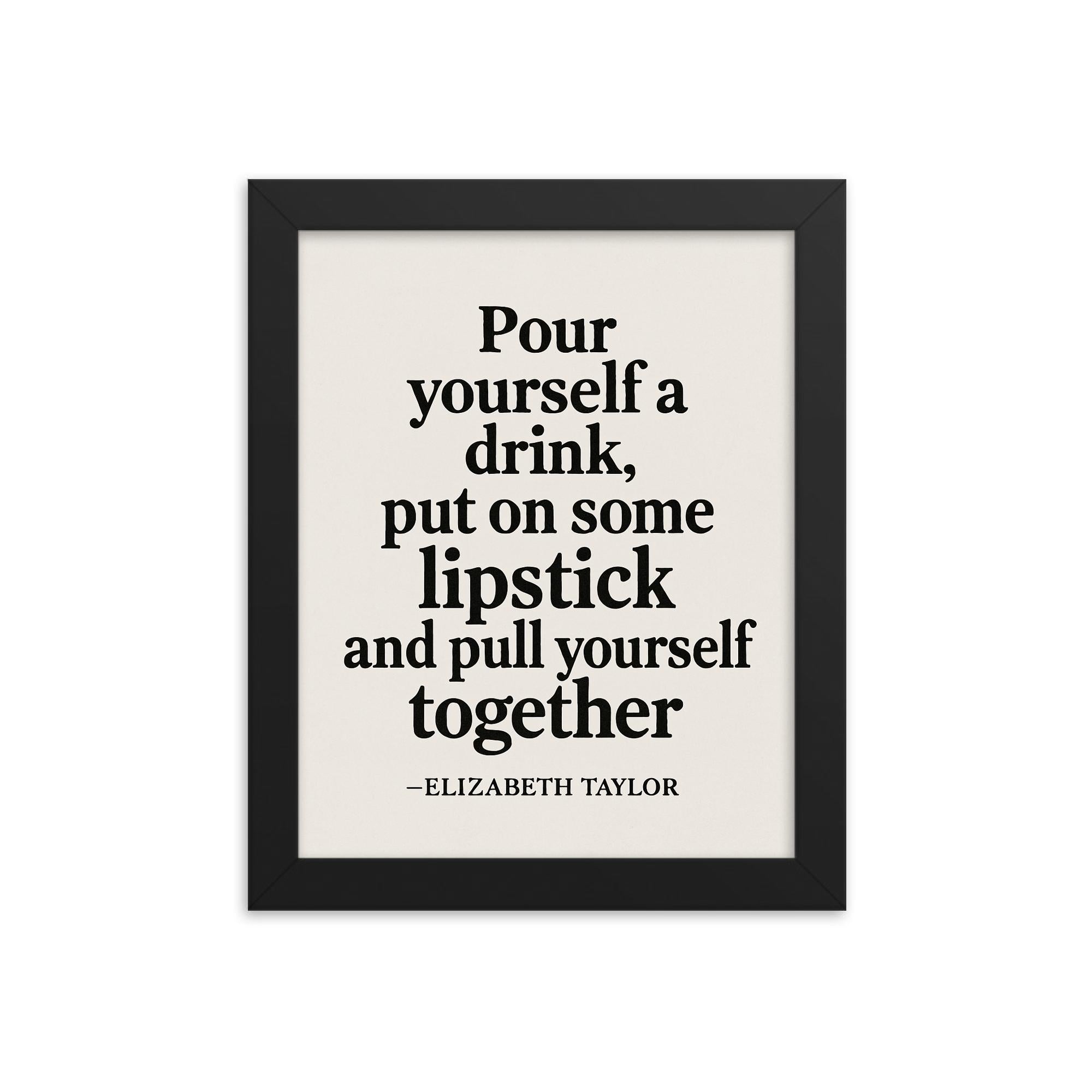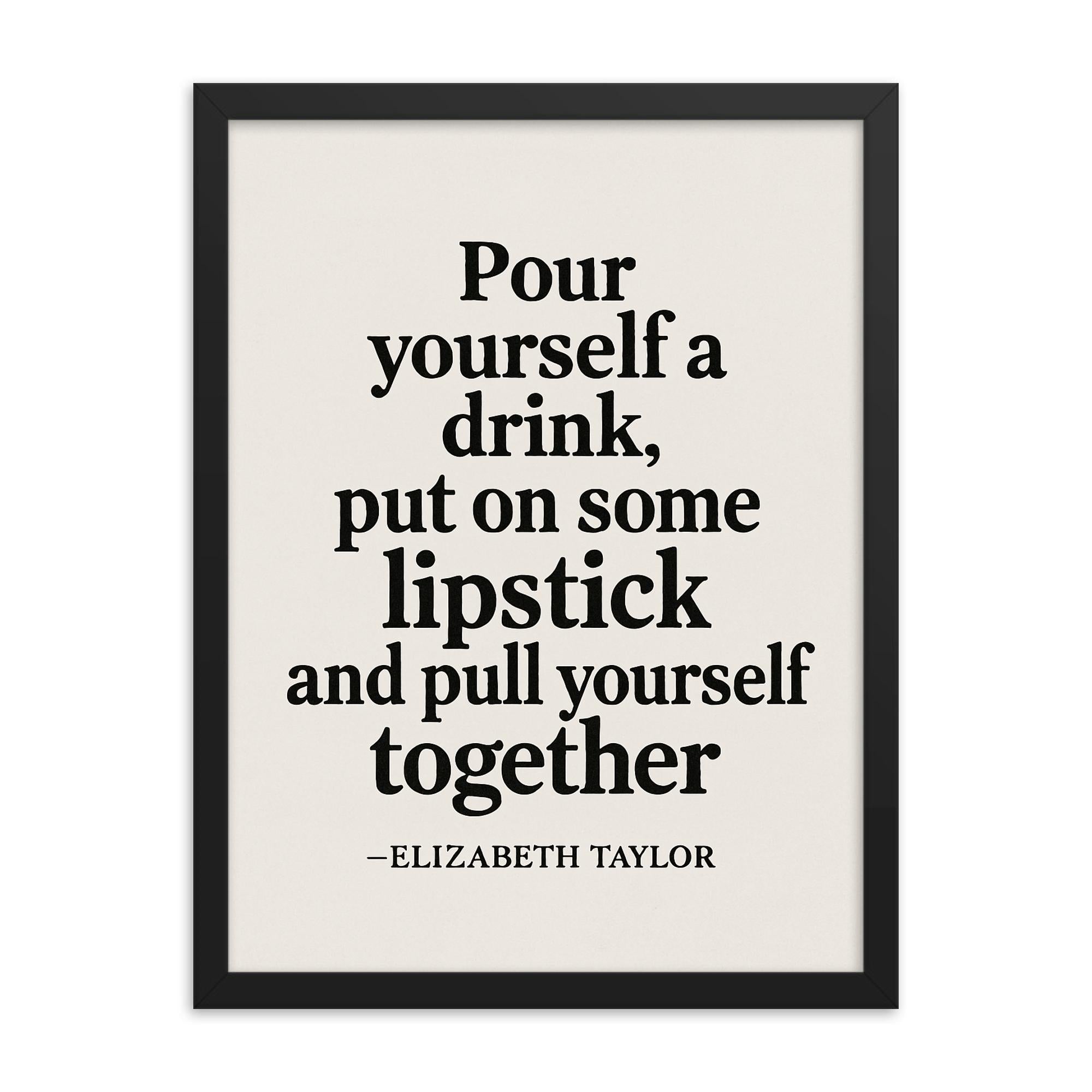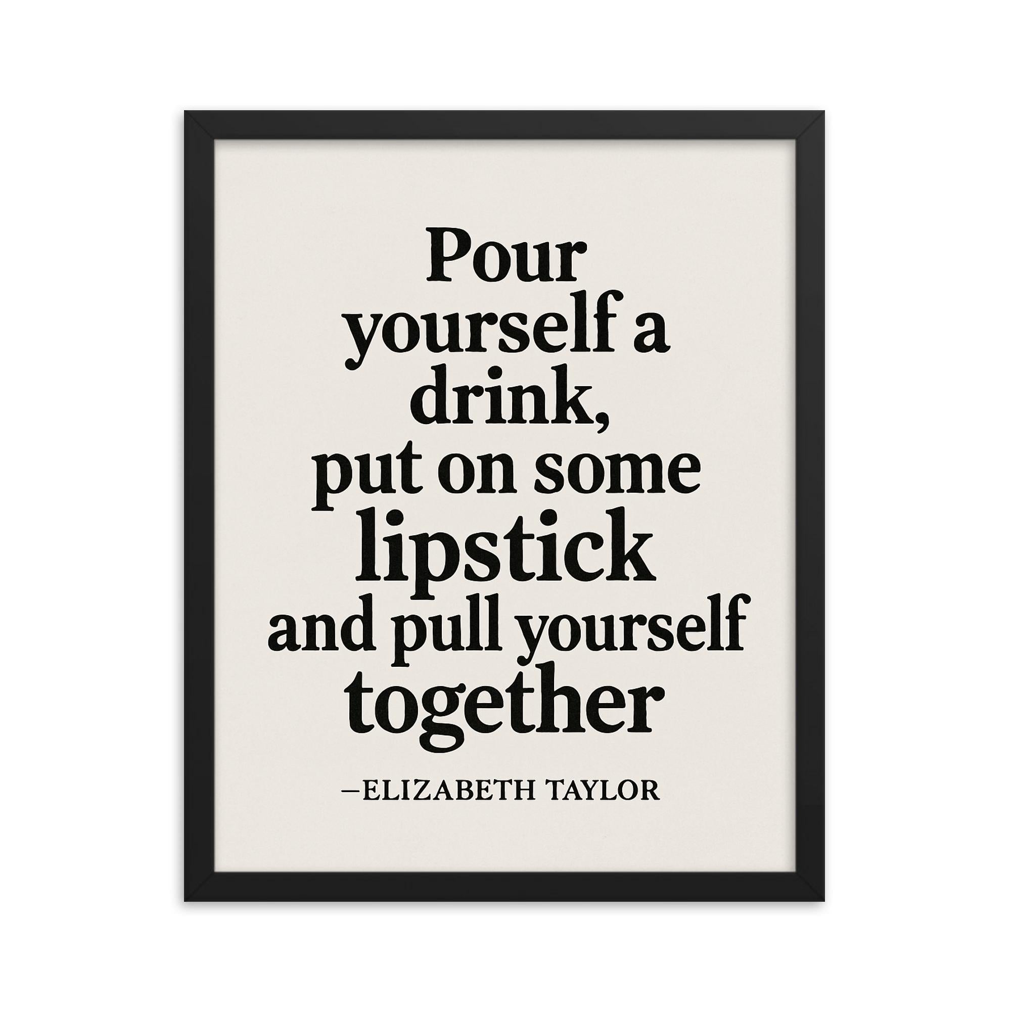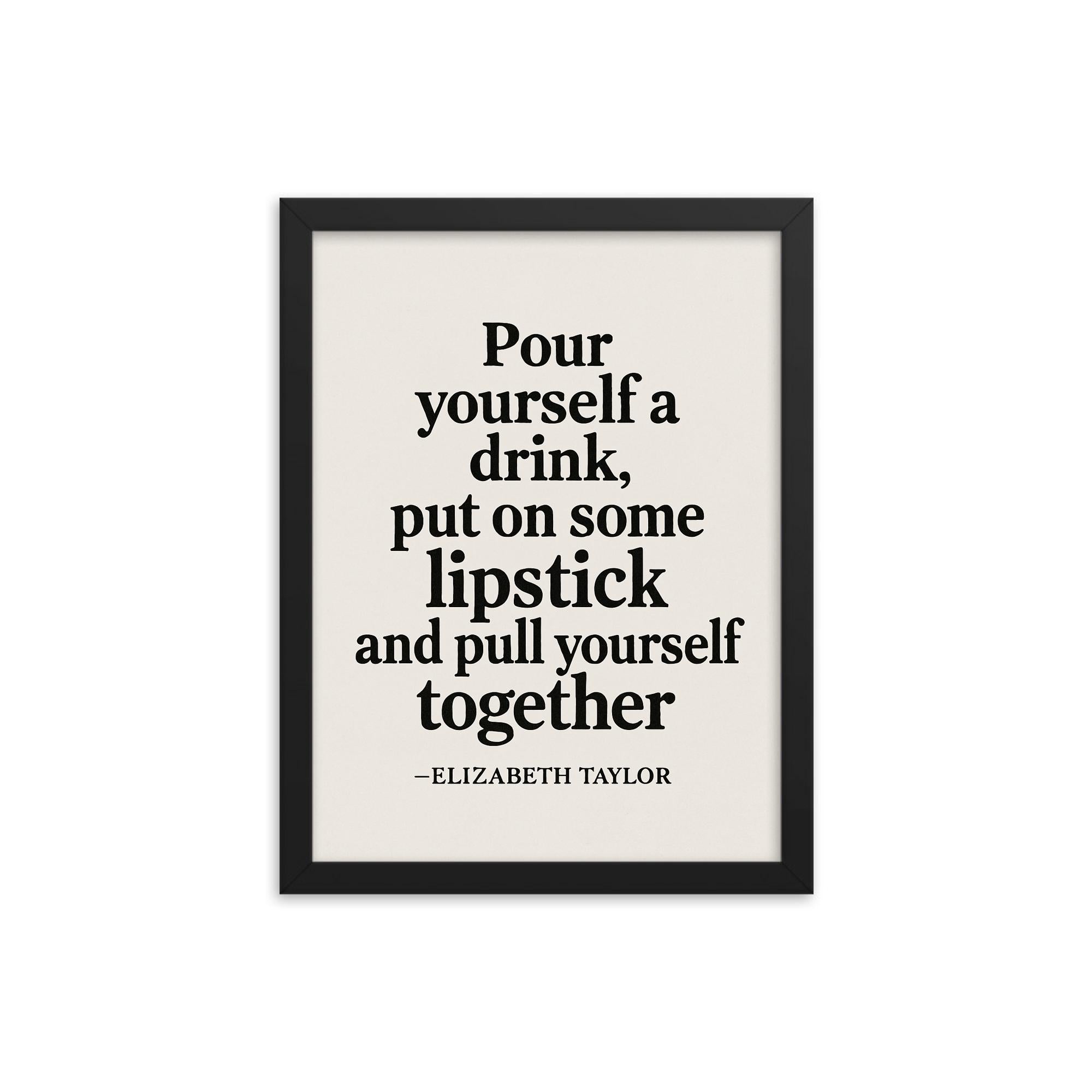 Bring timeless confidence and vintage glamour into your home with this framed print featuring the iconic words of Elizabeth Taylor: Pour yourself a drink, put on some lipstick, and pull yourself together.