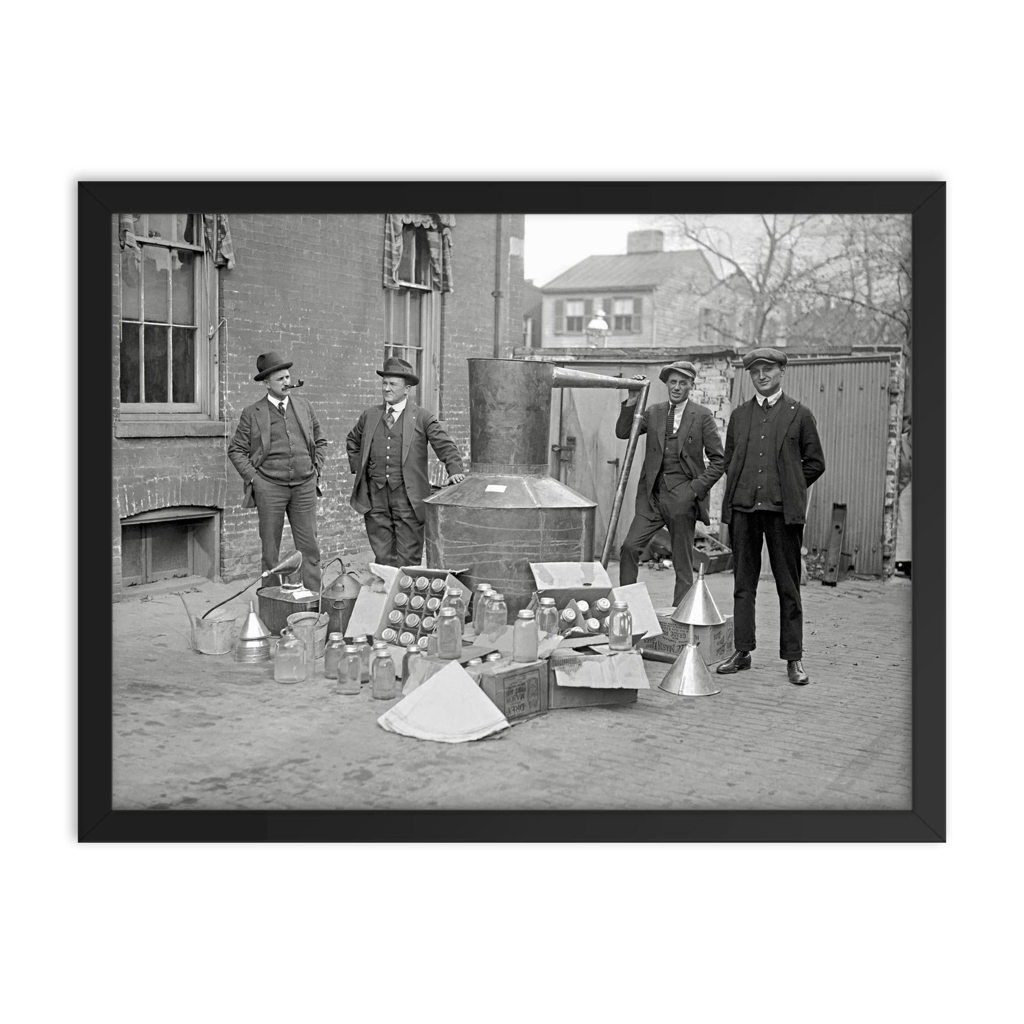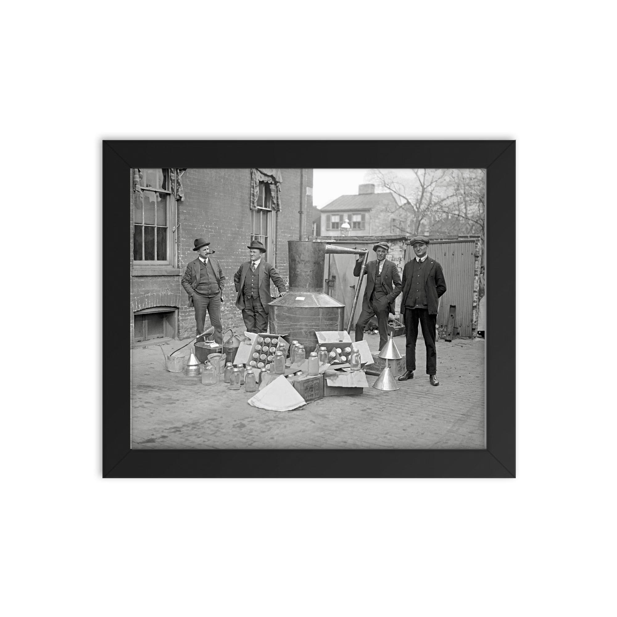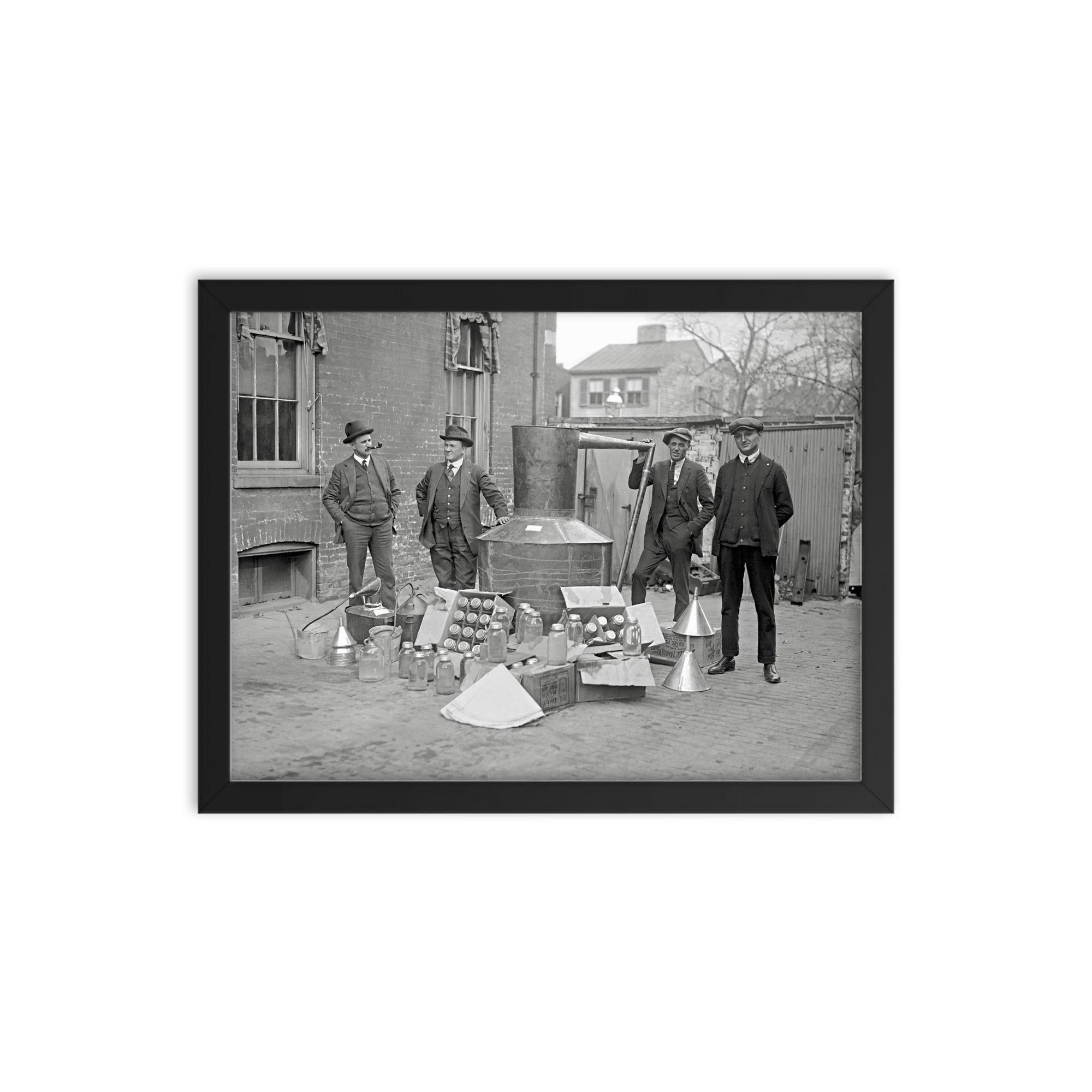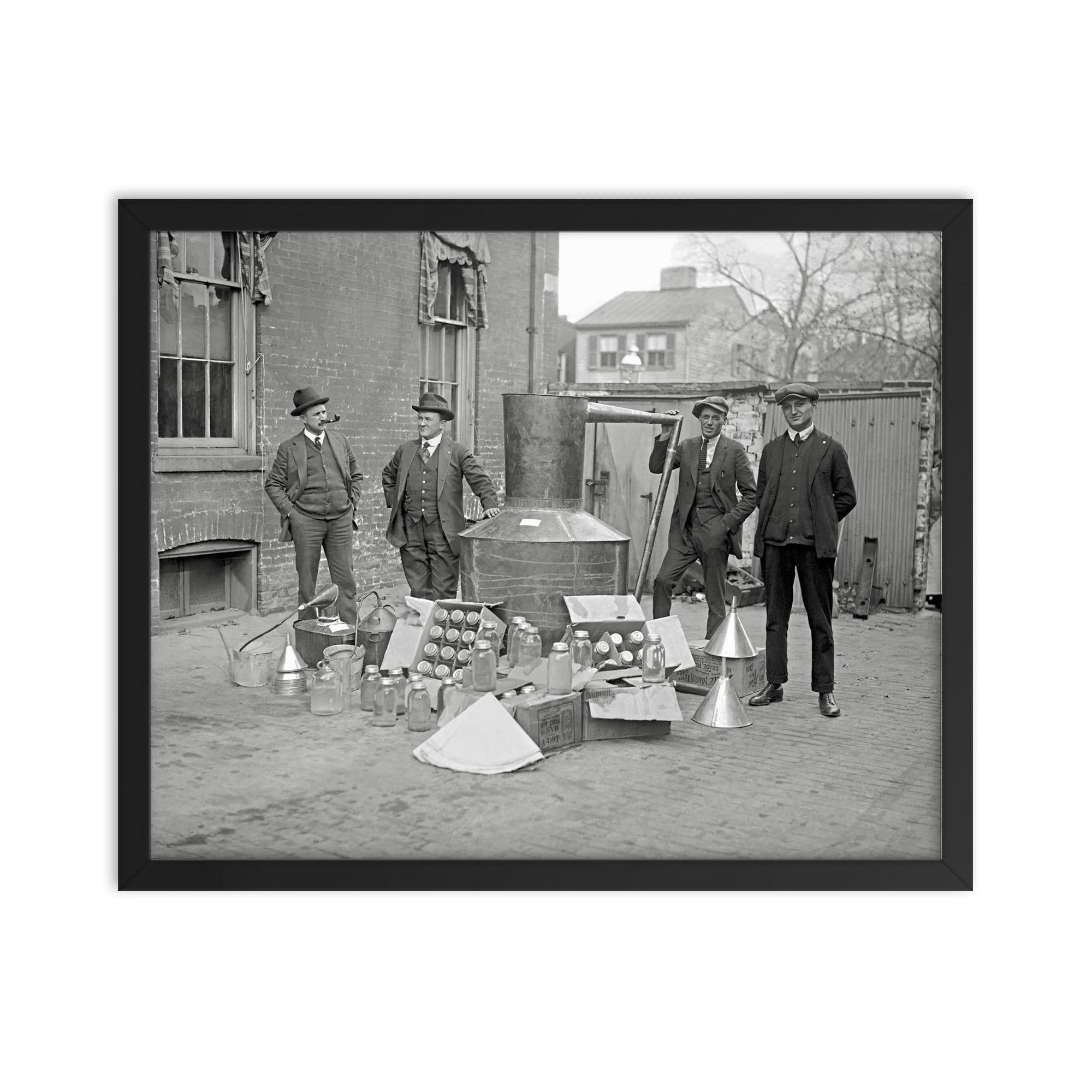 Step into a pivotal moment in American history with this striking framed print of Prohibition Agents posing alongside a large still and moonshine equipment seized in Washington, DC, 1922.