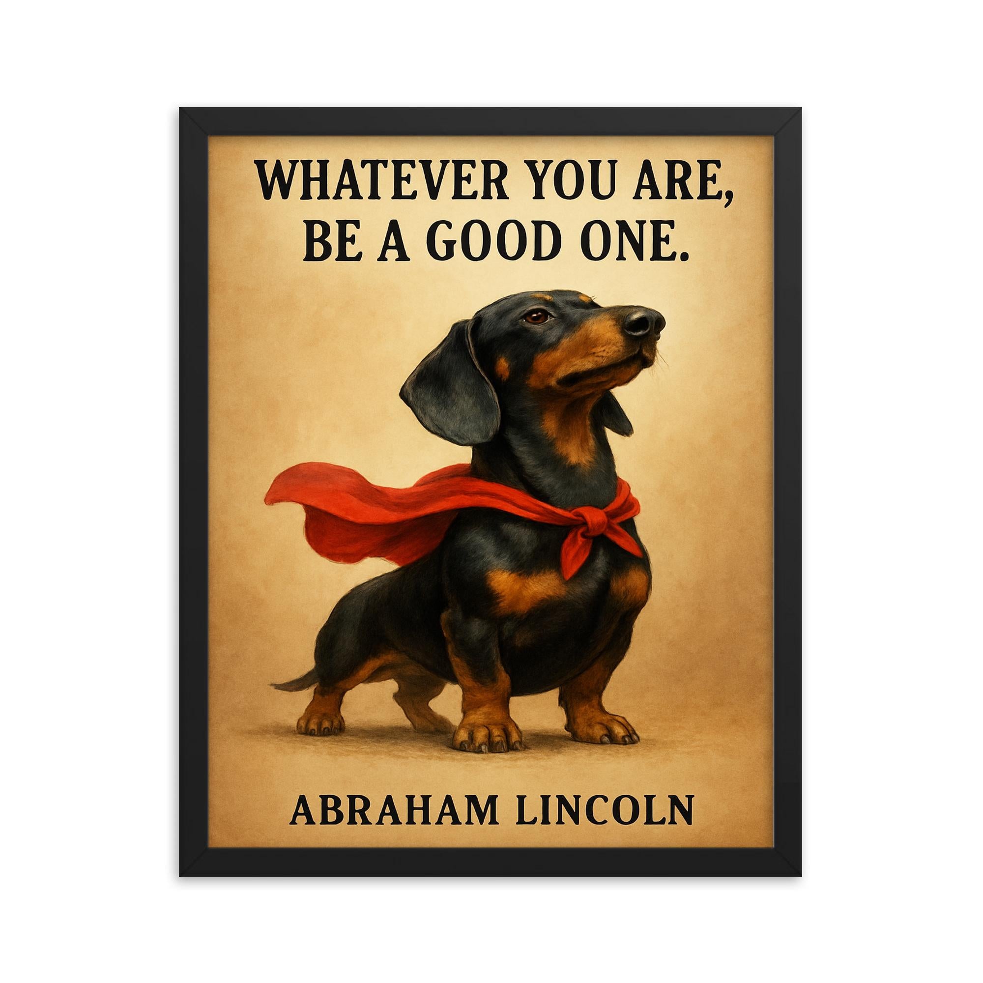 Meet your new favorite piece of wall art—a framed print that fuses everyday inspiration with irresistible charm. Featuring a proud dachshund clad in a superhero cape alongside Abraham Lincoln’s timeless wisdom *Whatever you are, be a good one*, this framed print is designed to uplift your spirit and bring a smile to any room.