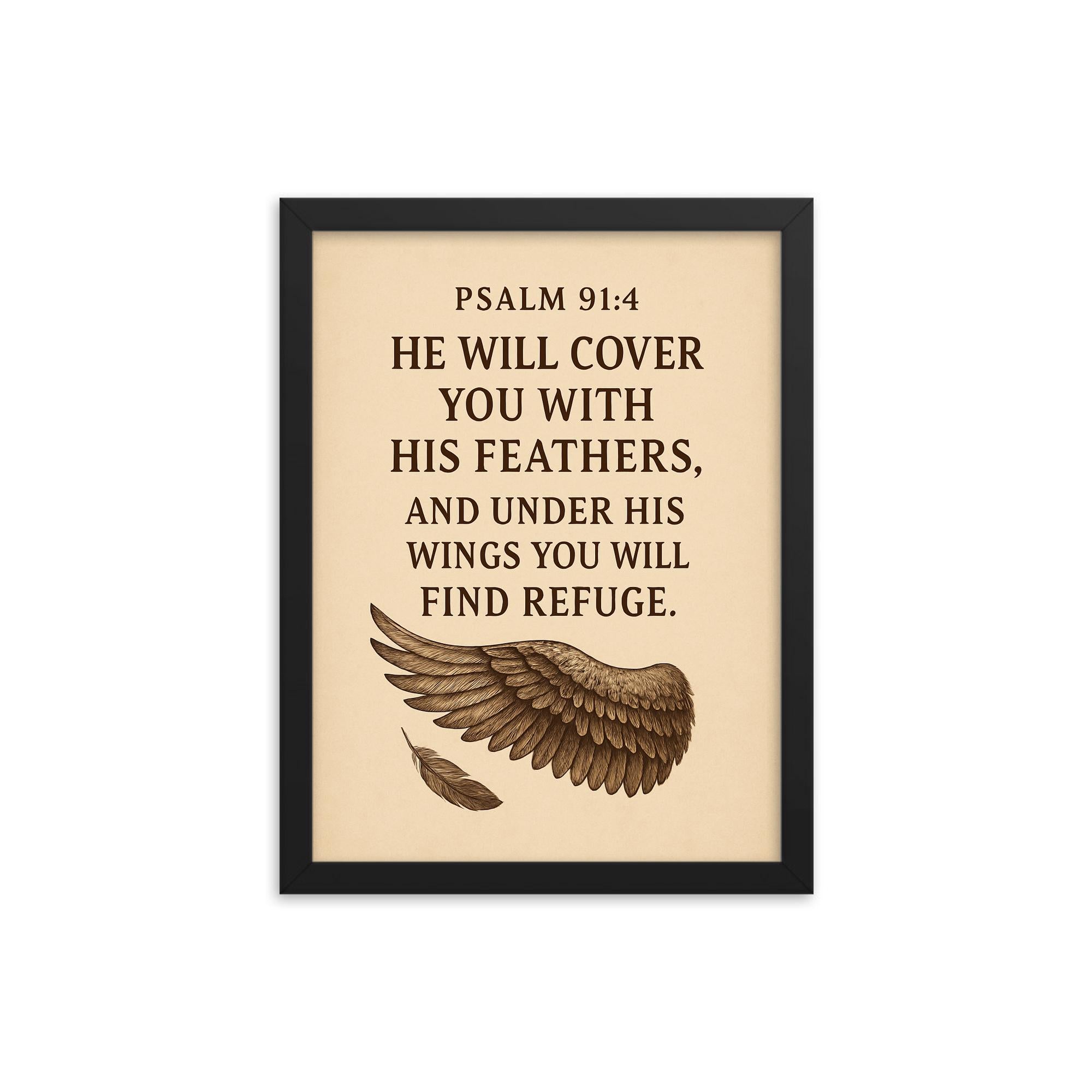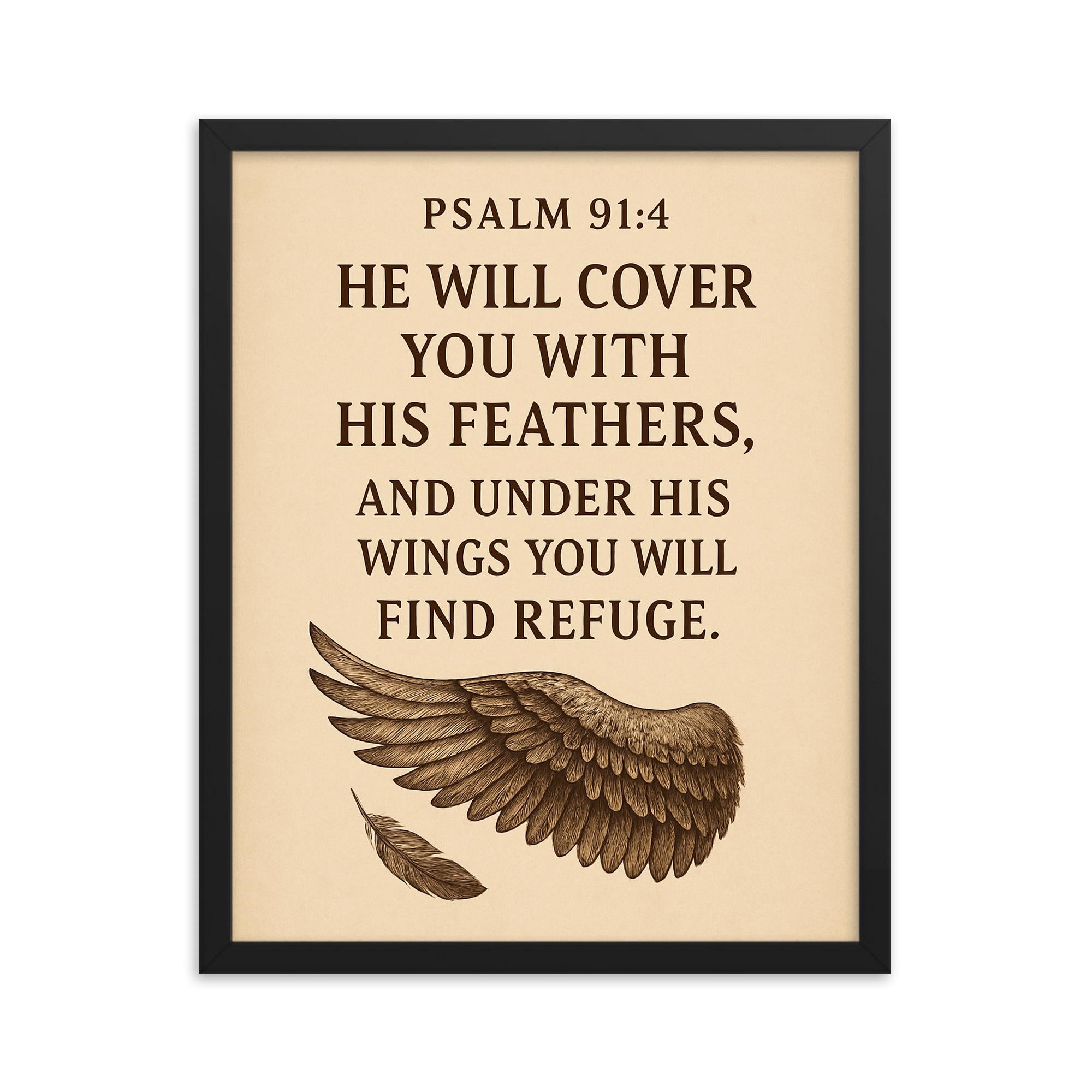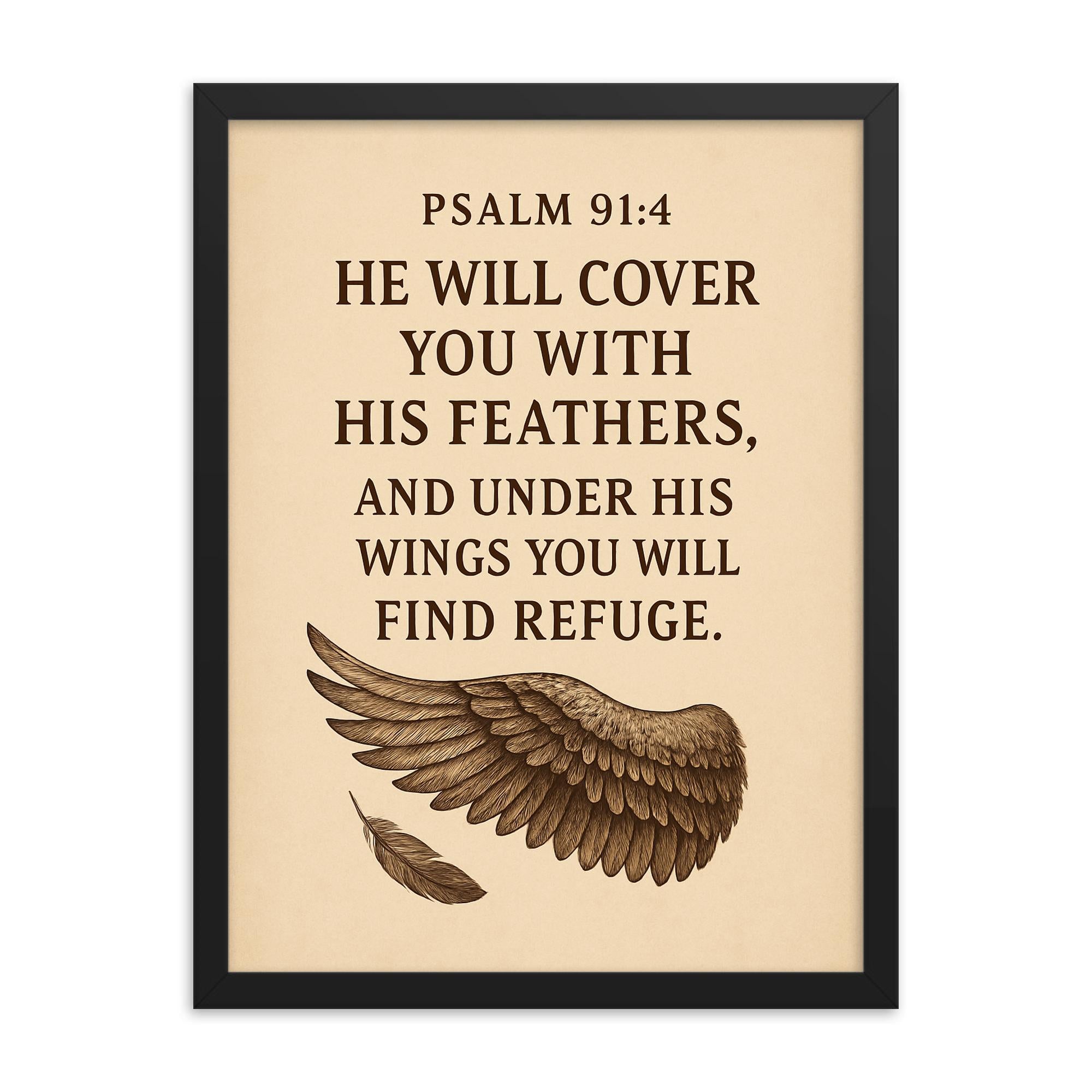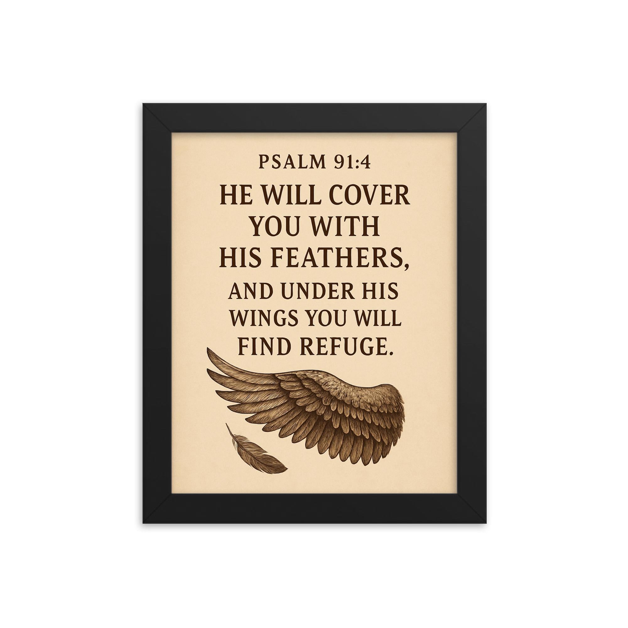Elevate your space with timeless inspiration through this beautifully crafted framed print of Psalm 91:4 — He will cover you with his feathers and under his wings you will find refuge.