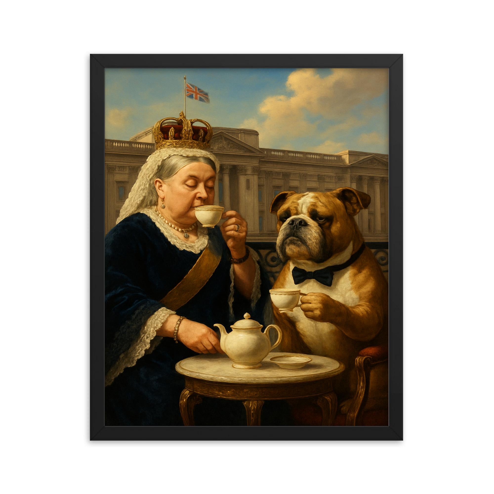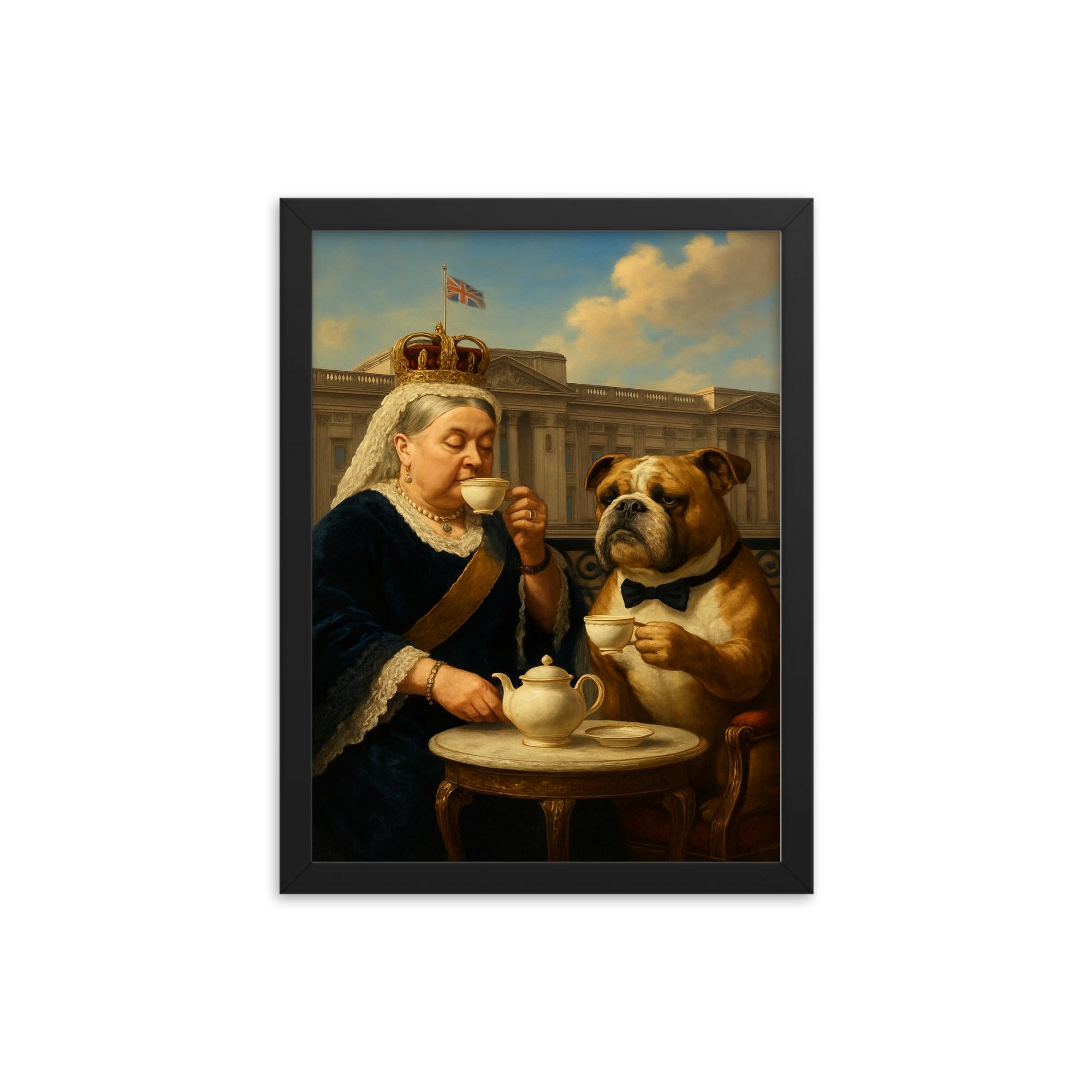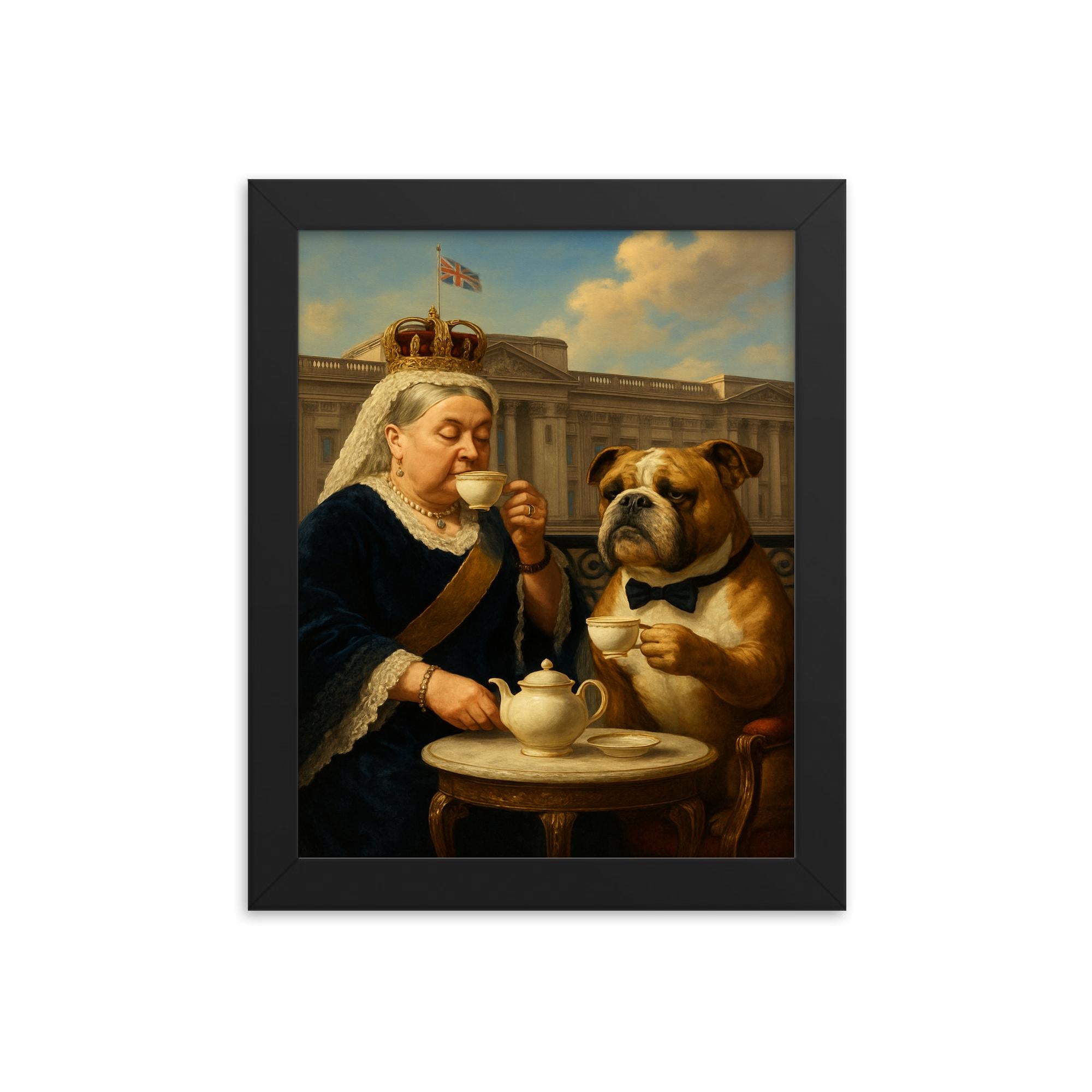 Elevate your living space with a timeless framed print capturing an unforgettable moment of regal charm: Queen Victoria sipping tea alongside a dignified bulldog at Buckingham Palace. This exquisite wall art combines history and elegance, making it a captivating centerpiece for any room.