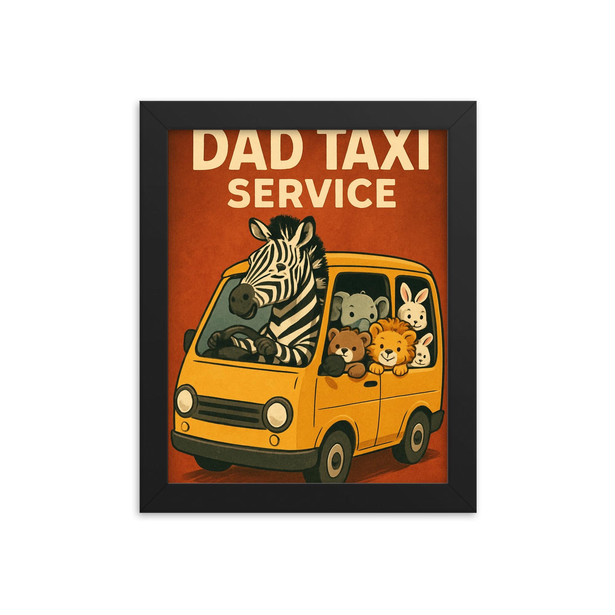 Meet the hilarious and charming wall art that’s winning hearts everywhere: our Dad Taxi Service framed print. This whimsical poster features a zebra at the wheel of a minivan, chauffeuring a lively crew of baby animals. It’s a joyful nod to all the dads who go the extra mile—literally—for their little ones, making it the perfect Father’s Day surprise for dads of all ages.