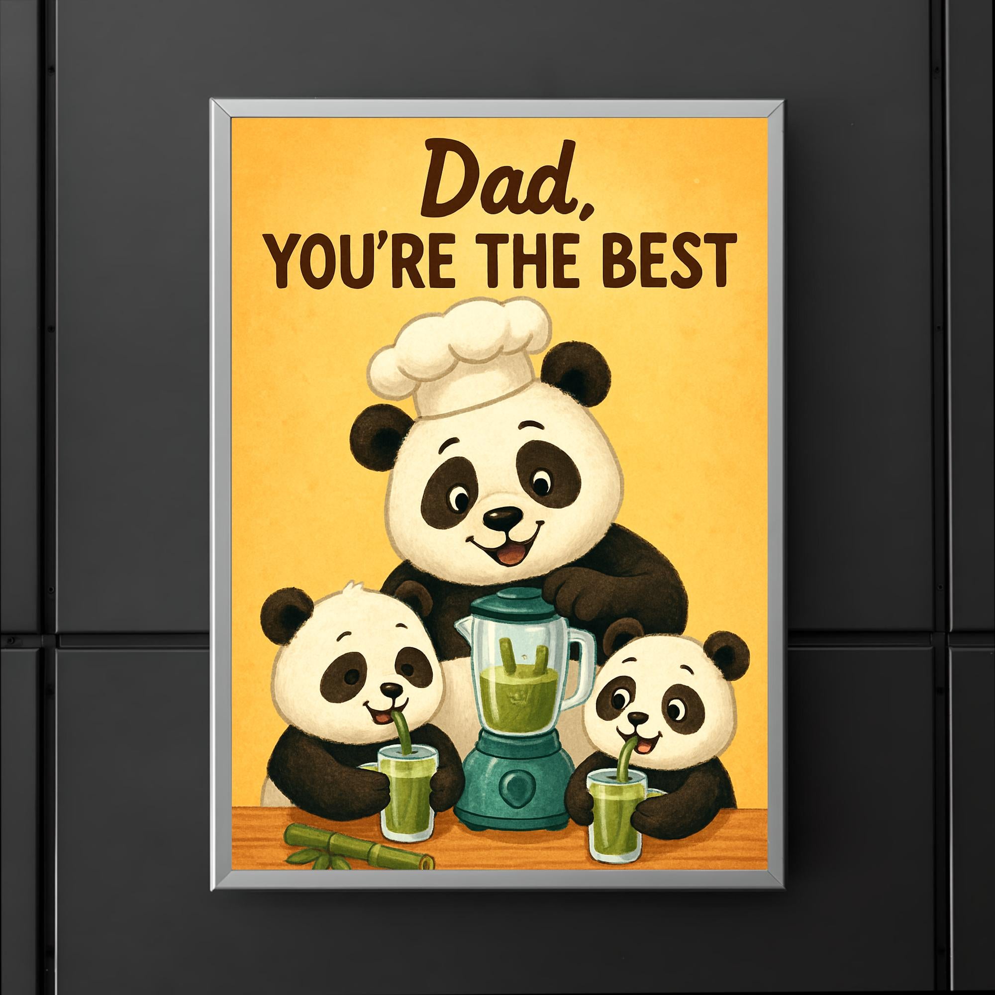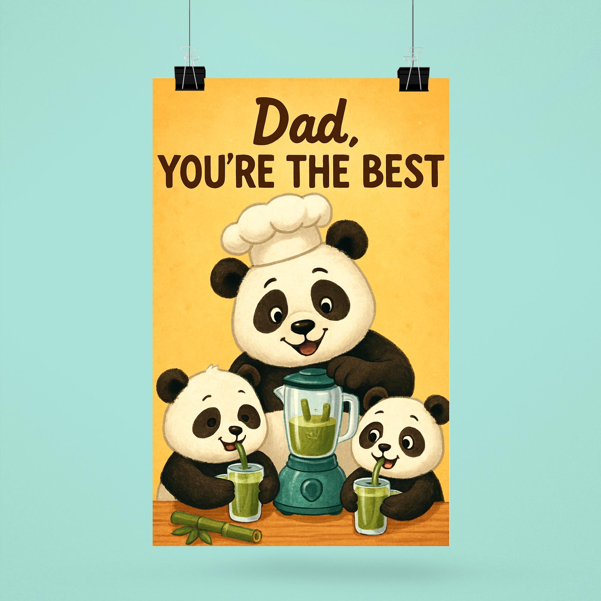 Celebrate Dad’s special day with a dash of humor and heart! This charming poster features a playful panda donning a chef’s hat, whipping up bamboo smoothies for his cubs—perfectly capturing the fun and loving spirit of fatherhood. A delightful gift to remind Dad he’s truly the best!