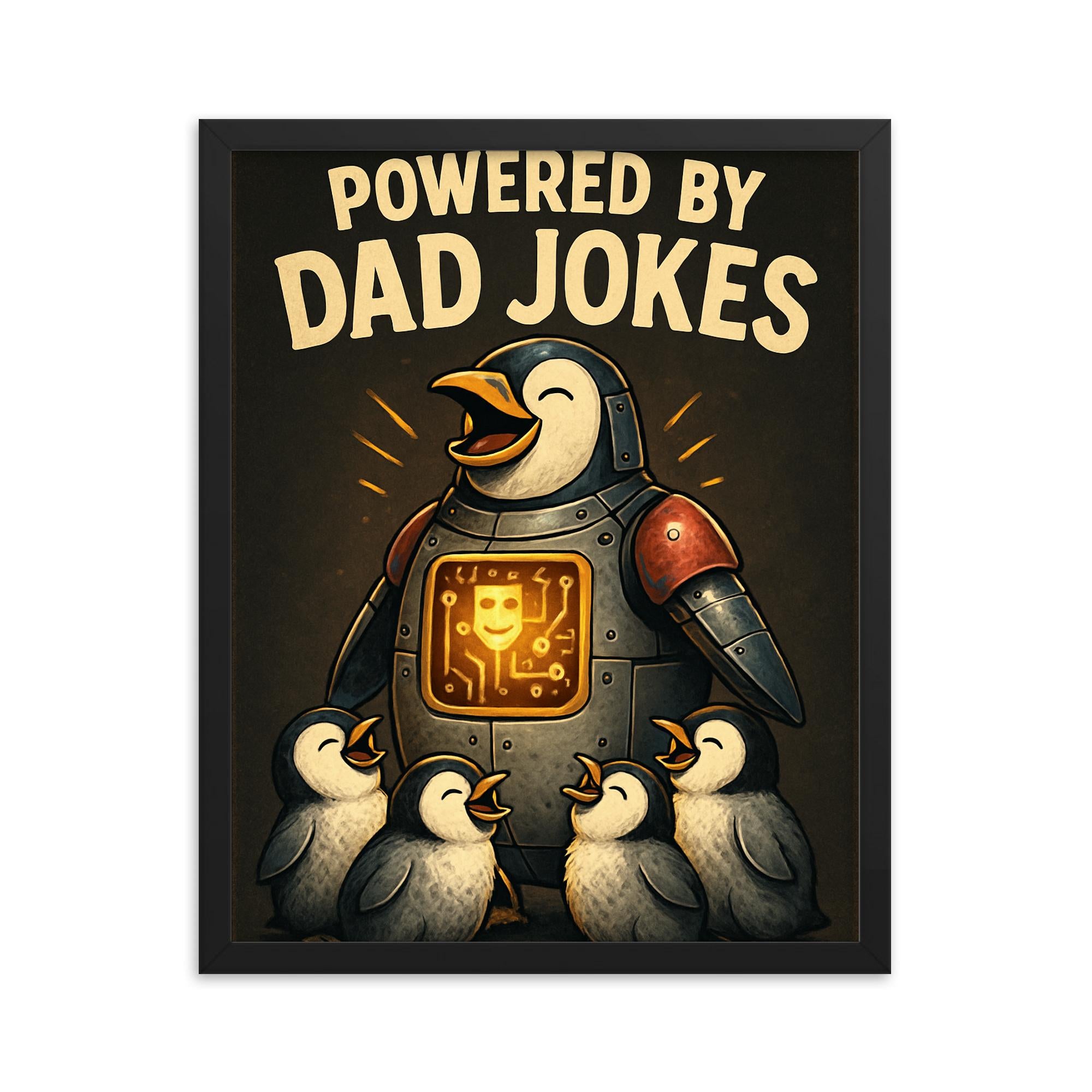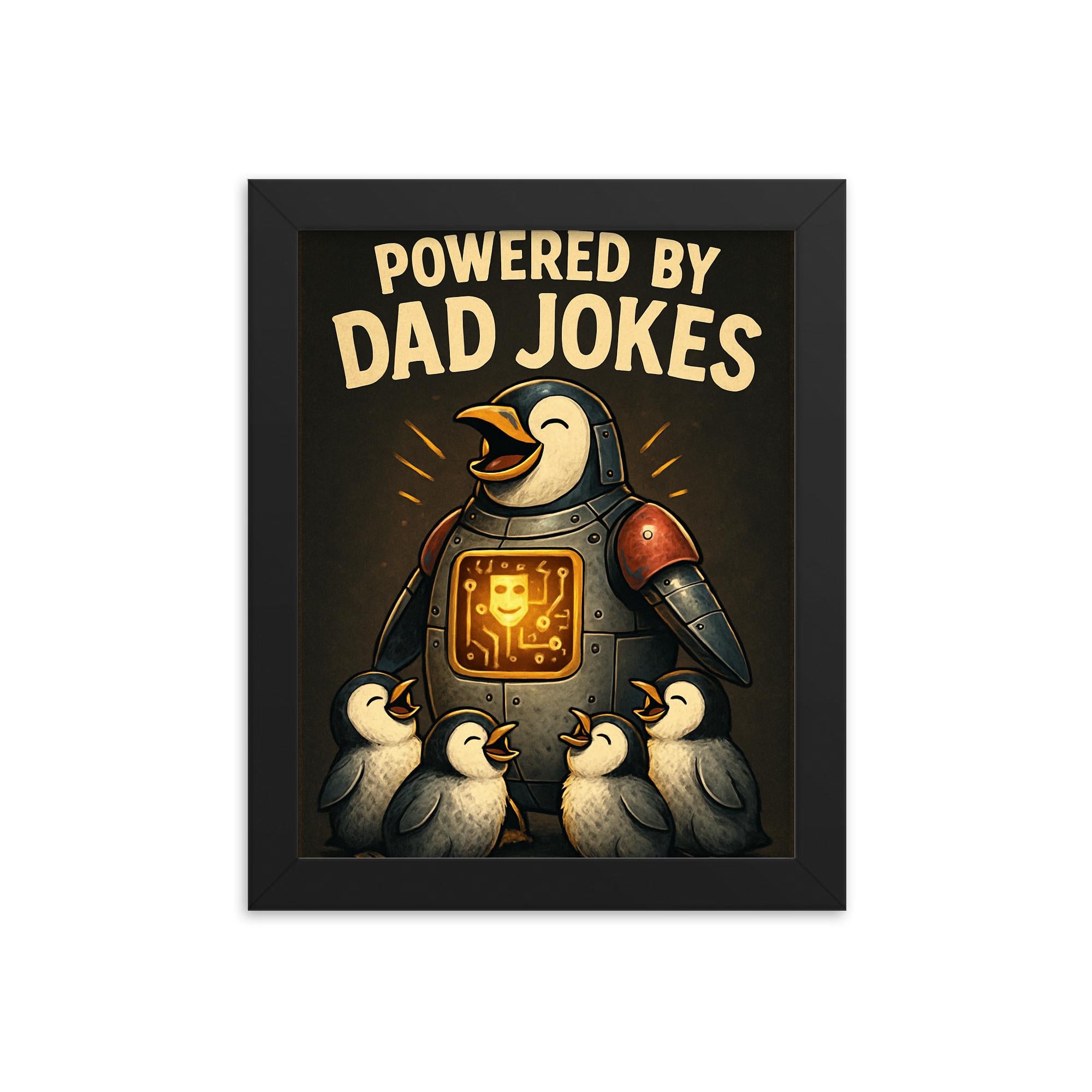 Bring a burst of laughter and a touch of engineering magic to any space with our exclusive *Powered By Dad Jokes* Framed Mechanical Penguin Print – the ultimate Father’s Day gift that goes beyond the ordinary.