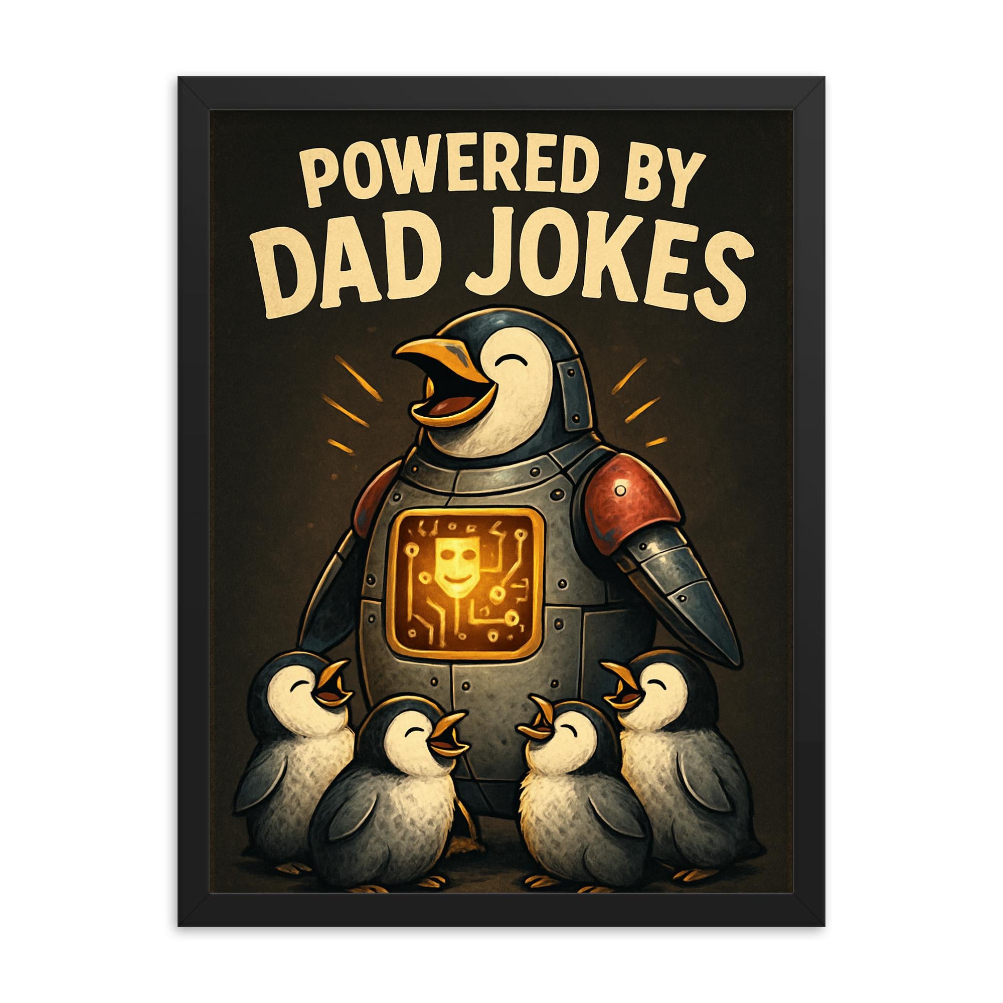Showcasing a delightfully witty quote and a charming scene of a mechanical penguin with comedy circuits lighting up while adorable baby penguins laugh, this wall art is designed to make dads (and everyone else) smile every time they walk into the room.