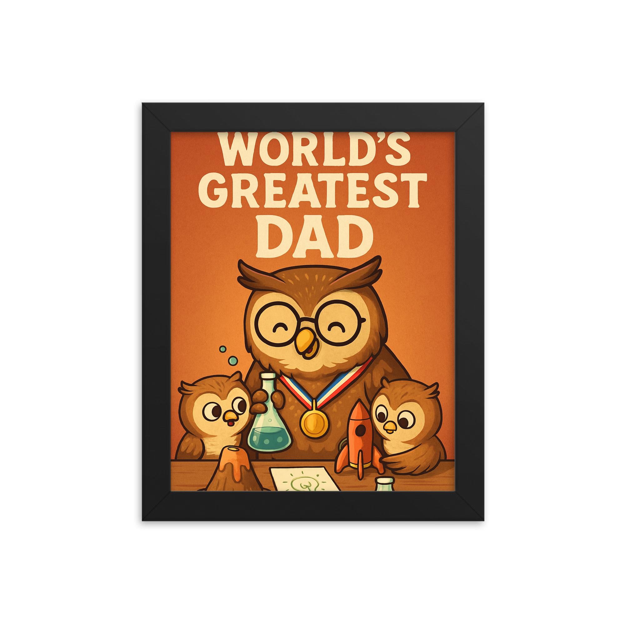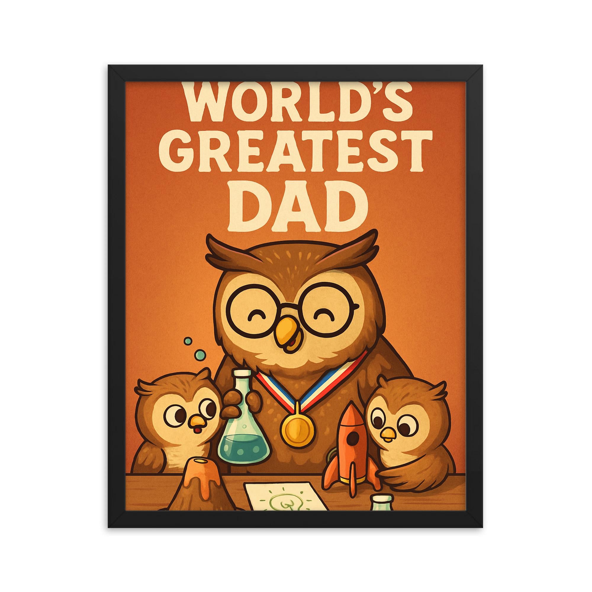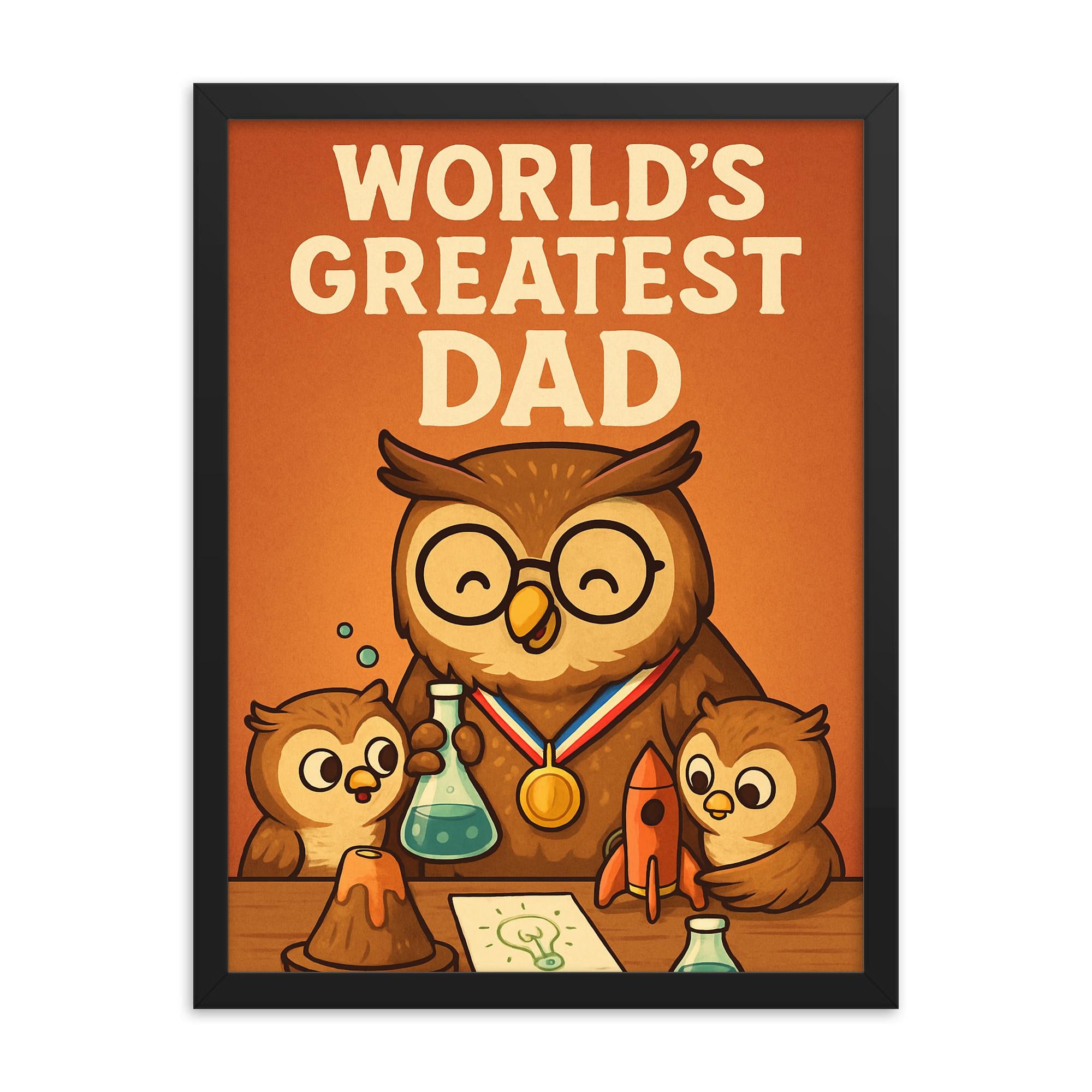 World’s Greatest Dad Owl Framed Print – Funny Science Project Wall Art, Cute Father’s Day Gift, Medal Winner Owlet Poster Decor