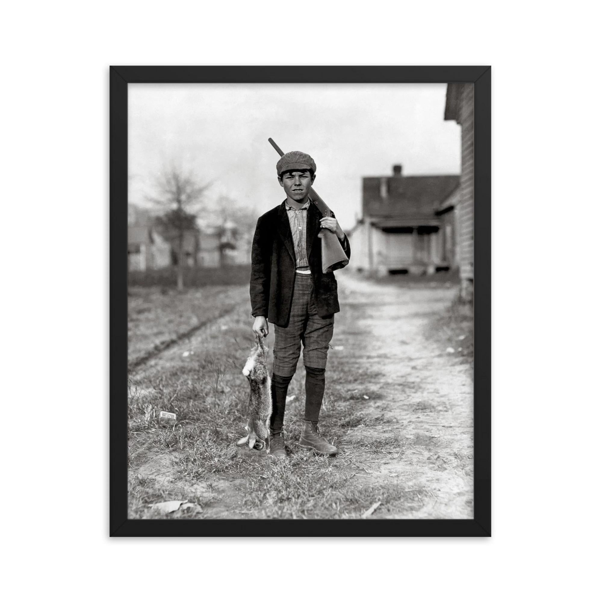 Step back in time with this stunning framed print of "Rabbit Hunting - A boy returns home from rabbit hunting, Dillon, South Carolina, 1909"
