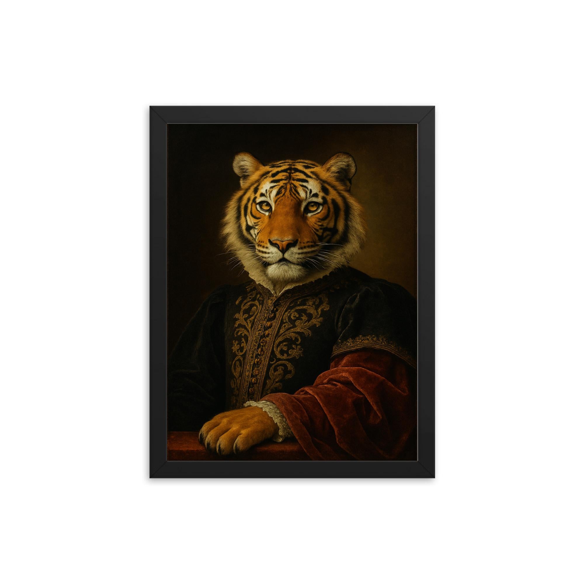 Elevate your living space with this striking framed print featuring a regal portrait of a tiger adorned in elegant Renaissance-style dress.