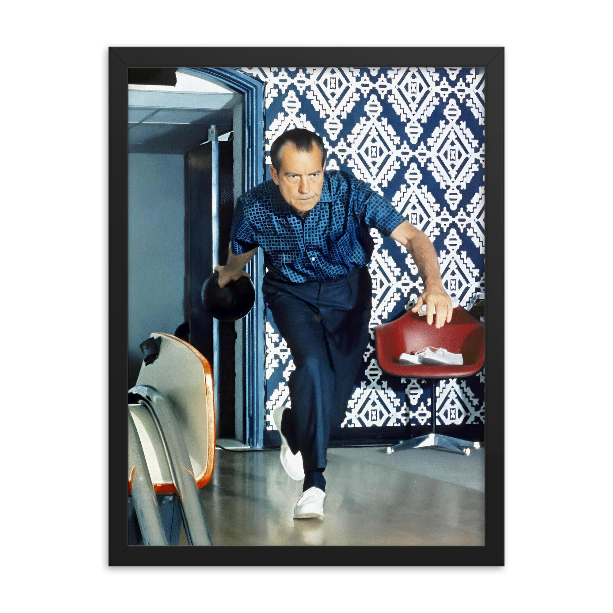 Step into a one-of-a-kind moment in American history with our exclusive framed print of Richard Nixon bowling—a truly unexpected and memorable art piece destined to become the most talked-about addition to your decor.