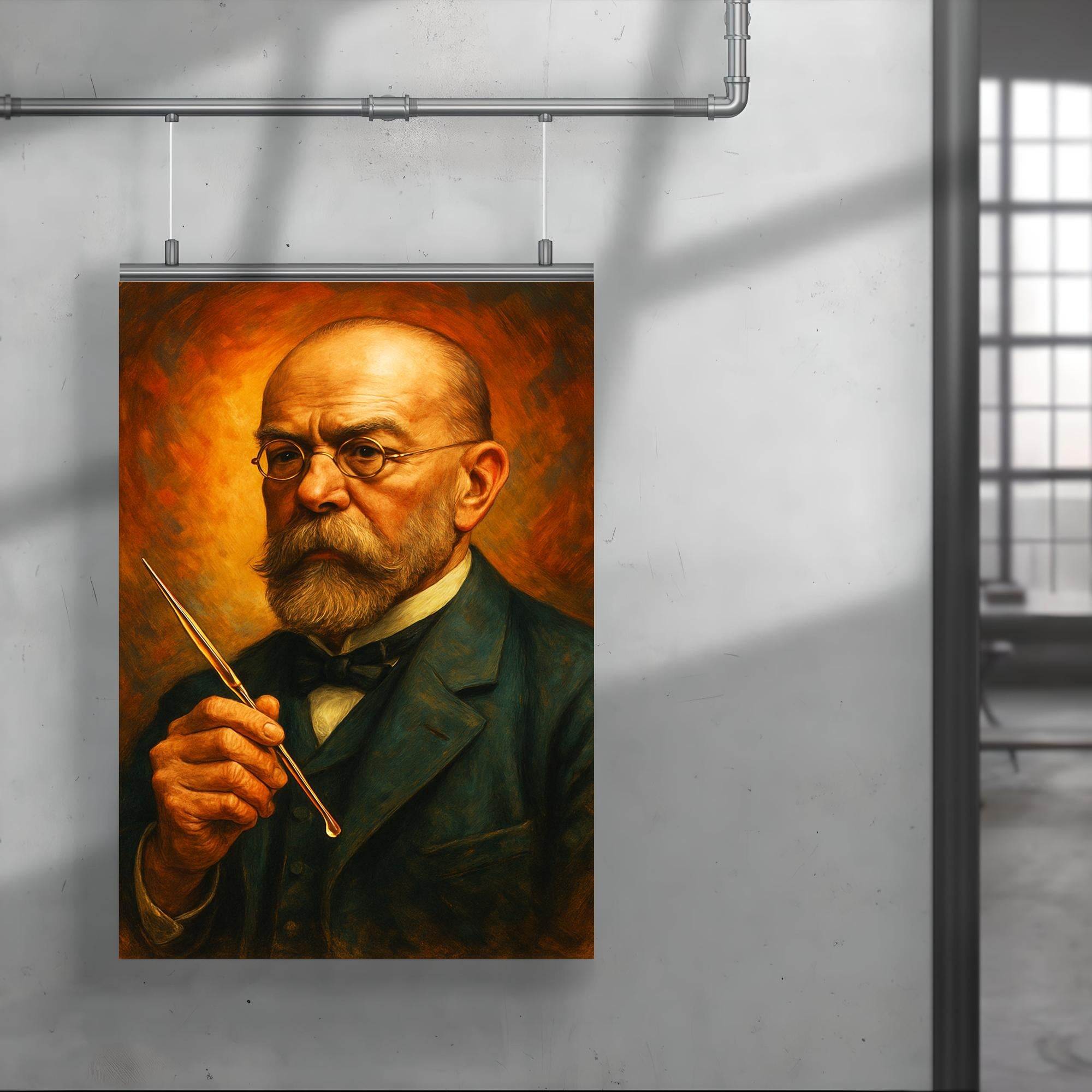 Celebrate the legacy of Robert Koch, a pioneer in medical microbiology, with this striking poster. Perfect for inspiring scientists, students, and history enthusiasts alike, it pays tribute to the man whose discoveries revolutionized our understanding of infectious diseases. Elevate any space with a timeless homage to a true visionary in science.