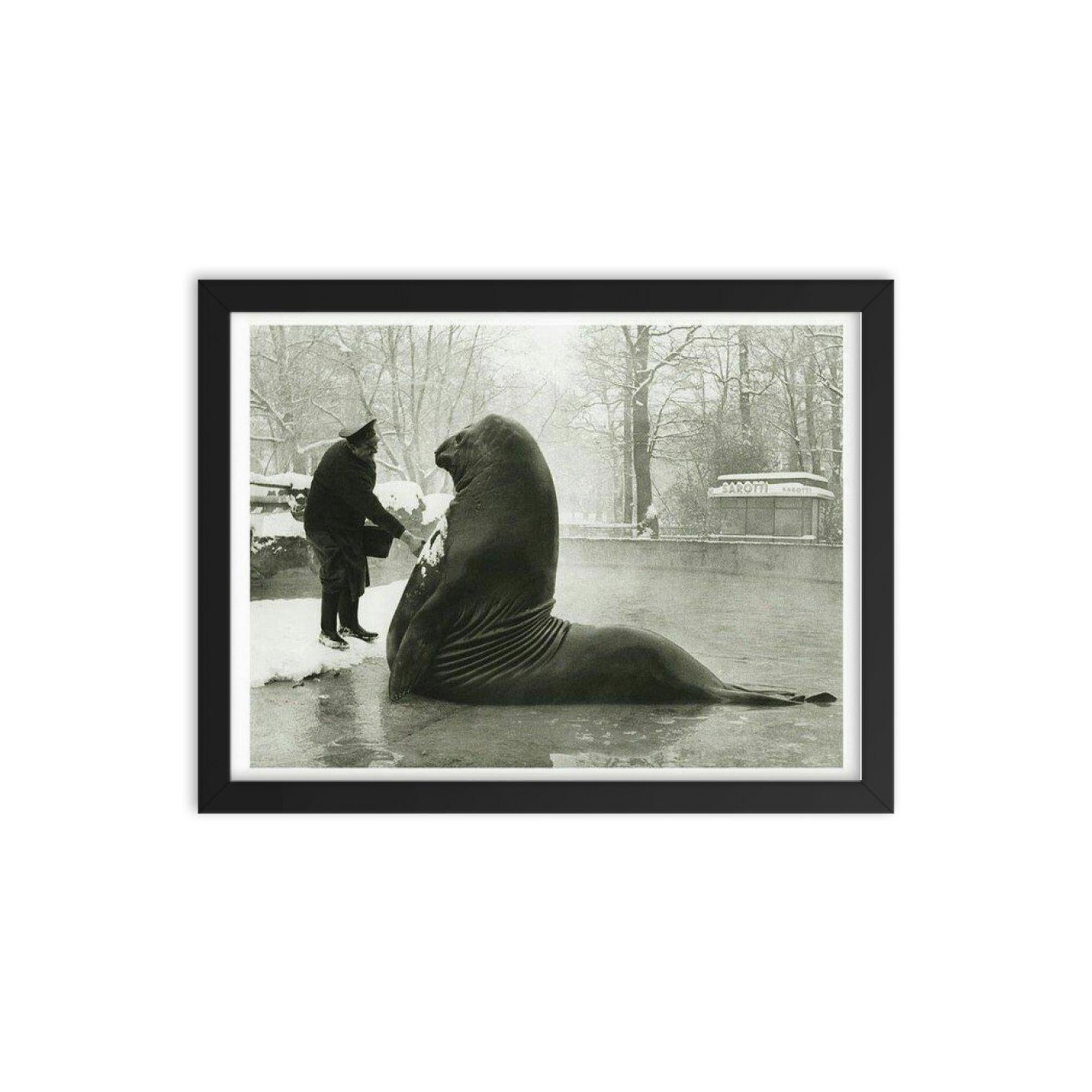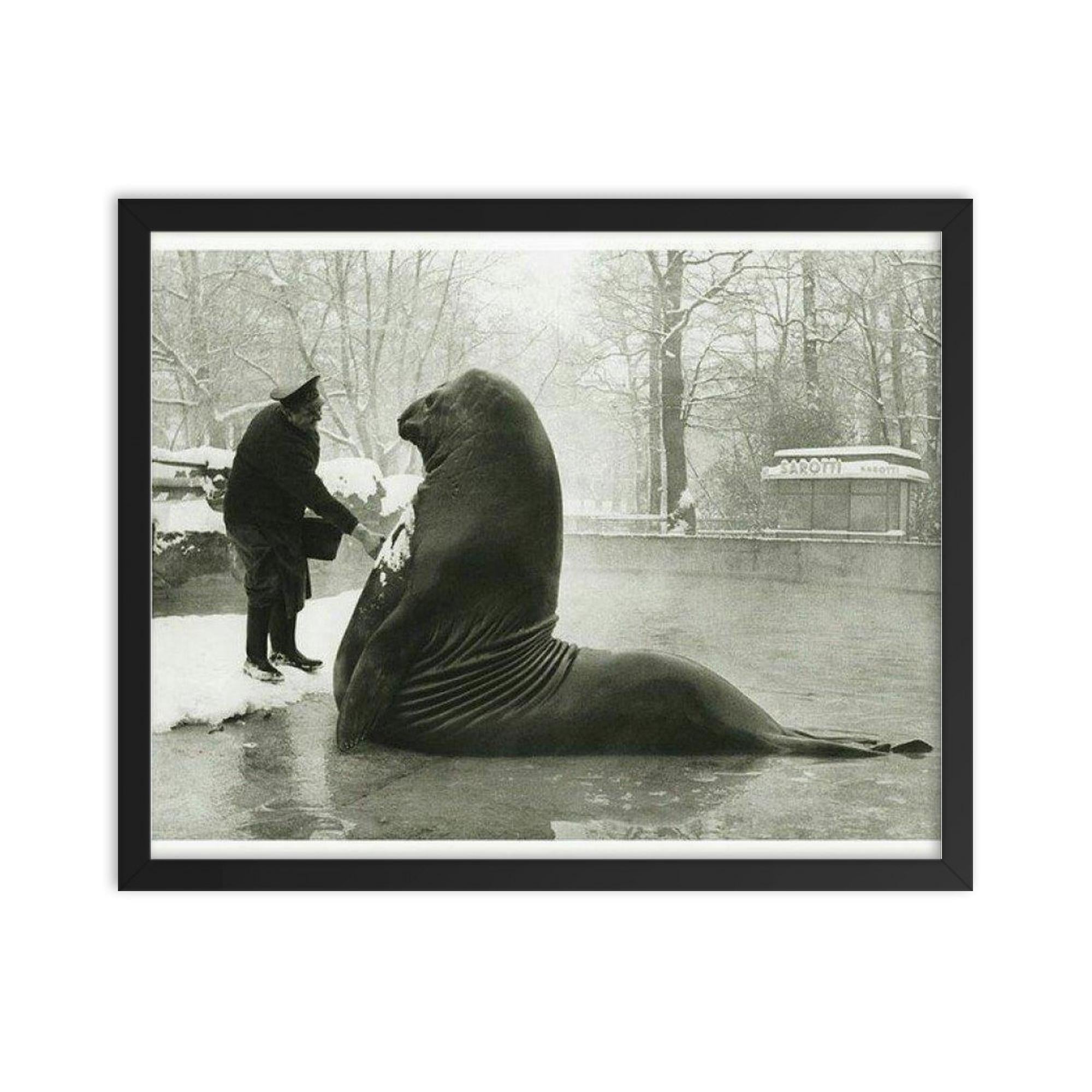 Transform your space with a timeless glimpse into Berlin Zoo’s past—order your framed Roland the Elephant Seal snow bath print today and bring a piece of the extraordinary into your everyday life.