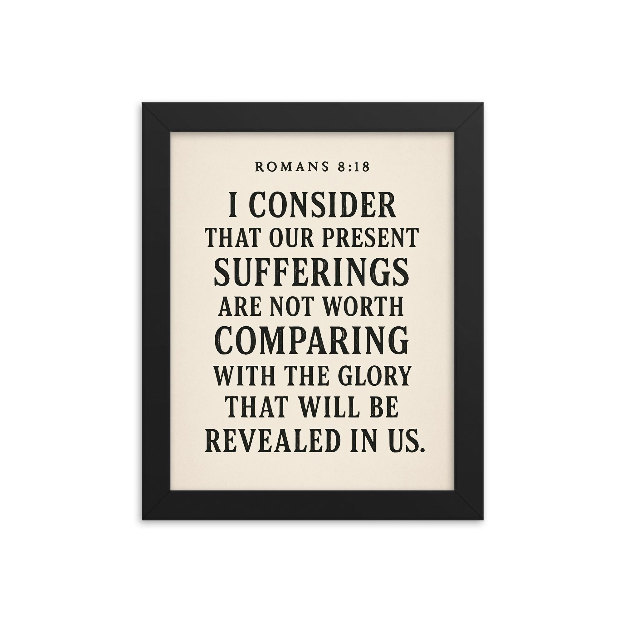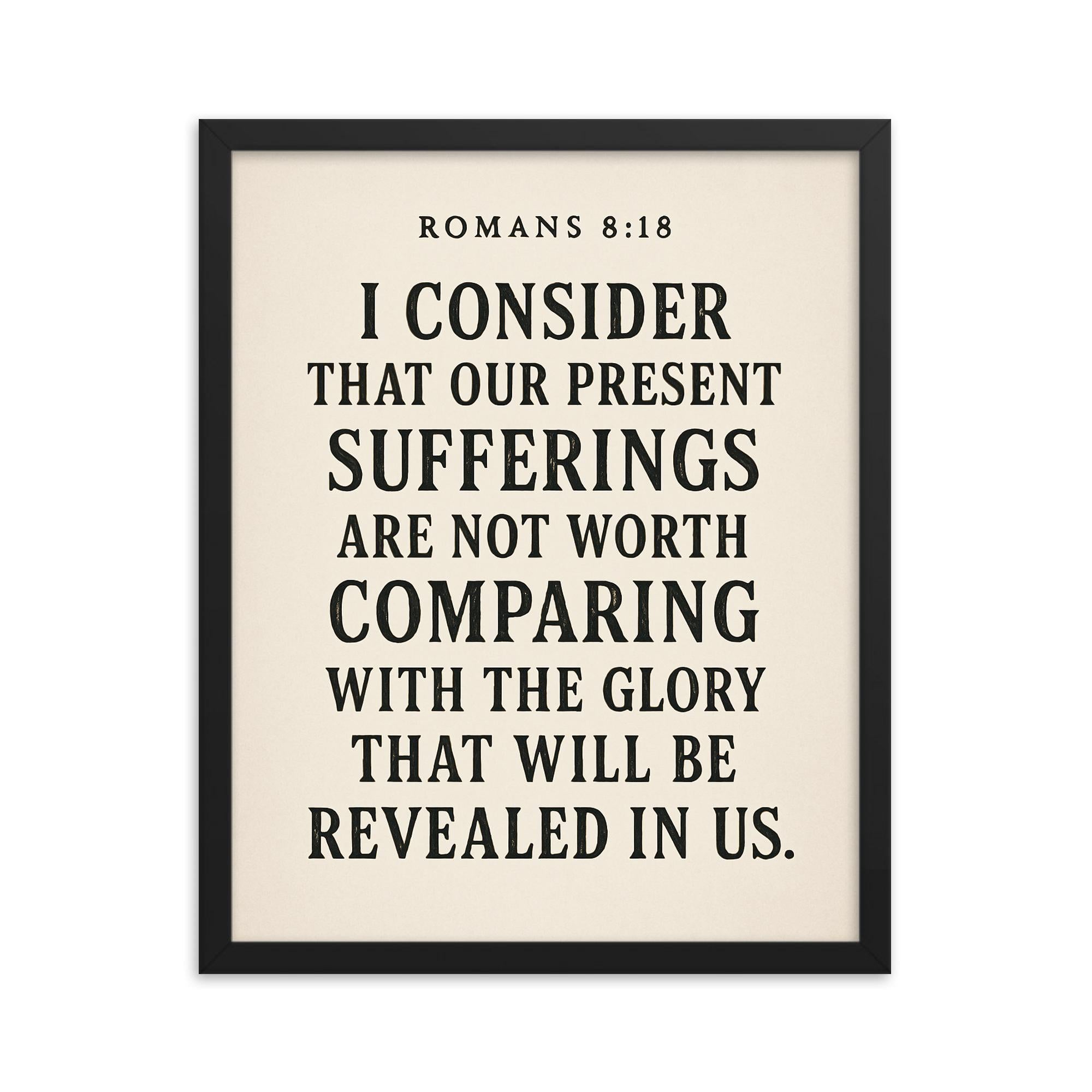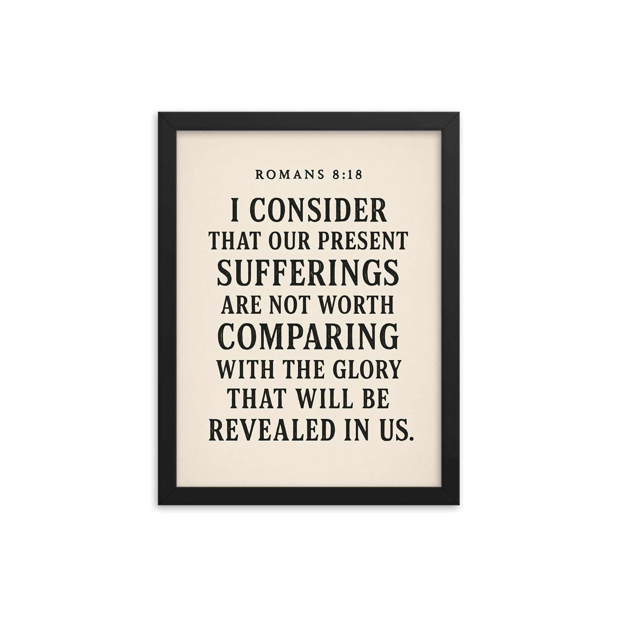 This beautifully crafted framed print features the powerful message from Romans 8:18 I consider that our present sufferings are not worth comparing with the glory that will be revealed in us