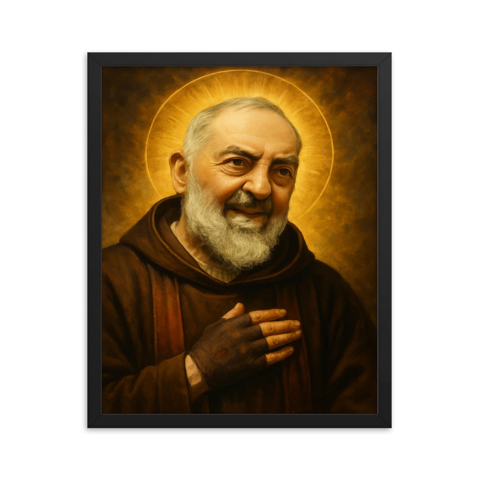 Elevate your space with this stunning framed print of Saint Padre Pio, a perfect blend of elegance and artistry for any wall.