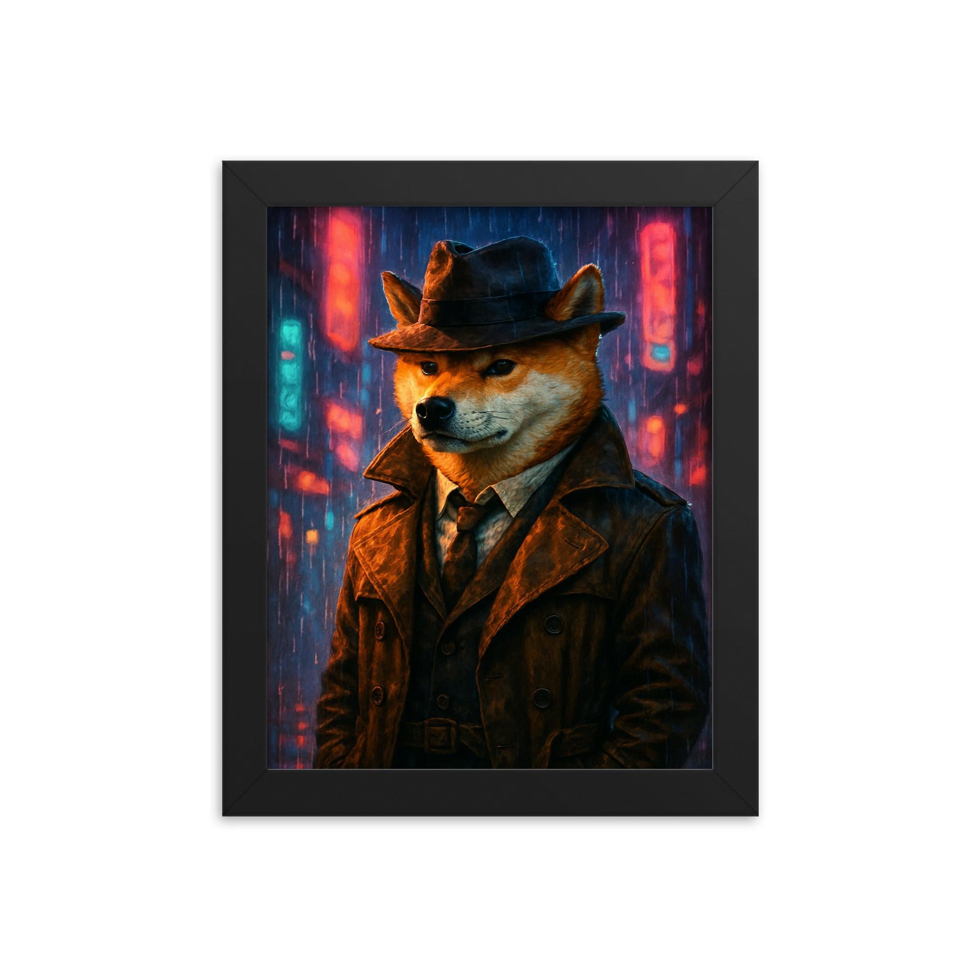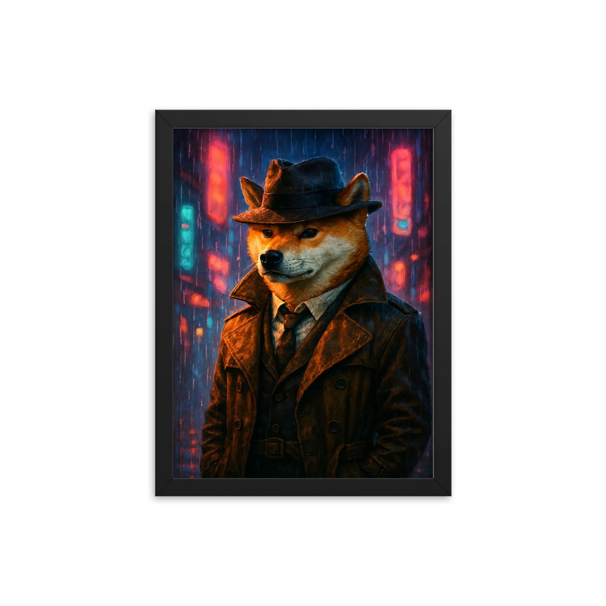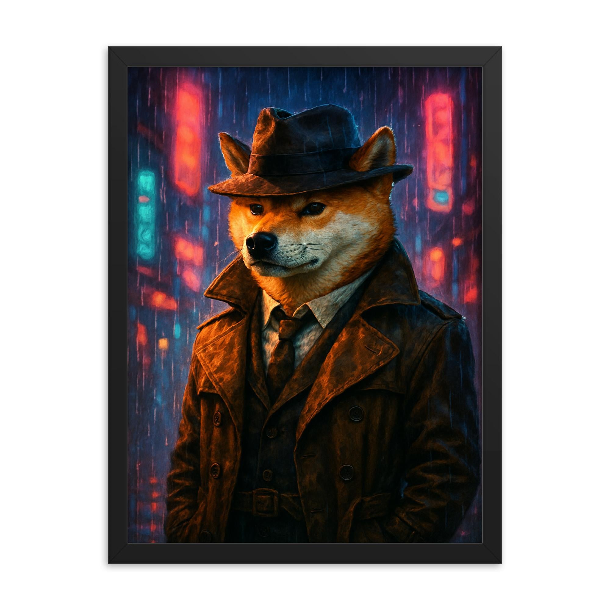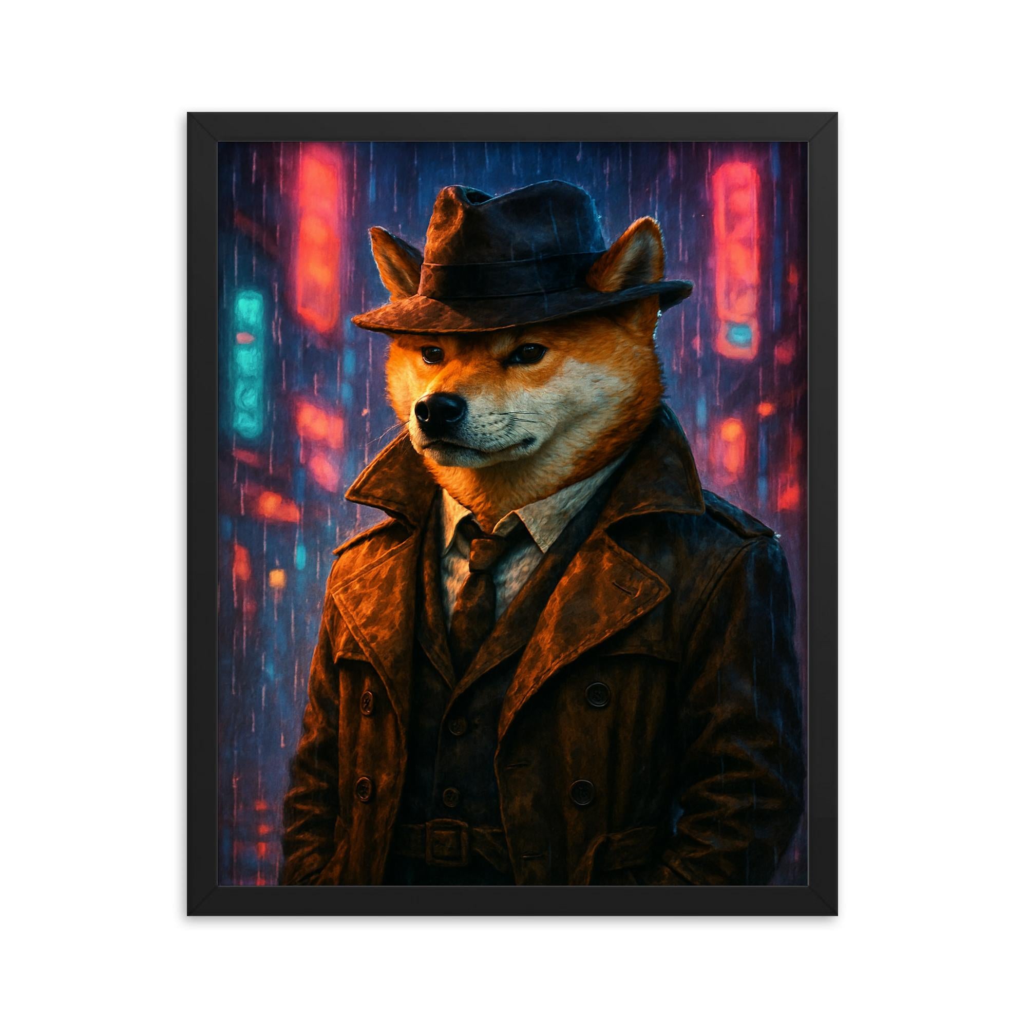 Elevate your space with this striking framed print of a Shiba Inu hard boiled detective in trench coat beneath neon rain—a captivating blend of mystery and modern style that commands attention.