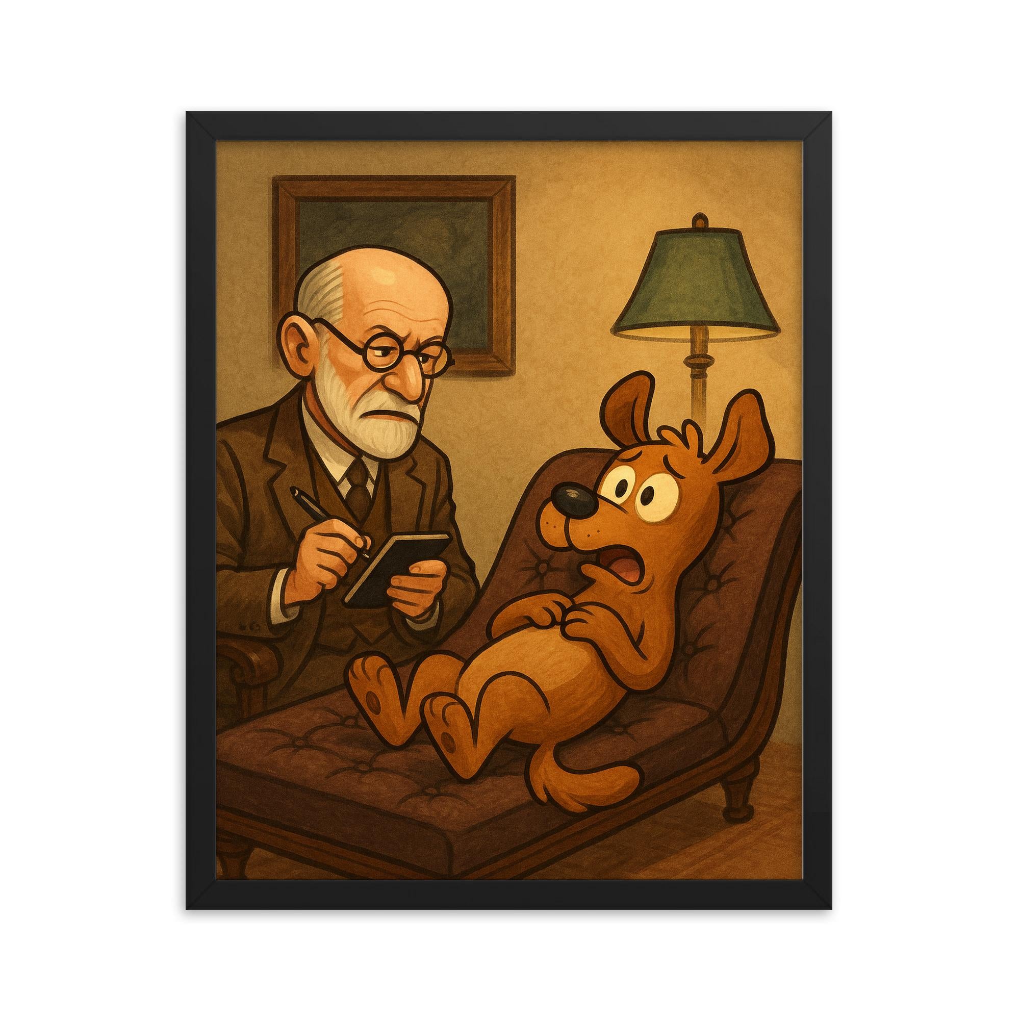 This unique piece of wall art is more than decoration—it’s a conversation starter that blends classic psychology with playful charm, perfect for anyone who appreciates clever humor and timeless figures. Whether you’re a fan of Freud’s pioneering work, a dog lover, or simply love quirky, thought-provoking art, this framed print will spark smiles and intrigue every time it's admired.