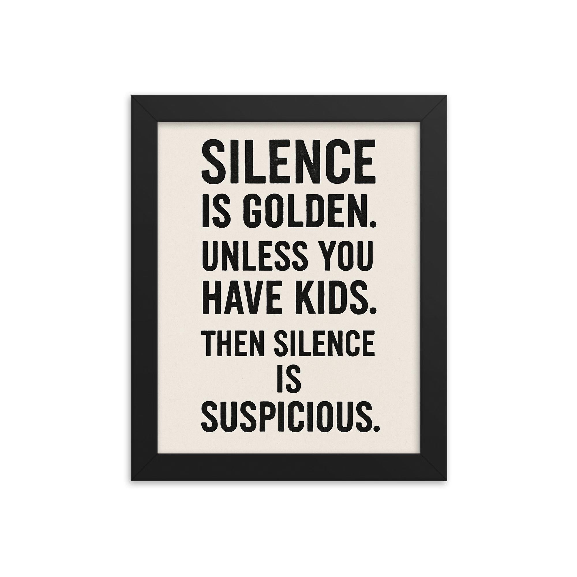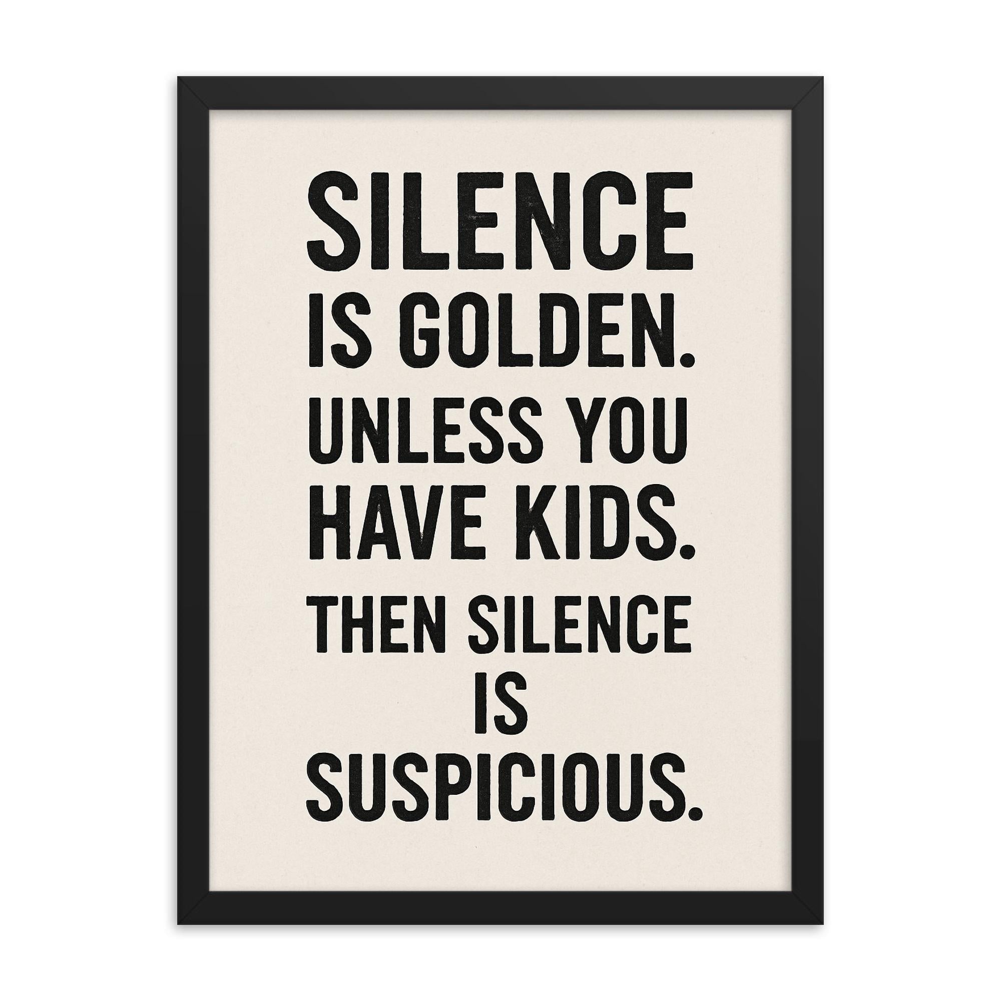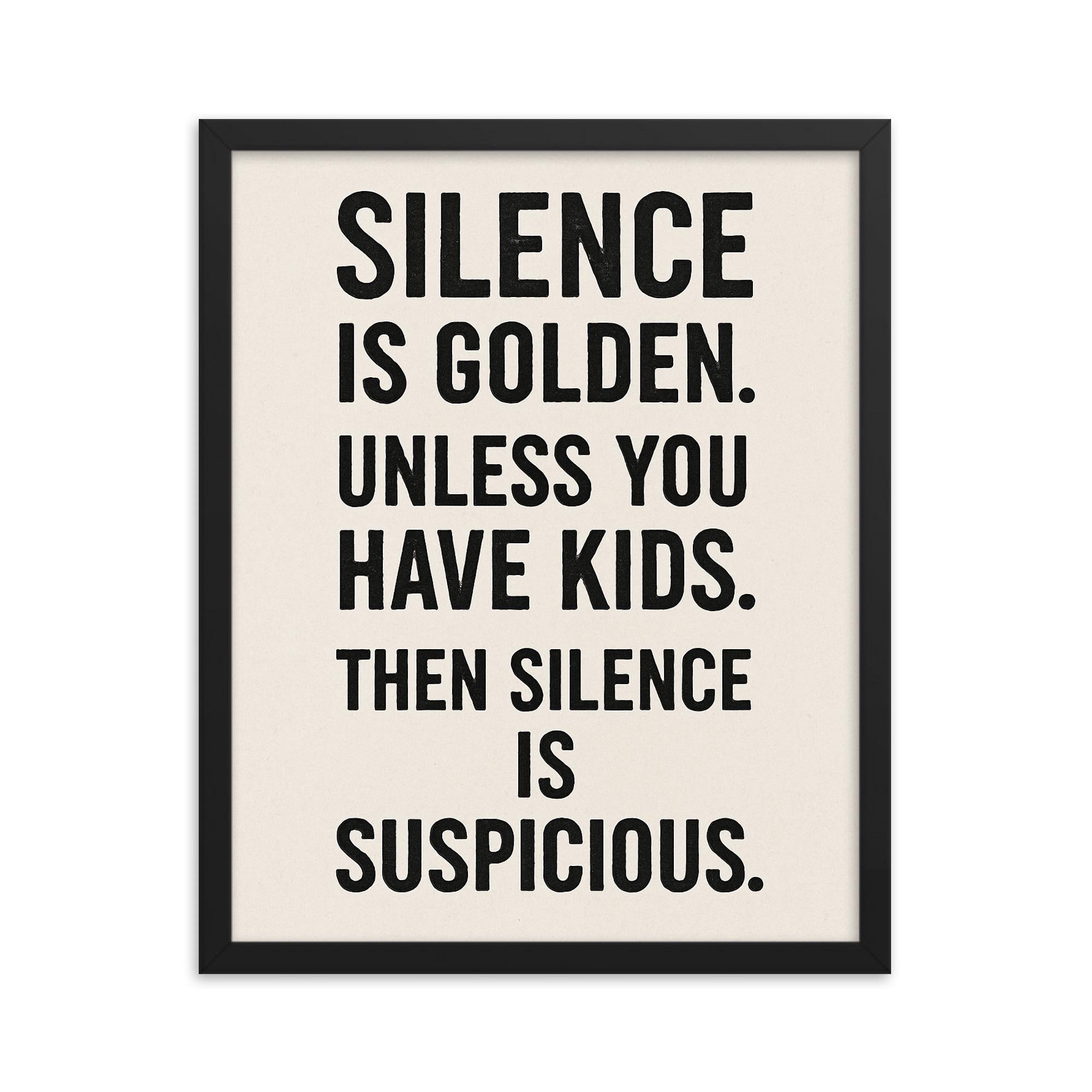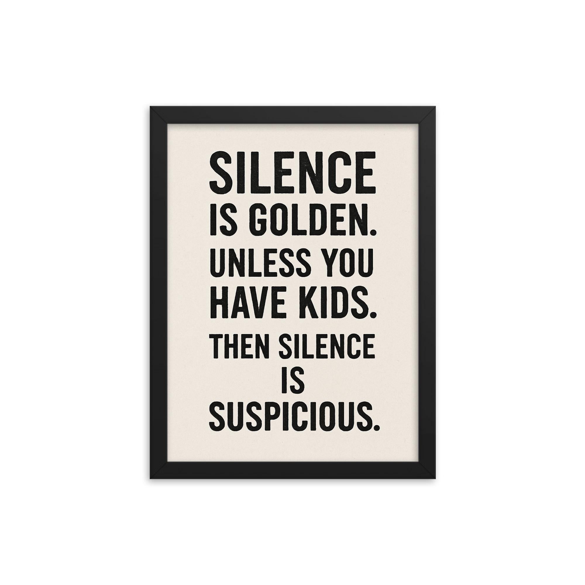 Add a touch of humor and real-life wisdom to your home with our framed wall art: Silence is golden Unless you have kids Then silence is suspicious.