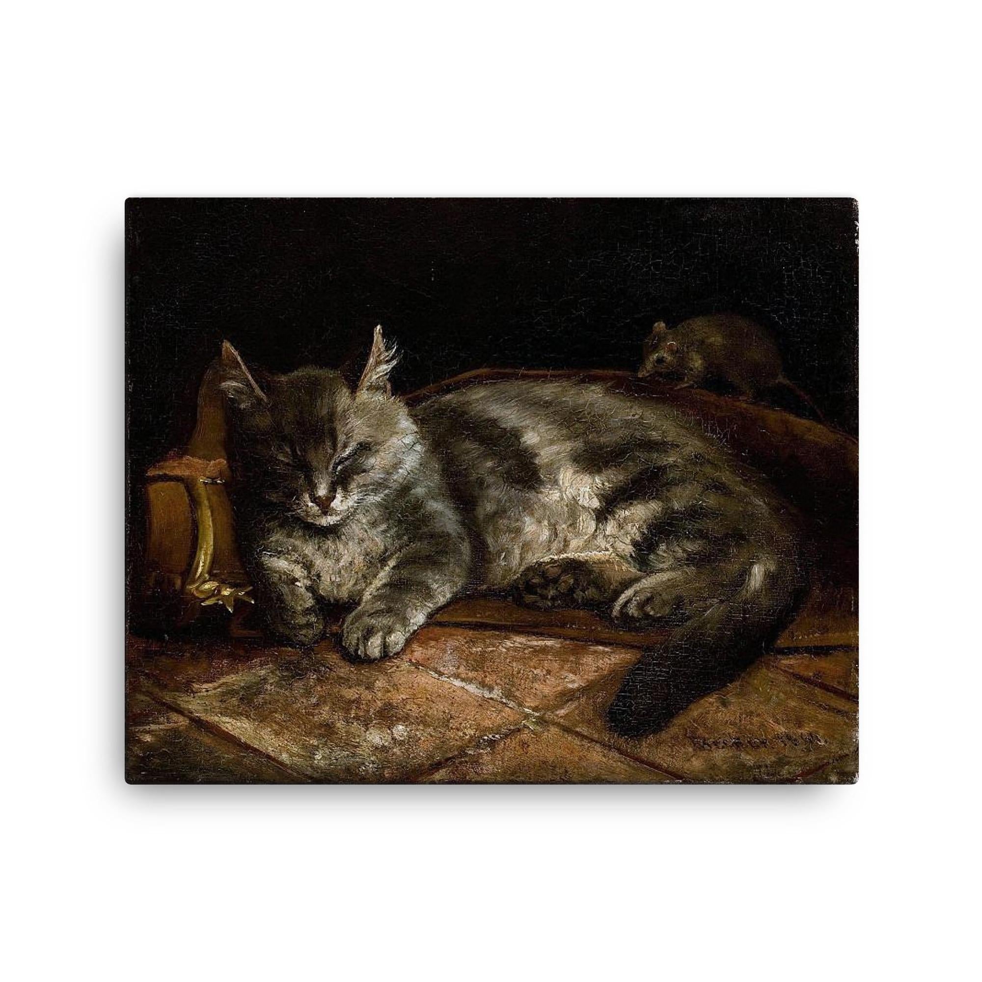 Transform your space with timeless charm through this exquisite canvas print of "Sleeping Grey Cat and a Rat" by Adolf von Becker.
